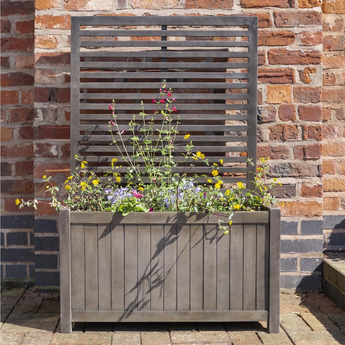 Dimensions H120cm x W80cm x D43.5cm Please note We are unable to deliver to Ireland This Alderley Rectangular Planter and; Trellis is simple great addition to any garden offering space for climbing vines. It offers support your climbing plants and creates a wonderful backdrop to any patio or balcony. Features. Hardwood timber construction. Pre-painted in a contemporary grey wash. Durable lacquer finish. Trellis ideal for climbing plants. Approx. capacity 100 Litres Assembly not required.