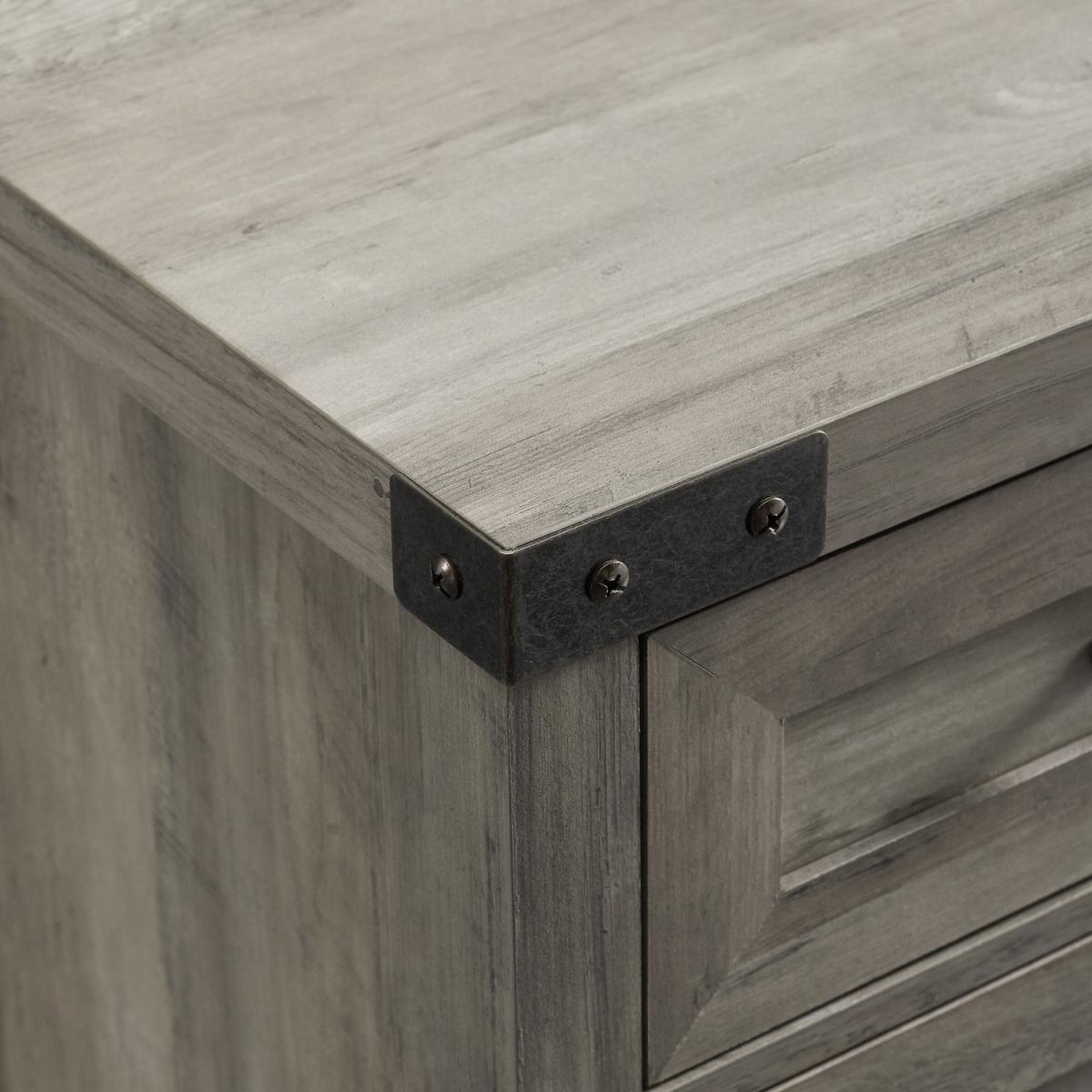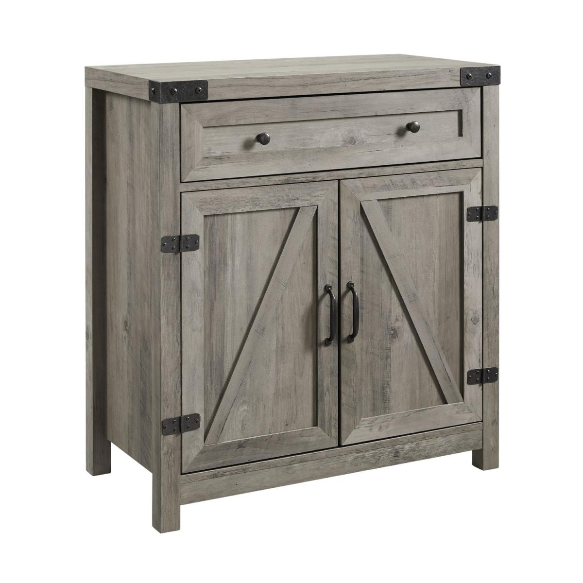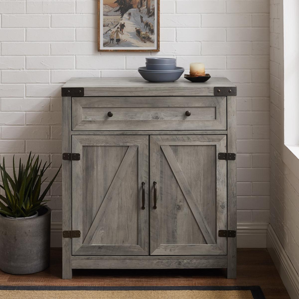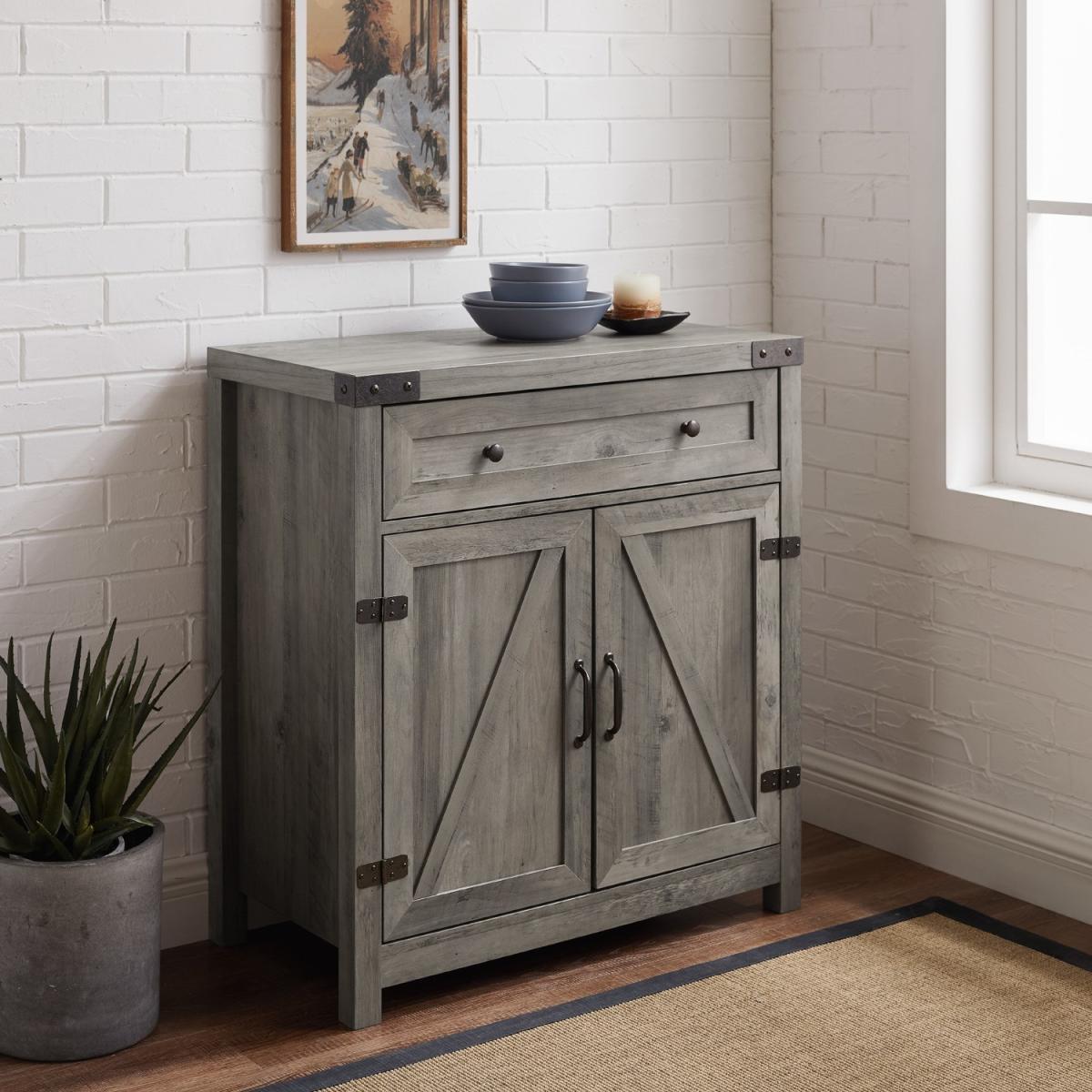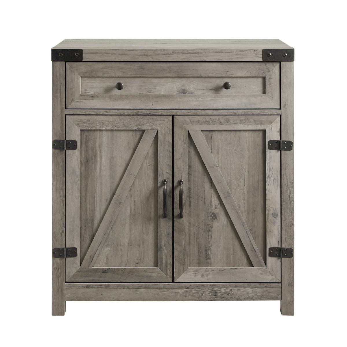 This grey wash sideboard has plenty of storage options since it comes with two-doors and a drawer with telescoping metal drawer glides. Behind the doors there is an adjustable shelf. The exposed hardware and handles feature an antique bronze metal finish that enhance the rustic tone of this storage unit.