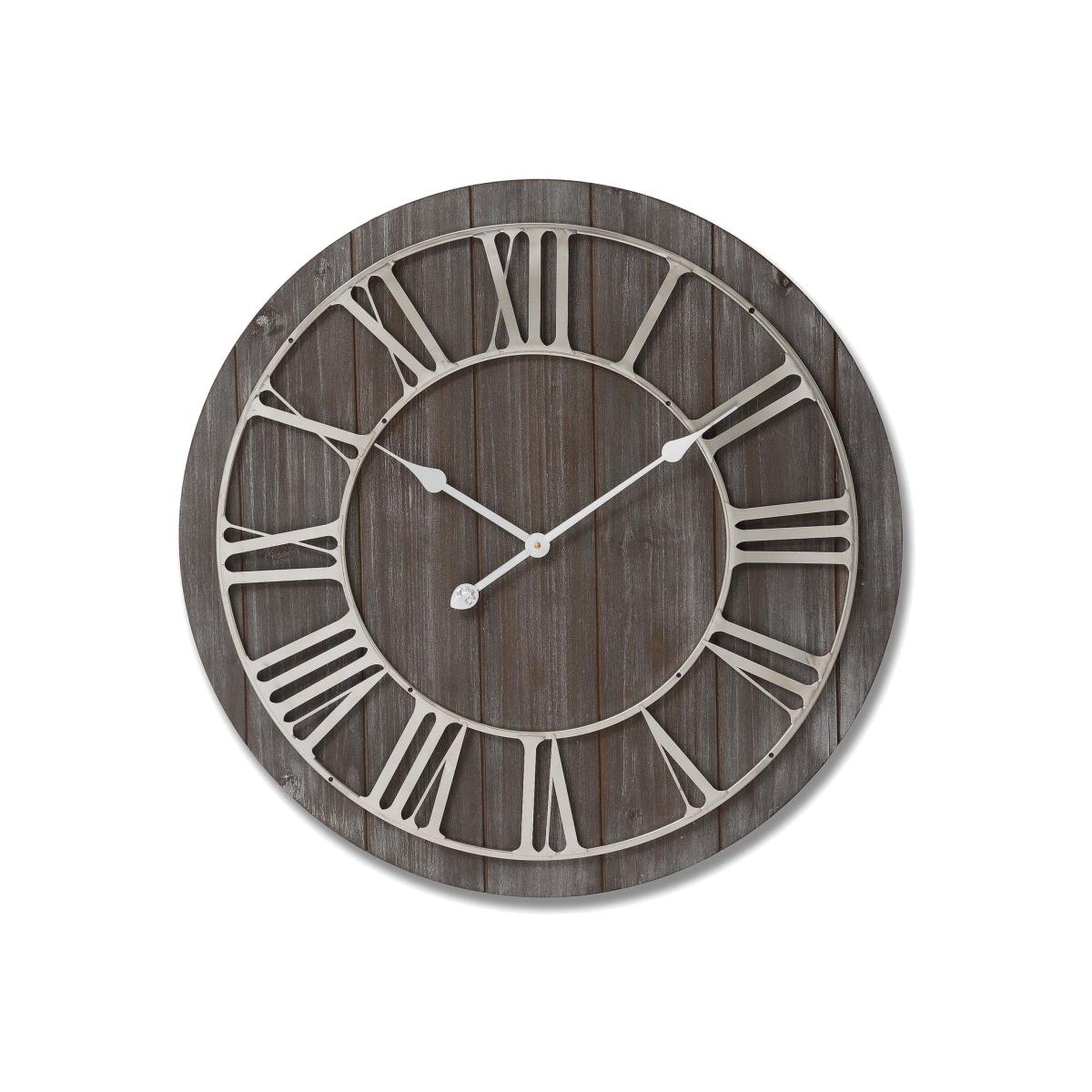 Dimensions 68 H x 68 W x 4. L cm. This wooden clock with dark washed wood finish and contrasting nickel detail adds a stylish feature to any home. Features. Contemporary design softened by grey wash wood Hand crafted. Stylish and elegant design. Contrasting nickel effect watch face and hands. No assembly required...