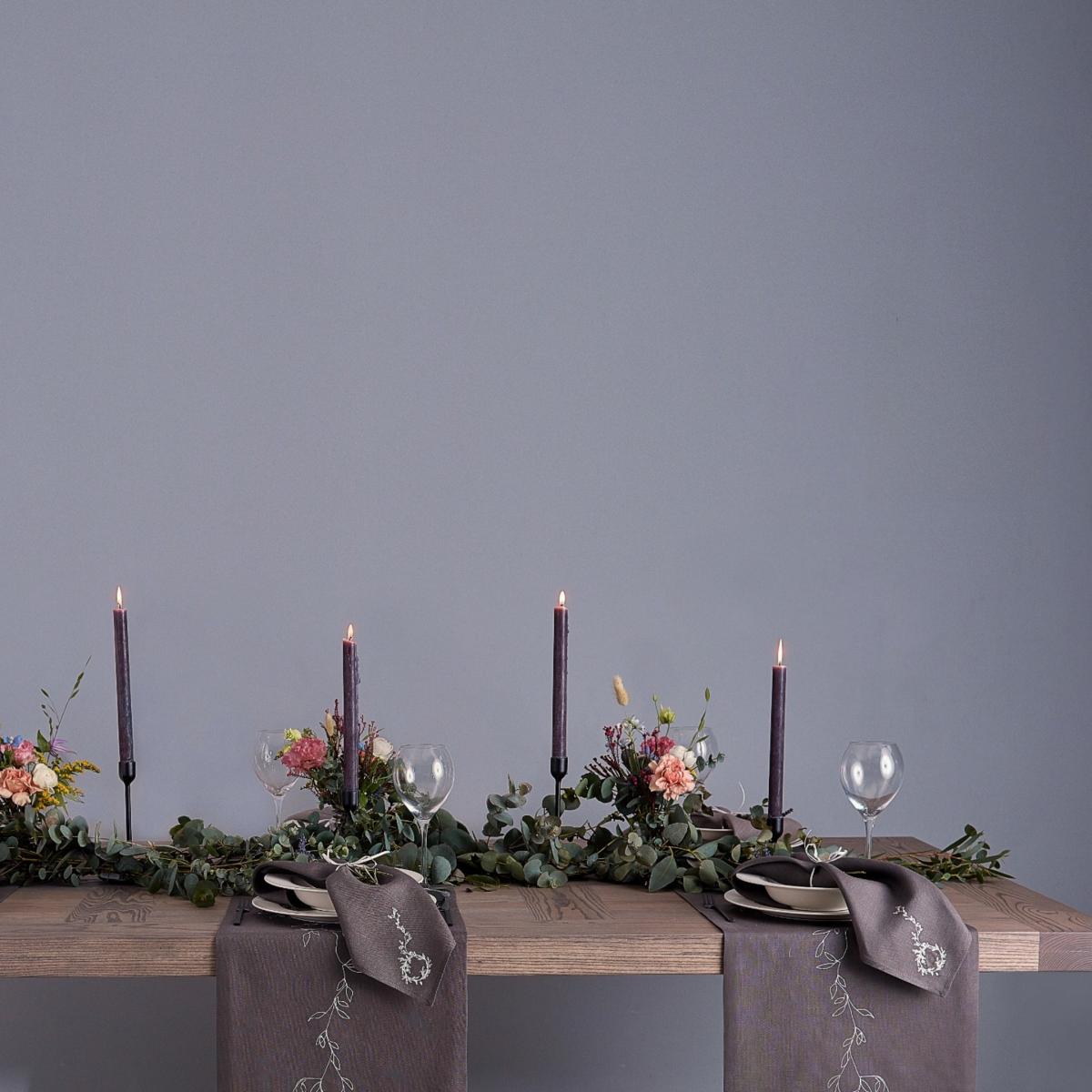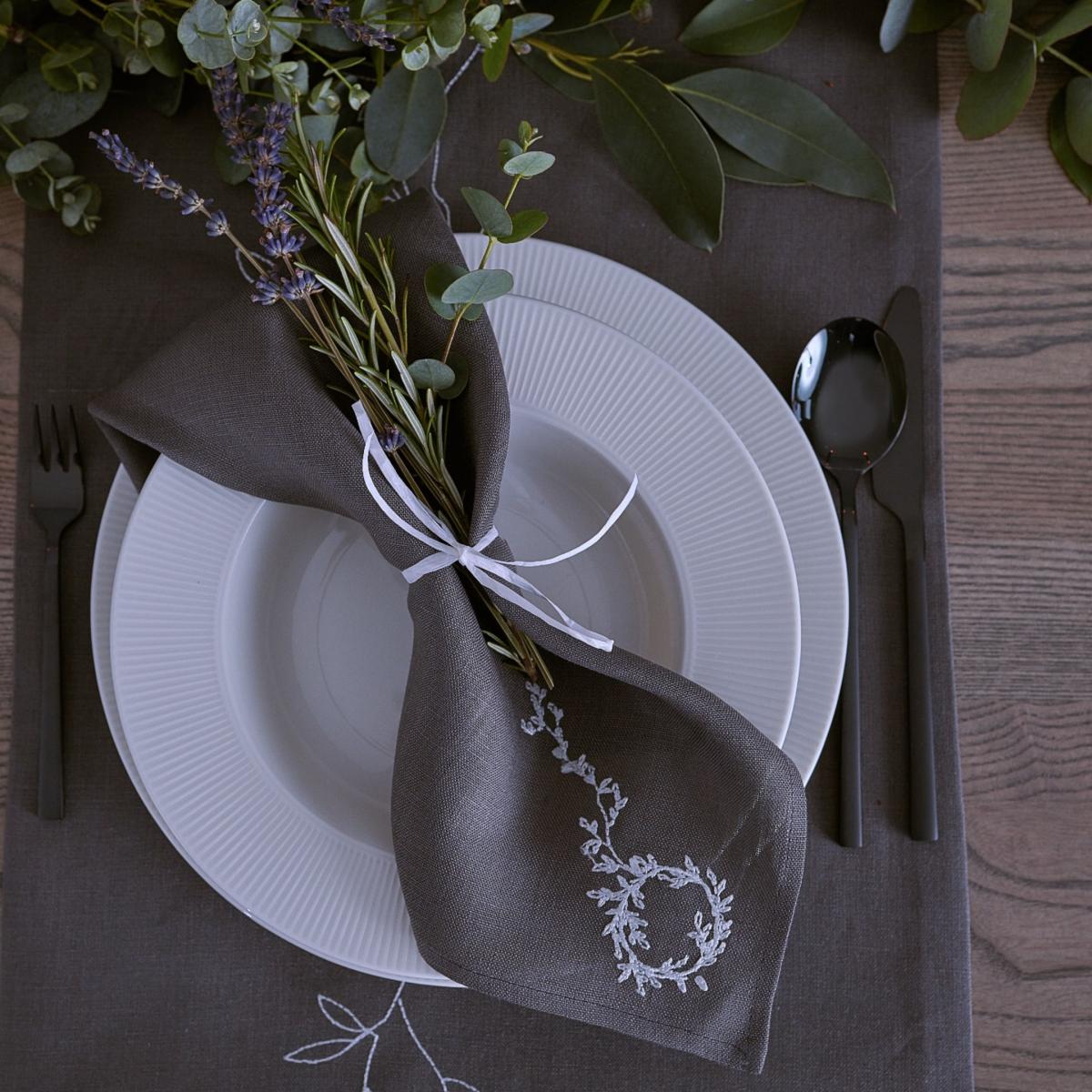 Wreath Embroidered Irish Linen Tablerunner in Grey with Silver embroidery.