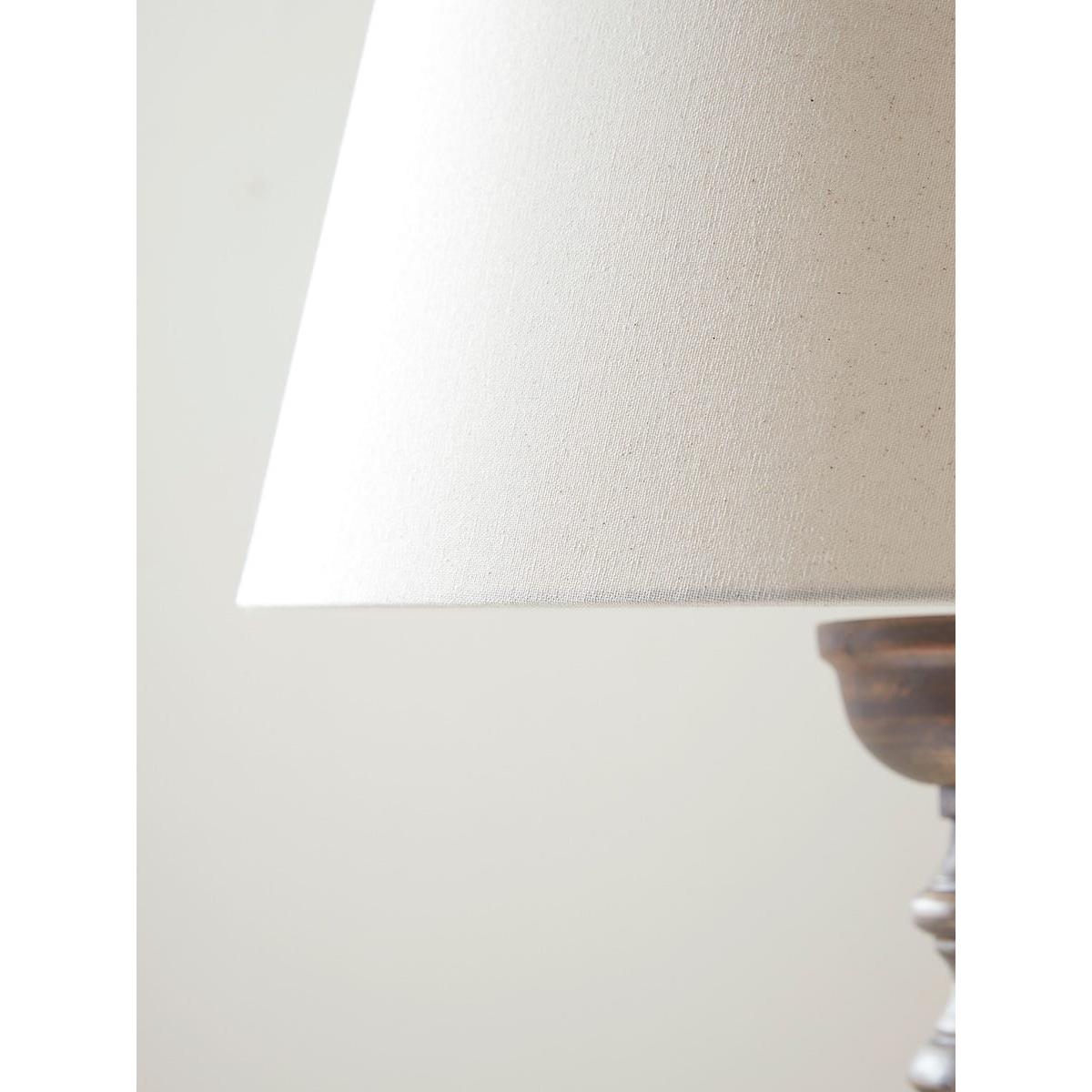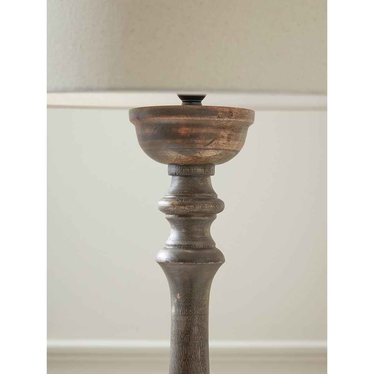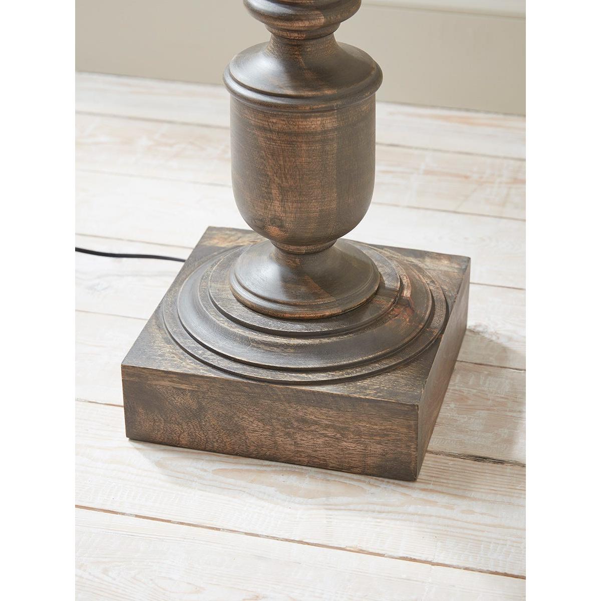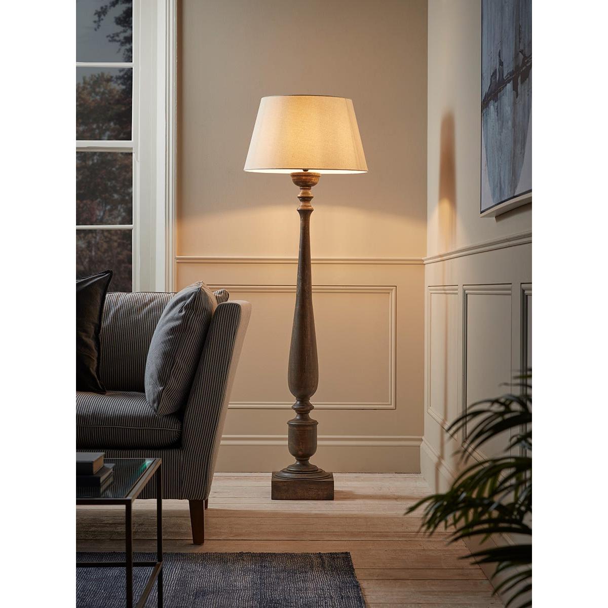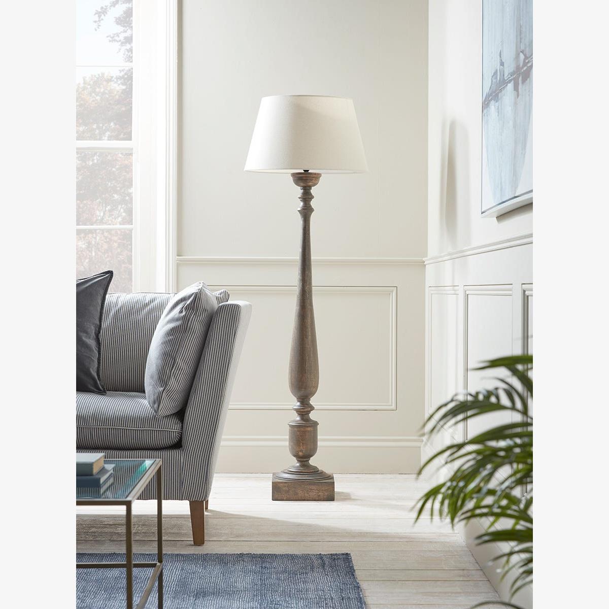A beautifully turned wooden base gives this floor lamp its classic styling, creating an elegant undulating silhouette, perfectly balanced by the gently tapered calico shade. The greywash finish to the mango wood softens the formality of the design. Pair with your comfiest armchair to create an enviably cosy reading nook, or position to illuminate a darker corner to maximise the illusion of space in any room. Complete your interior with the matching table lamp.