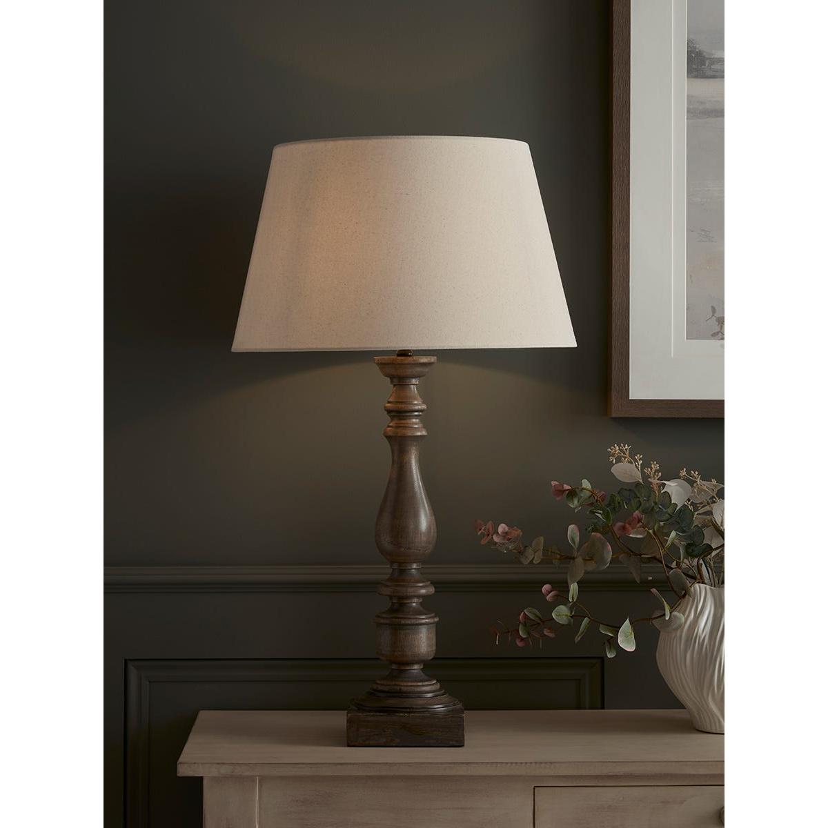 A beautifully turned wooden base gives this table lamp its classic good looks, which are perfectly balanced by the gently tapered calico shade. Complete your interior with the matching floor lamp.