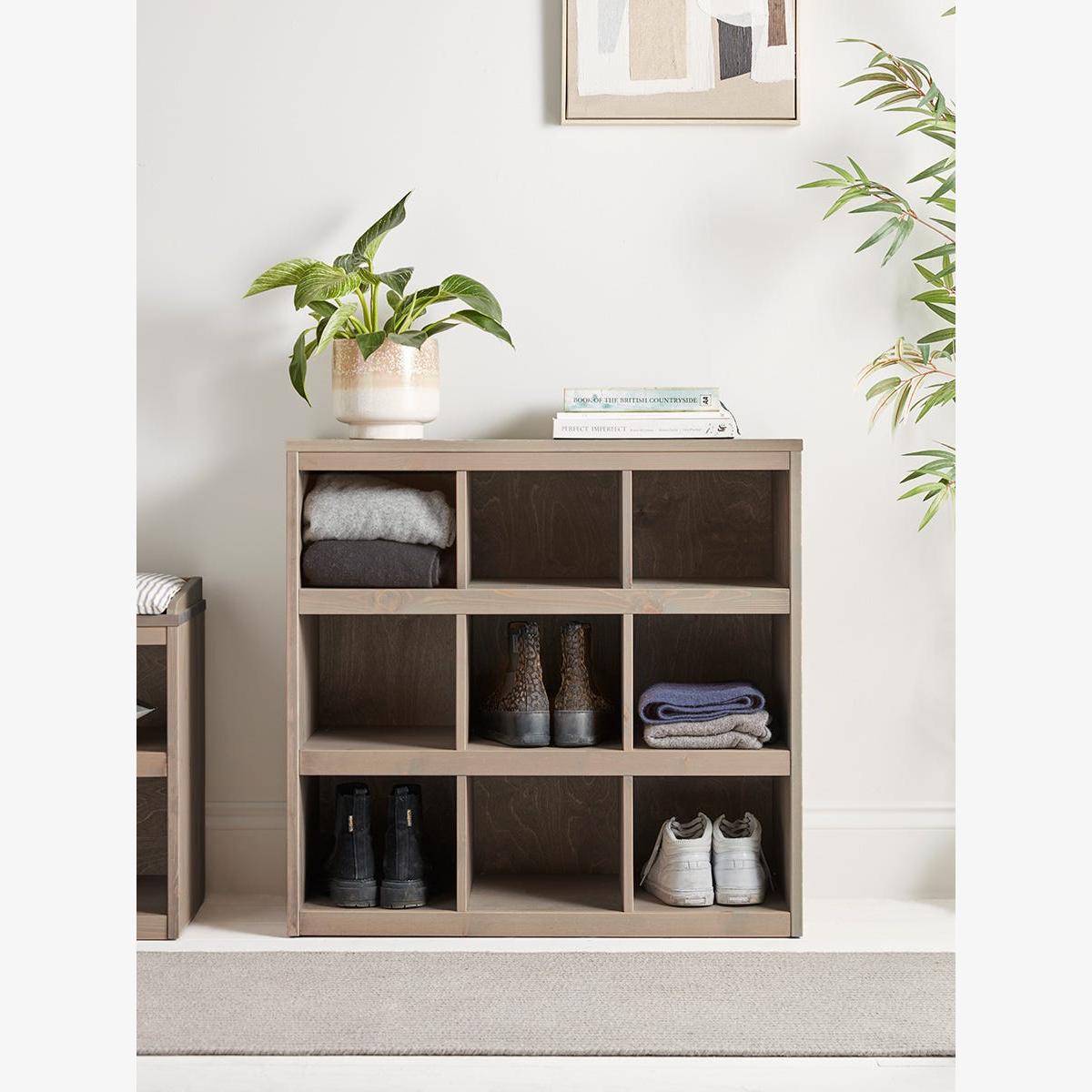 Shoe storage worthy of the smartest bootrooms and hallways, our wooden storage box has nine cubby holes offering plenty room for walking boots, school and running shoes. Made from sturdy pine with a gentle grey washed finish.