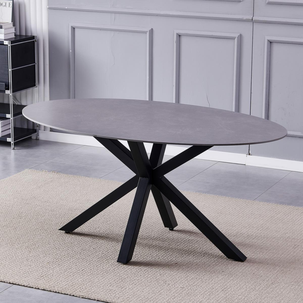 The Gricio 160cm x 90cm Grey Stone Oval Dining Table combines contemporary style with exceptional durability, making it an ideal centrepiece for modern dining spaces. Featuring a sleek oval shape and a grey sintered stone top, this table offers a sophisticated, high-quality finish that is both scratch-resistant and easy to maintain. The sturdy matte black cross-shaped legs provide robust support and a striking design contrast. With a comfortable 75cm height, its perfect for relaxed dining and gatherings. Enjoy quick and efficient delivery, allowing you to elevate your dining room effortlessly with the Gricio dining table's chic and functional design.