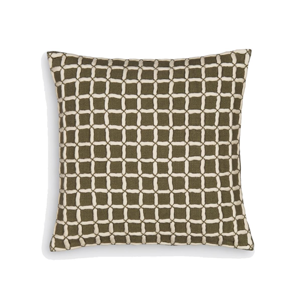 Graphic patterns and textured effects. A tile design in applied threads adorns the front. Product Details • 100% cotton • Front tiles applied in threads • Plain on back • Zip fastening. Size • 40 x 40cm