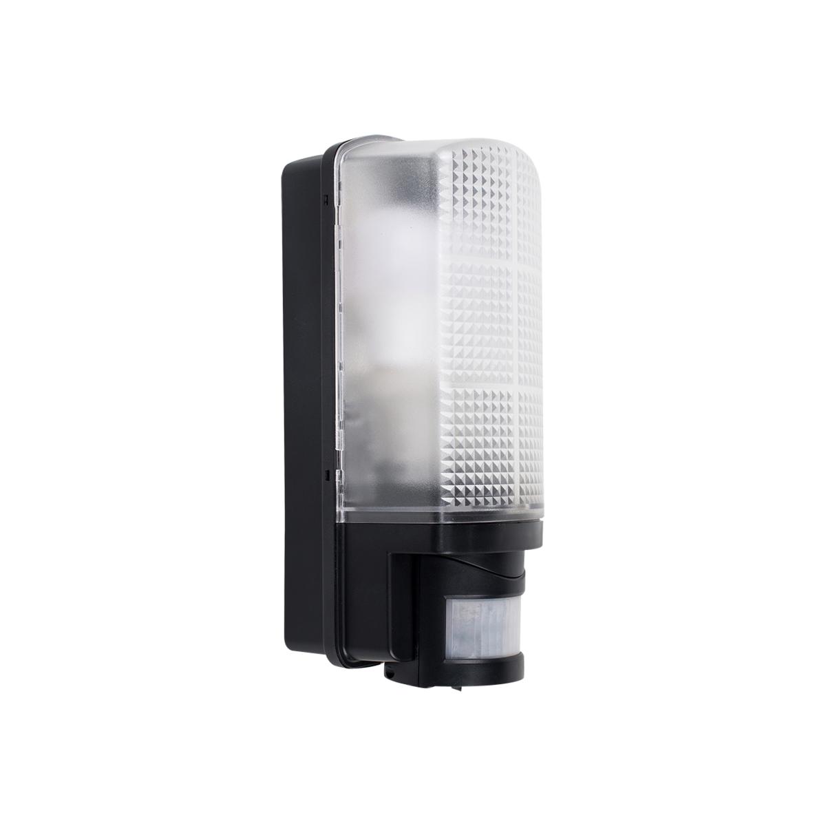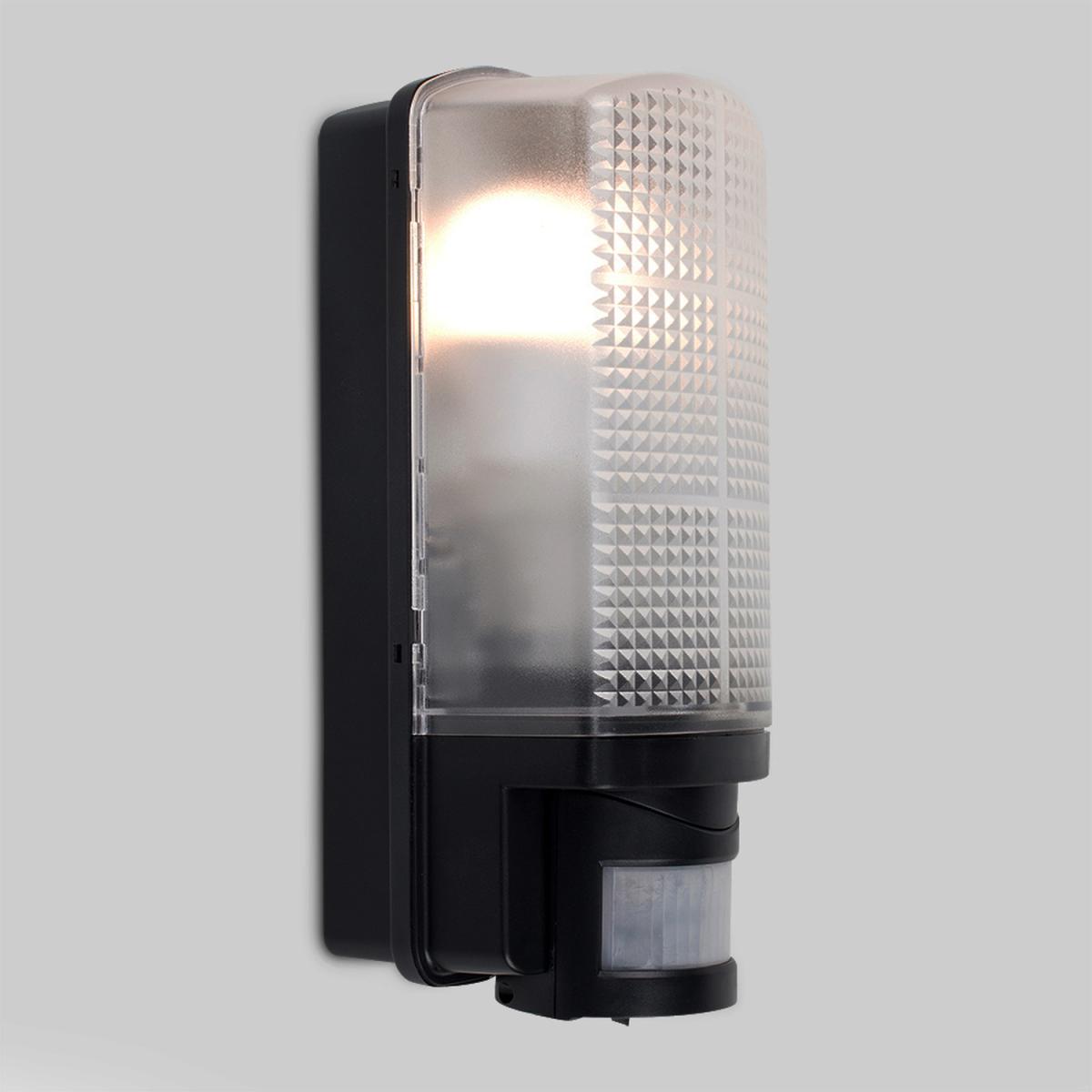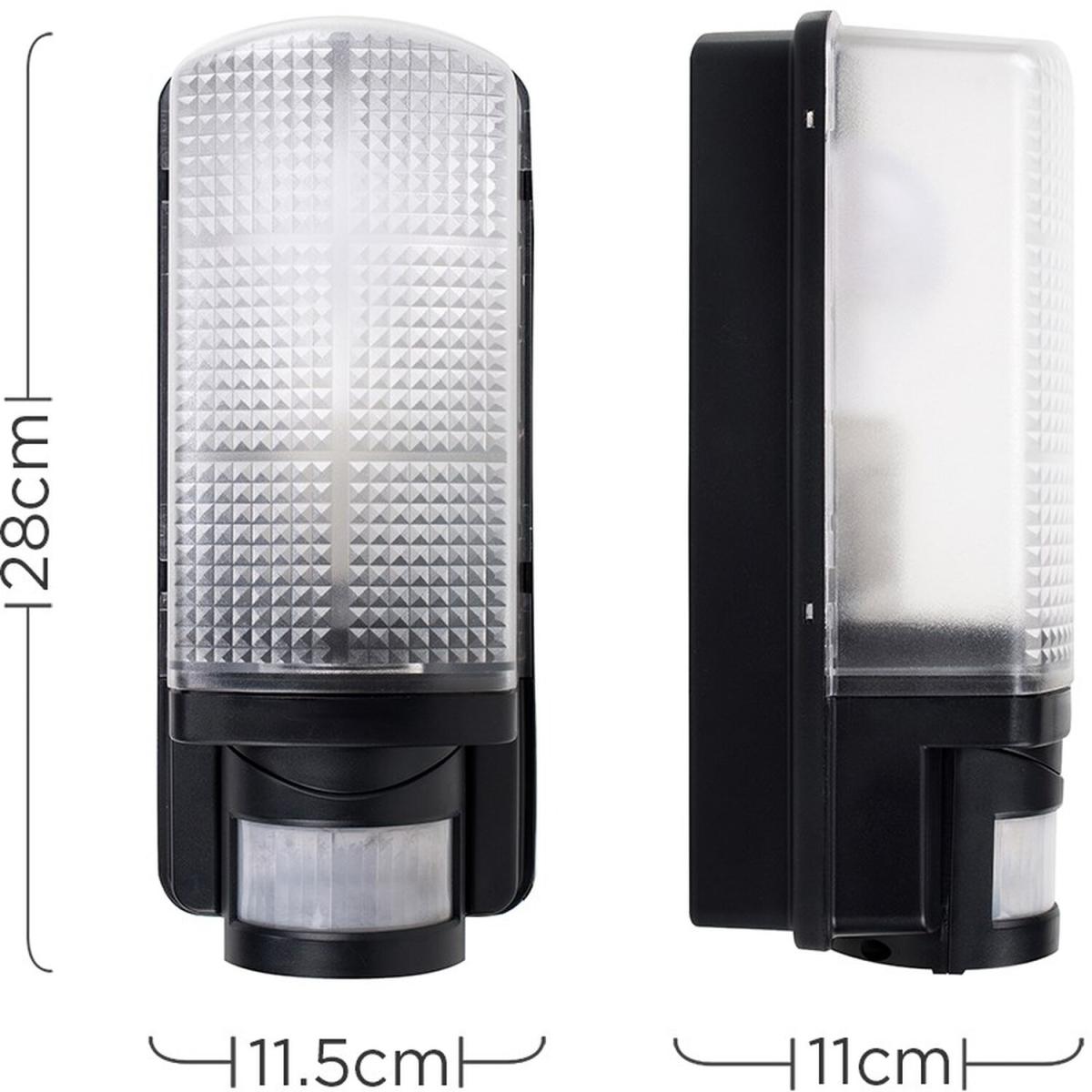 This practical, wall mounted outdoor bulkhead light has a modern jet black flush design with a frosted textured lens. Ideal for lighting gardens, paths, garages, patios, courtyards, decorative porches and driveways. As well as being IP44 outdoor weatherproof rated, this external light also features a practical integrated PIR motion detector - providing extra security for the home and giving peace of mind. The wall-mounted outdoor light comes in a sturdy and weatherproof durable black plastic design and provides a 110 degree detection range as well as a max direction distance of 8 metres. This robust, illuminating external light is IP44 Rated and is fully certified for outdoor installation. Featuring a time delay of 5 secs - 4 minutes. Set to your preference! Adjustable Lux Daylight - Night. 1 x 60w ES E27 GLS Bulb Is Required - Not Supplied