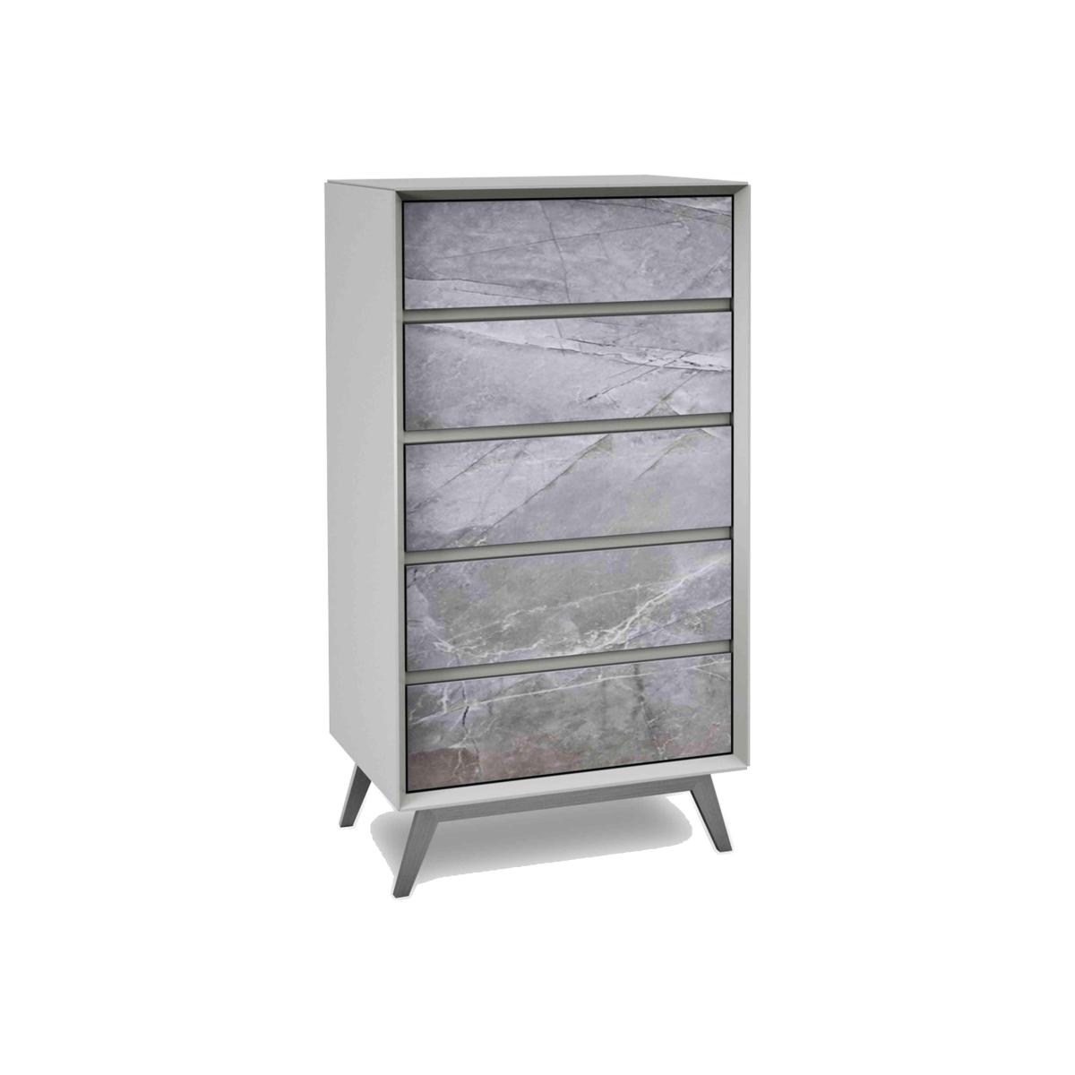 If you love our Grigio living and dining room furniture, you’re going to be wowed by our Grigio bedroom range. Showcasing the same high-gloss, marble-effect ceramic finish and comprising a wardrobe, chests of drawers, a dressing table and a bed frame, this collection makes it easy to turn any bedroom into a haven of contemporary luxury. And as well as sleek and sophisticated style you’ll also appreciate Grigio’s thoughtful design and practical storage. The bed frame has ottoman storage, the wardrobe has both drawers and hanging space and the dressing table has cupboards and drawers. The Grigio bedroom range is exclusively available at Furniture Village. Bring home the wow factor with this high-gloss tall chest of drawers. The combination of ceramic drawer fronts and brushed stainless steel legs will elevate any bedroom style. Why you'll love it Sophisticated and stylish – perfect for a contemporary luxury bedroom. Beautiful high-gloss, marble-effect ceramic drawer fronts. Ceramic is very durable and resistant to chips and scratches. Sleek handleless design. Soft closing drawers. Brushed stainless steel legs complete this on-trend look. Exclusive to Furniture Village. This 5-drawer tall chest of drawers is part of our Grigio bedroom range. What you need to know Please note that ceramic is not 100% heatproof. This finish may show surface scratches under certain lighting. Do not use abrasive cleaning products. We recommend using coasters and placemats at all times. Easy to care for. Simply wipe with a clean damp cloth. Love the look? Take a look at our Grigio living and dining room furniture. WARNING!
