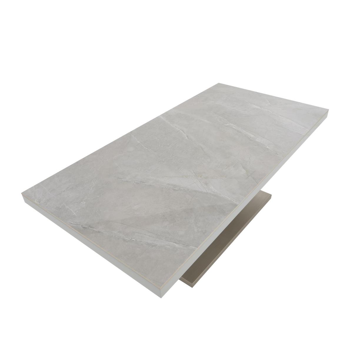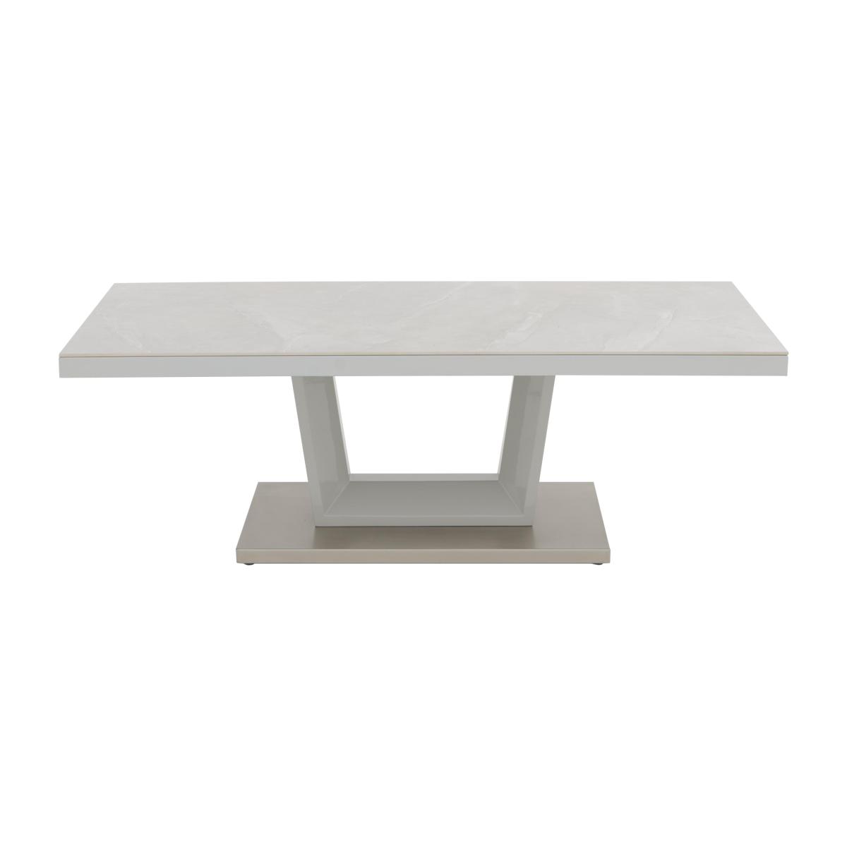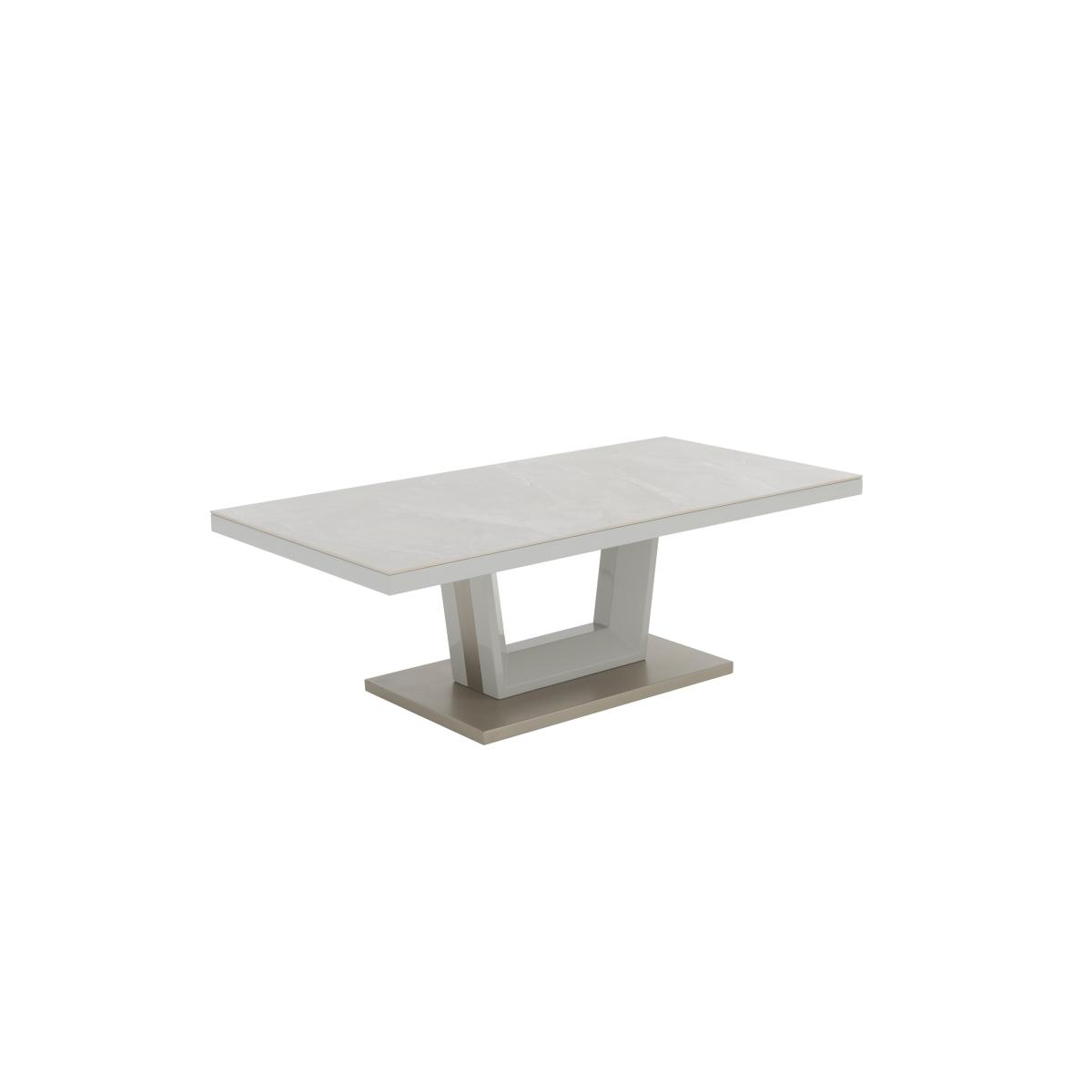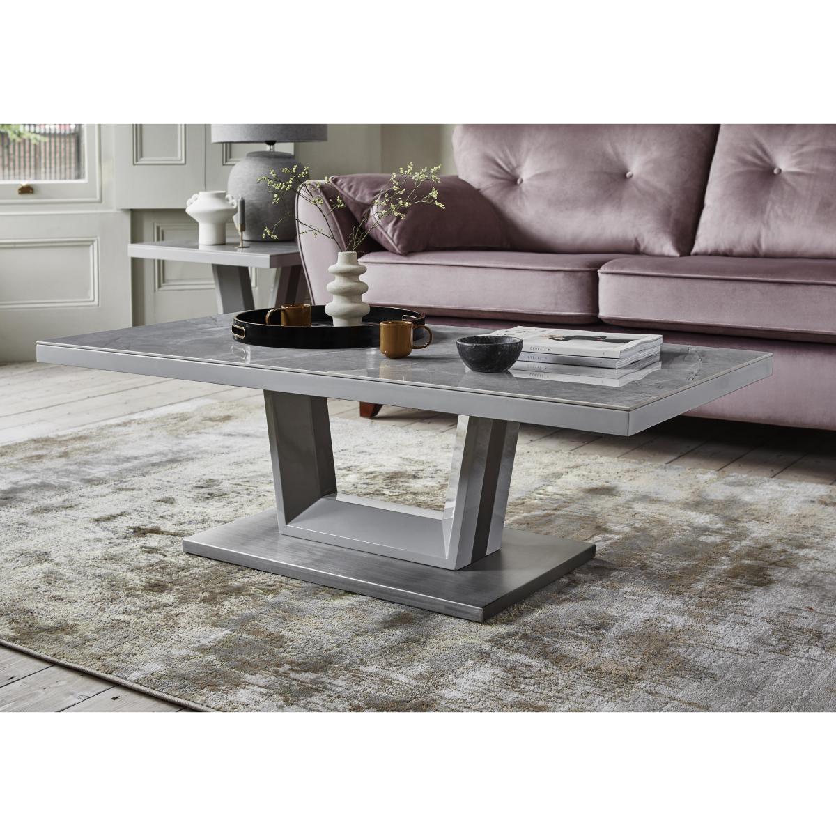 Love sophisticated elegant interior style? It’s time to get acquainted with our fabulous Grigio range. The look is striking – high-gloss, marble-patterned ceramic and brushed stainless steel – and it's a combination that ensures pieces are as durable and family-friendly as they are sleek and stylish. This extensive range offers a wide choice of furniture for living rooms, dining rooms, TV rooms and hallways with many pieces carefully proportioned for more compact spaces. You’ll find dining tables, dining room seating and dining sets, as well as storage pieces, occasional tables and even an entertainment centre. The Grigio range is exclusively available at Furniture Village. This modern coffee table makes a striking living room focal point – and then some. We love its glossy grey ceramic finish and bold pedestal base. Why you'll love it. This coffee table is a striking addition to any living room. Elegant modern style. High-gloss, marble-effect ceramic top is both beautiful and practical. Ceramic is highly durable, and heat-, scratch- and chip-resistant. U-shaped pedestal base has a brushed stainless steel detail and plinth. Exclusive to Furniture Village. This coffee table is part of the Grigio range. What you need to know. Please note that ceramic is not 100% heatproof. We recommend using coasters and placemats at all times. Easy to care for. Simply wipe with a clean damp cloth.