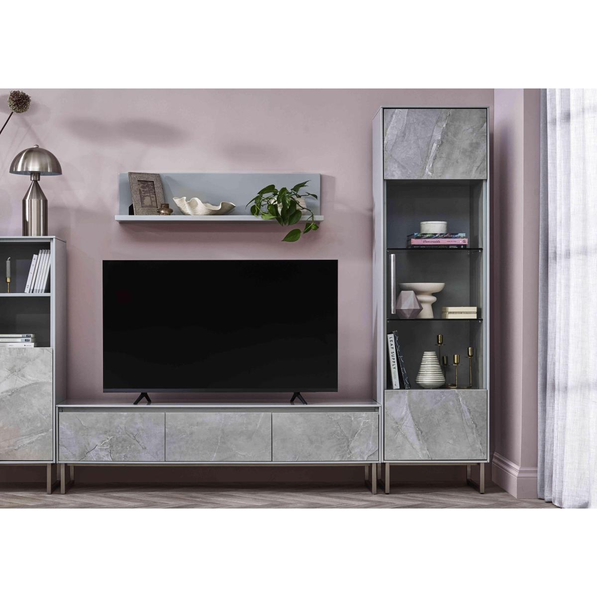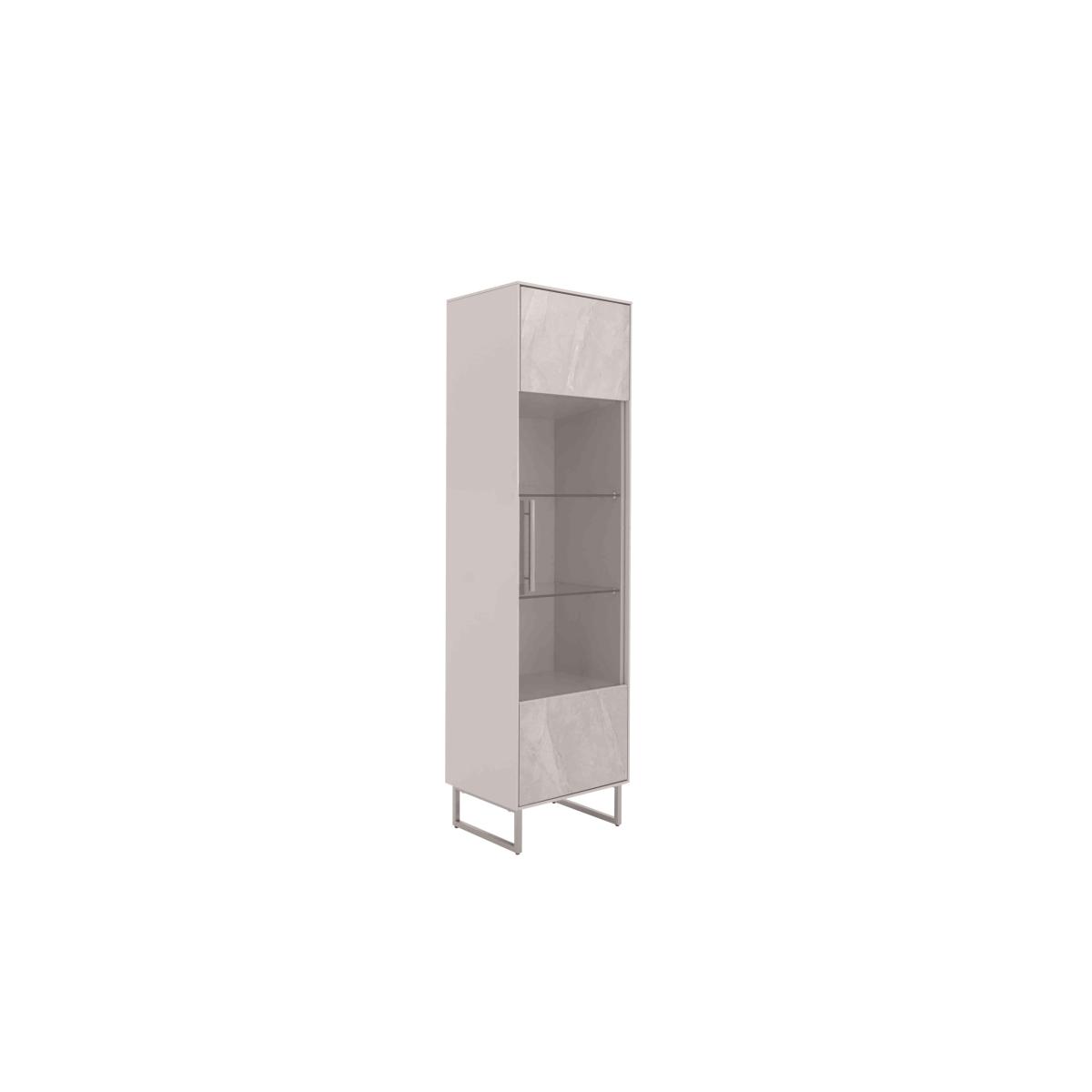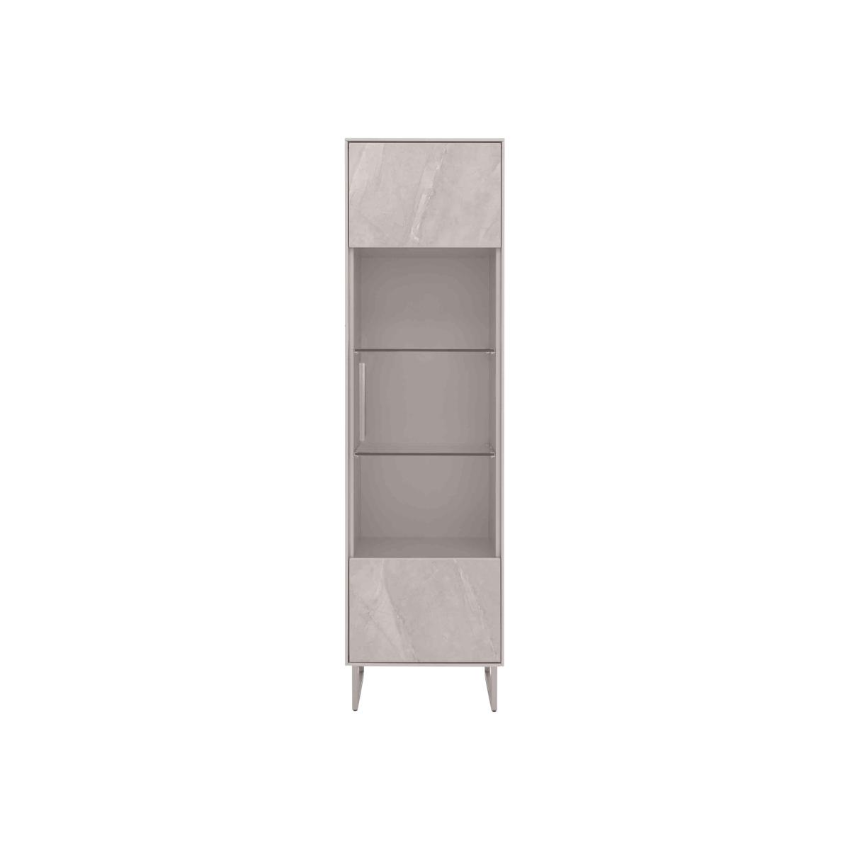 Love sophisticated elegant interior style? It’s time to get acquainted with our fabulous Grigio range. The look is striking – high-gloss, marble-patterned ceramic and brushed stainless steel – and it's a combination that ensures pieces are as durable and family-friendly as they are sleek and stylish. This extensive range offers a wide choice of furniture for living rooms, dining rooms, TV rooms and hallways with many pieces carefully proportioned for more compact spaces. You’ll find dining tables, dining room seating and dining sets, as well as storage pieces, occasional tables and even an entertainment centre. The Grigio range is exclusively available at Furniture Village. This tall display unit showcases the Grigio range’s signature glossy marble-effect ceramic finish. It offers plenty of places to show off treasured possessions, and to tuck away other bits and pieces. Why you'll love it. This stylish ceramic display unit has versatile cupboard and shelf storage. Elegant modern style. High-gloss, marble-effect ceramic finish is both beautiful and practical. Brushed stainless steel U-shaped legs. Cupboard doors and drawers are soft-closing. Exclusive to Furniture Village. This display unit is part of the Grigio range. What you need to know. 2 cupboards, 1 drawer. Glass-fronted cupboard has 2 adjustable glass shelves. Please note that ceramic is not 100% heatproof. We recommend using coasters and placemats at all times. Easy to care for. Simply wipe with a clean damp cloth. WARNING!. Furniture can tip over unexpectedly and cause injury. This item must be fixed to a wall using the anti-tip kit provided. Be sure to use the correct wall fixings suitable for the walls in your home. Furniture Village is not able to fix anti-tip devices for you. Seek professional advice if you are unsure.