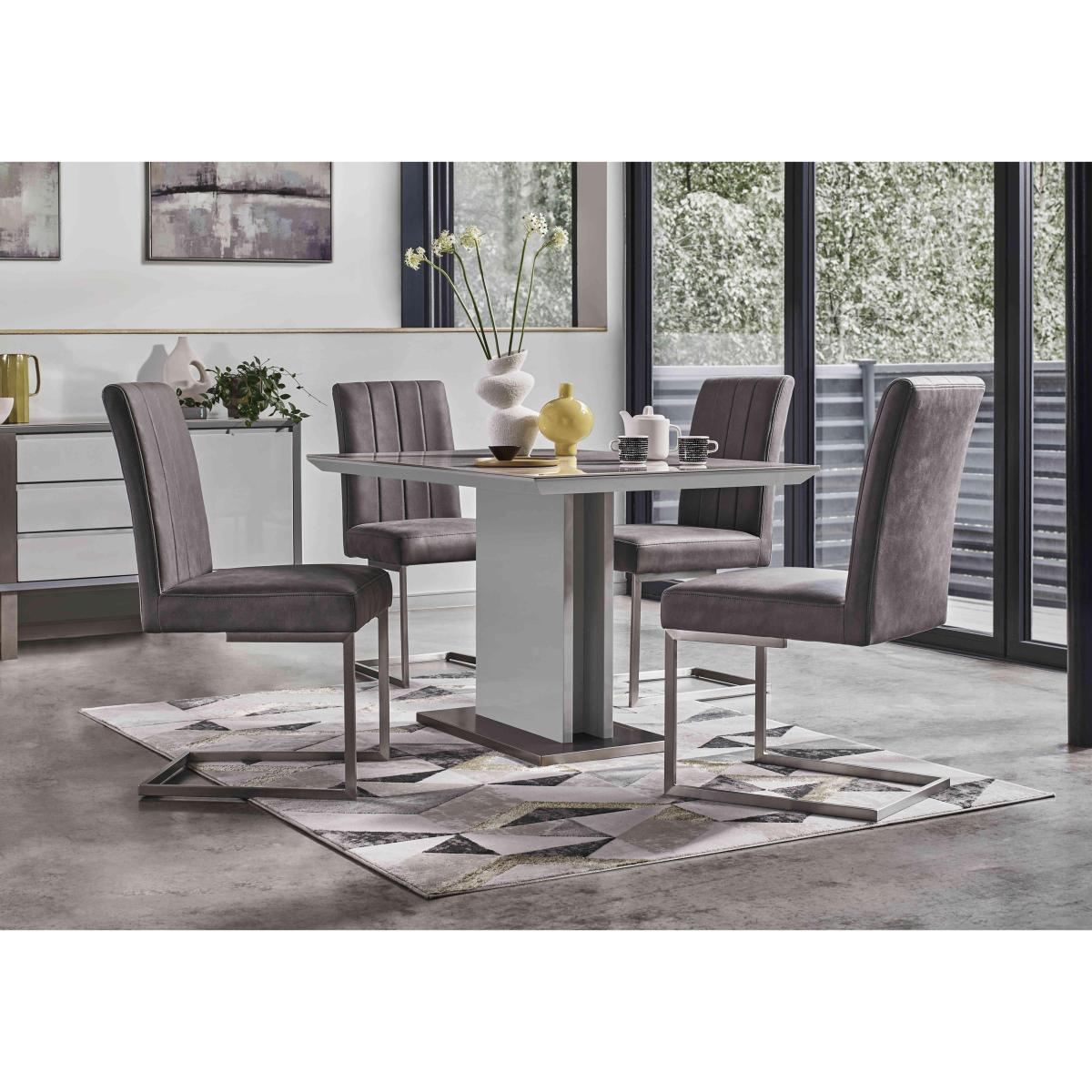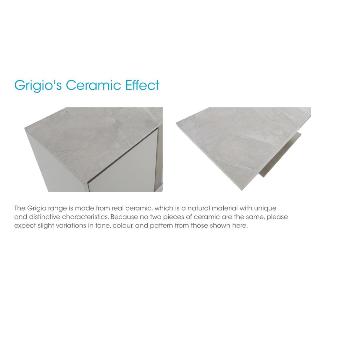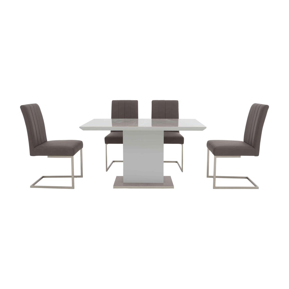 Love sophisticated elegant interior style? It’s time to get acquainted with our fabulous Grigio range. The look is striking – high-gloss, marble-patterned ceramic and brushed stainless steel – and it's a combination that ensures pieces are as durable and family-friendly as they are sleek and stylish. This extensive range offers a wide choice of furniture for living rooms, dining rooms, TV rooms and hallways with many pieces carefully proportioned for more compact spaces. You’ll find dining tables, dining room seating and dining sets, as well as storage pieces, occasional tables and even an entertainment centre. The Grigio range is exclusively available at Furniture Village. Dinner party, family breakfast or cocktail evening, this dining set is the perfect centrepiece thanks to the table’s glossy marbled ceramic finish and the dining chairs’ cool cantilever bases. Why you'll love it. Sleek and chic, this is the perfect small-space dining set. Elegant modern style for more compact spaces. The dining table’s high-gloss, marble-effect ceramic top is both beautiful and practical. Ceramic is highly durable, and heat-, scratch- and chip-resistant. Pedestal base sits on a brushed stainless steel plinth. Dining set includes 4 dining chairs. Chairs are upholstered in grey faux leather with understated vertical stitching. Cantilever bases have a brushed stainless steel finish. Exclusive to Furniture Village. This dining set is part of the Grigio range. What you need to know. Dining chairs are cushioned with foam. Dining table seats 6. Please note that ceramic is not 100% heatproof. We recommend using coasters and placemats at all times. Easy to care for. Simply wipe with a clean damp cloth.