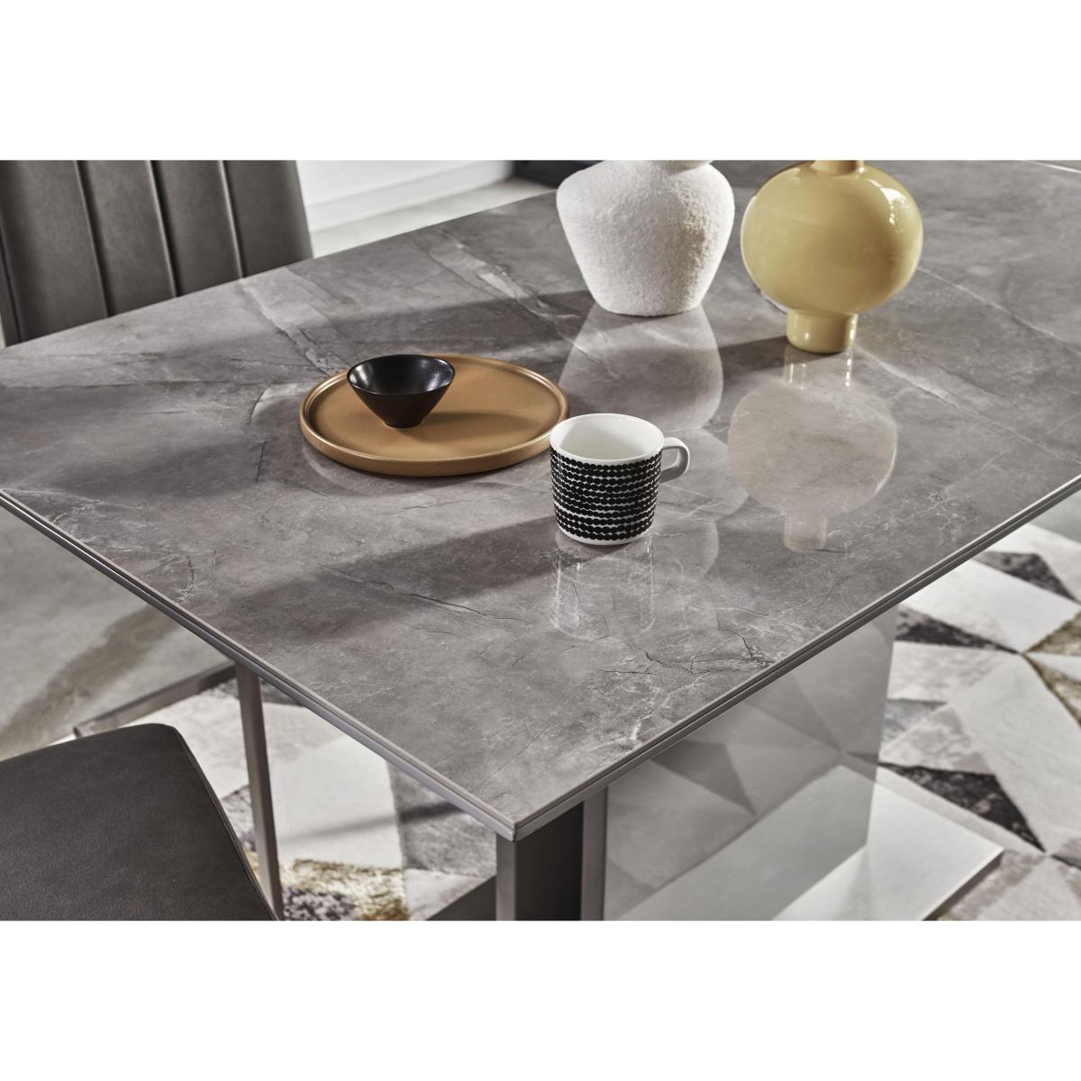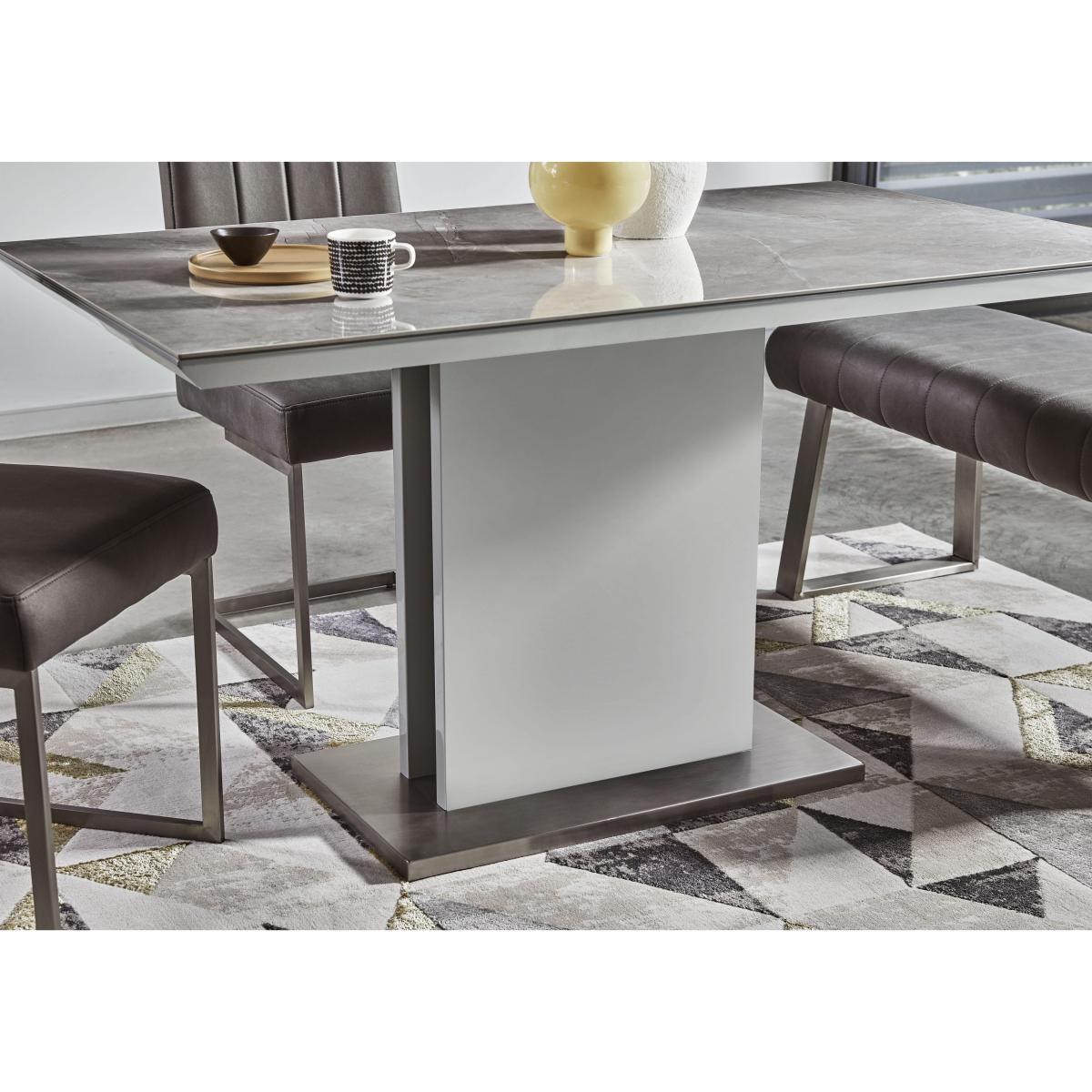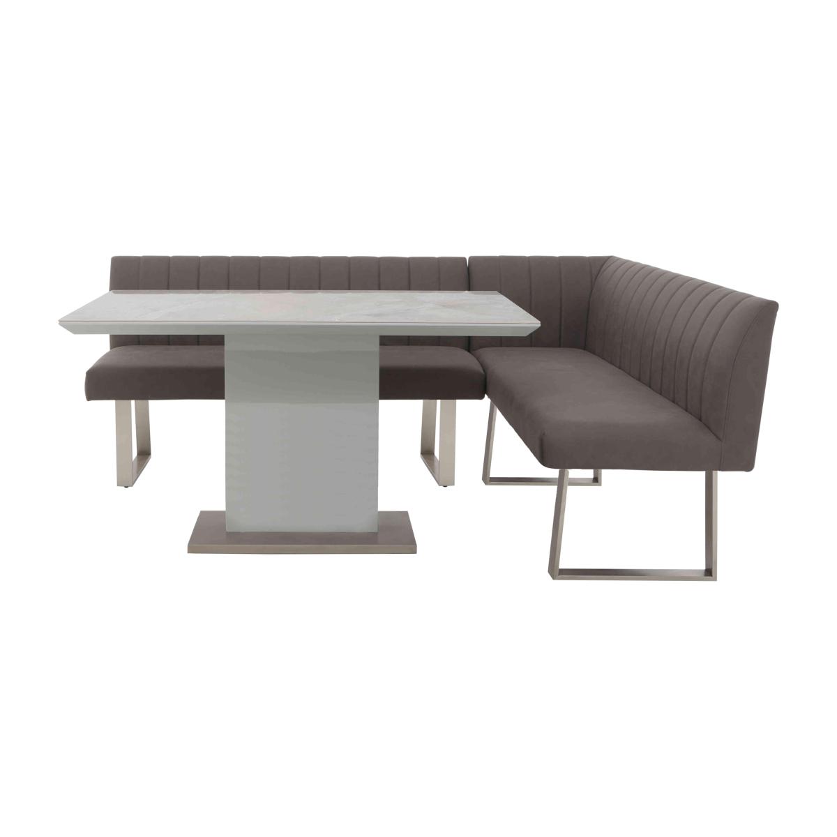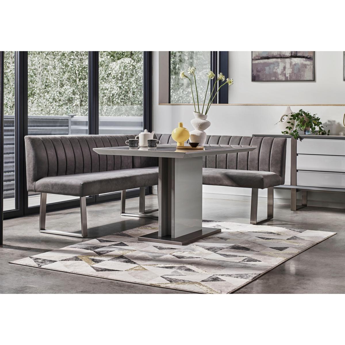 Love sophisticated elegant interior style? It’s time to get acquainted with our fabulous Grigio range. The look is striking – high-gloss, marble-patterned ceramic and brushed stainless steel – and it's a combination that ensures pieces are as durable and family-friendly as they are sleek and stylish. This extensive range offers a wide choice of furniture for living rooms, dining rooms, TV rooms and hallways with many pieces carefully proportioned for more compact spaces. You’ll find dining tables, dining room seating and dining sets, as well as storage pieces, occasional tables and even an entertainment centre. The Grigio range is exclusively available at Furniture Village. Smaller dining room? This dining set comprises a standout ceramic-topped marble-effect dining table and a very cool – and roomy – faux leather corner dining bench. Why you'll love it. This dining set with a corner bench is small-space dining perfection. Elegant modern style for more compact spaces. The dining table’s high-gloss, marble-effect ceramic top is both beautiful and practical. Ceramic is highly durable, and heat-, scratch- and chip-resistant. Pedestal base sits on a brushed stainless steel plinth. Set includes a versatile right-hand facing corner dining bench. Bench has grey faux leather upholstery with understated stitching detail. Brushed stainless steel U-shaped legs. Exclusive to Furniture Village. This dining set is part of the Grigio range. What you need to know. The corner dining bench comprises two separate pieces that join together. It’s right-hand facing – the bench section with the corner is on the right. Bench is cushioned with foam. Bench seats 5. Please note that the ceramic table top is not 100% heatproof. We recommend using coasters and placemats at all times. Easy to care for. Simply wipe with a clean damp cloth.