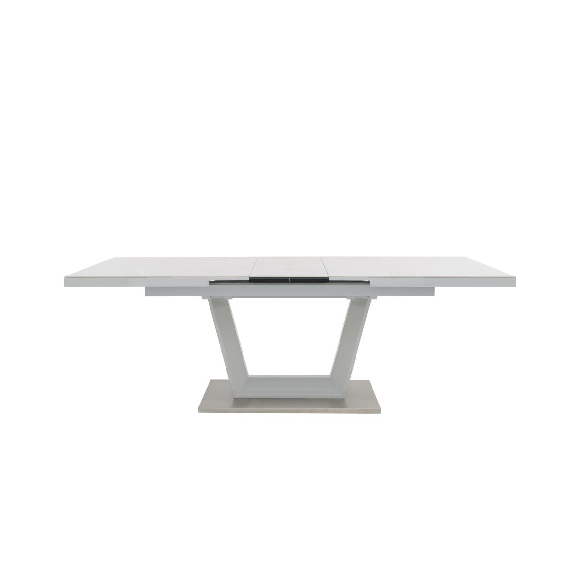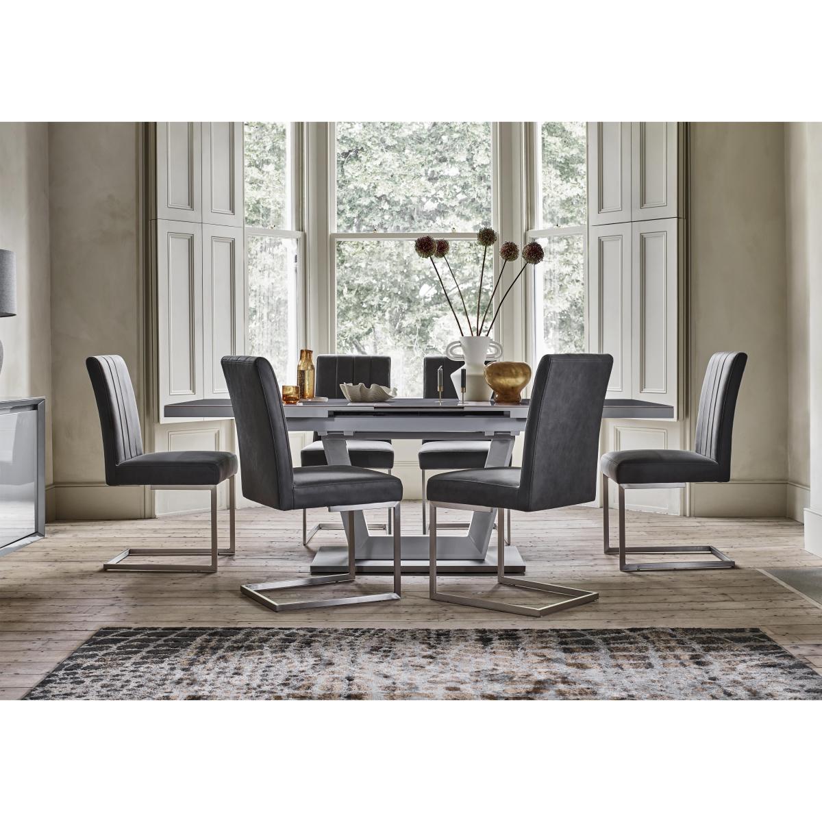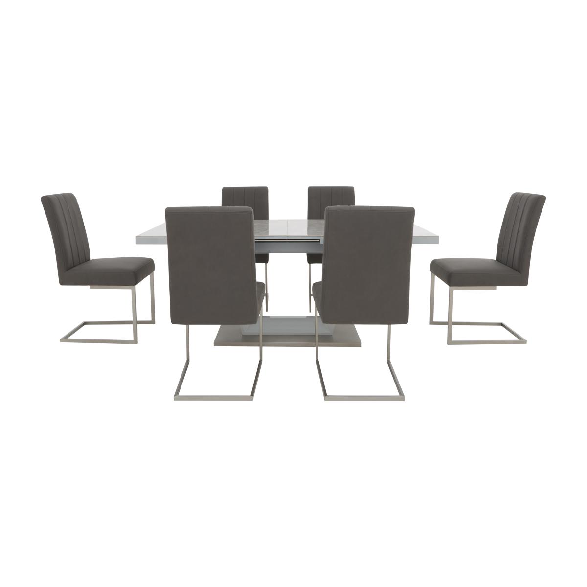 Love sophisticated elegant interior style? It’s time to get acquainted with our fabulous Grigio range. The look is striking – high-gloss, marble-patterned ceramic and brushed stainless steel – and it's a combination that ensures pieces are as durable and family-friendly as they are sleek and stylish. This extensive range offers a wide choice of furniture for living rooms, dining rooms, TV rooms and hallways with many pieces carefully proportioned for more compact spaces. You’ll find dining tables, dining room seating and dining sets, as well as storage pieces, occasional tables and even an entertainment centre. The Grigio range is exclusively available at Furniture Village. Big family? The fabulous dining table in this very cool dining set extends to seat an impressive ten, and it comes with six faux leather dining chairs. Why you'll love it. With its large extending dining table, this dining set combines style with versatility. Elegant modern style. The dining table’s high-gloss, marble-effect ceramic top is both beautiful and practical. Ceramic is highly durable, and heat-, scratch- and chip-resistant. Pop-up extension mechanism is so easy to use. U-shaped pedestal base has a brushed stainless steel detail and plinth. Dining set includes 6 dining chairs. Chairs have grey faux leather upholstery with understated vertical stitching. Cantilever bases with a brushed stainless steel finish. Exclusive to Furniture Village. This dining set is part of the Grigio range. What you need to know. Dining chairs are cushioned with foam. Large extending dining table seats 6 when closed and 10 when extended. Please note that ceramic is not 100% heatproof. We recommend using coasters and placemats at all times. Easy to care for. Simply wipe with a clean damp cloth.