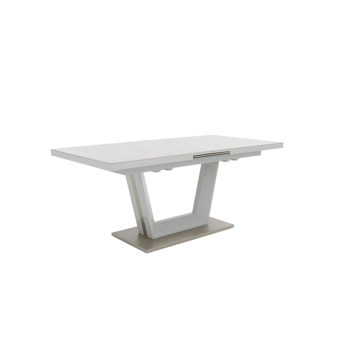 Love sophisticated elegant interior style? It’s time to get acquainted with our fabulous Grigio range. The look is striking – high-gloss, marble-patterned ceramic and brushed stainless steel – and it's a combination that ensures pieces are as durable and family-friendly as they are sleek and stylish. This extensive range offers a wide choice of furniture for living rooms, dining rooms, TV rooms and hallways with many pieces carefully proportioned for more compact spaces. You’ll find dining tables, dining room seating and dining sets, as well as storage pieces, occasional tables and even an entertainment centre. The Grigio range is exclusively available at Furniture Village. This statement extending dining table showcases a fabulous – and very hardwearing – glossy marble-effect ceramic finish atop a unique pedestal base. Striking modern style for any home. Why you'll love it. This large extending dining table will transform your dining room. Elegant modern style. High-gloss, marble-effect ceramic top is both beautiful and practical. Ceramic is highly durable, and heat-, scratch- and chip-resistant. Pop-up extension mechanism is so easy to use. U-shaped pedestal base has a brushed stainless steel detail and plinth. Exclusive to Furniture Village. This large extending dining table is part of the Grigio range. What you need to know. Large extending dining table seats 6 when closed and 10 when extended. Please note that ceramic is not 100% heatproof. We recommend using coasters and placemats at all times. Easy to care for. Simply wipe with a clean damp cloth. Complete your dining set with dining chairs from the Grigio range.
