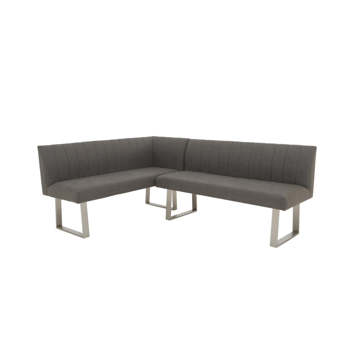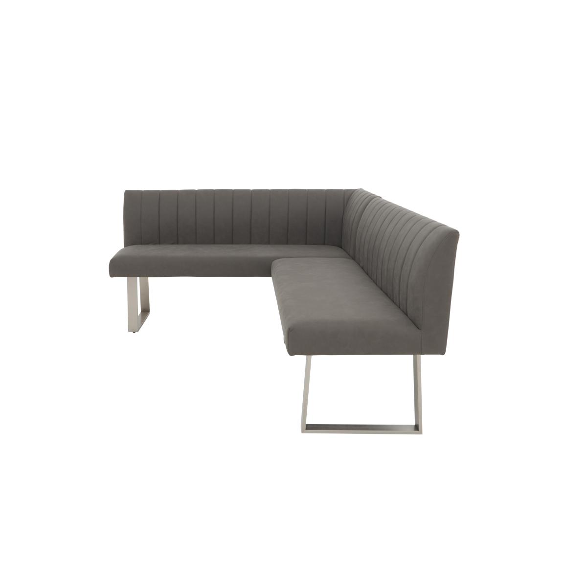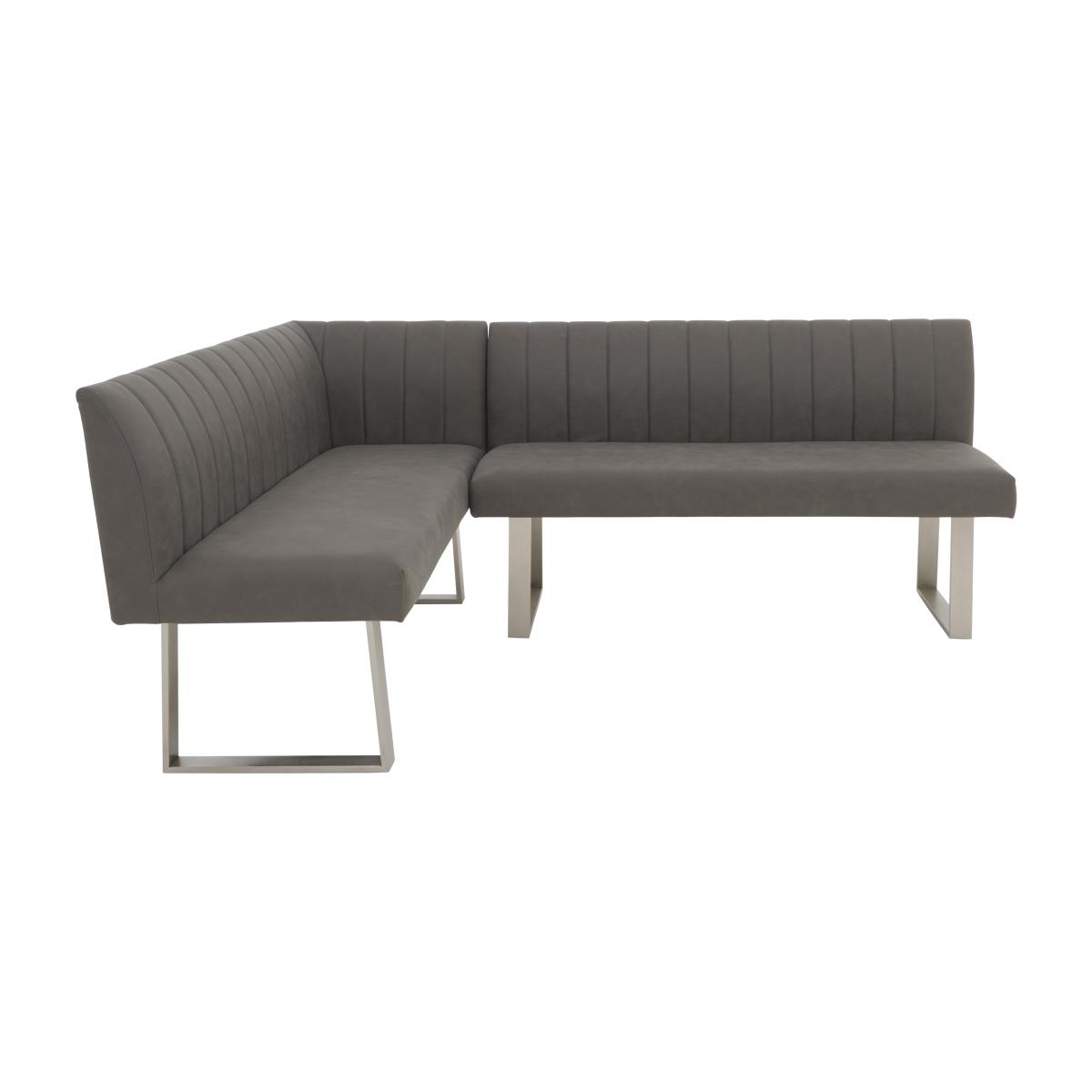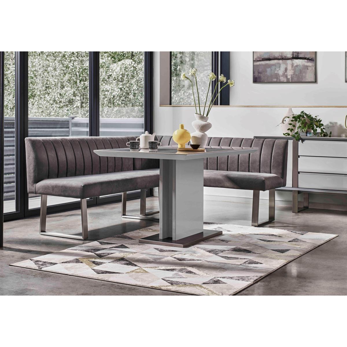 Love sophisticated elegant interior style? It’s time to get acquainted with our fabulous Grigio range. The look is striking – high-gloss, marble-patterned ceramic and brushed stainless steel – and it's a combination that ensures pieces are as durable and family-friendly as they are sleek and stylish. This extensive range offers a wide choice of furniture for living rooms, dining rooms, TV rooms and hallways with many pieces carefully proportioned for more compact spaces. You’ll find dining tables, dining room seating and dining sets, as well as storage pieces, occasional tables and even an entertainment centre. The Grigio range is exclusively available at Furniture Village. Complete your kitchen dining arrangement with this contemporary corner dining bench. Upholstered in soft grey faux leather, it’s as useful as it is stylish. Why you'll love it. There’s room for everyone on this modern corner dining bench. Elegant contemporary style. Grey faux leather upholstery with understated stitching detail. Brushed stainless steel U-shaped legs. Exclusive to Furniture Village. This left-hand facing corner dining bench is part of the Grigio range. What you need to know. This dining bench comprises two separate pieces that join together. Left-hand facing – the bench section with the corner is on the left. Cushioned with foam. Seats 5. Designed to complement the Grigio range’s dining tables.