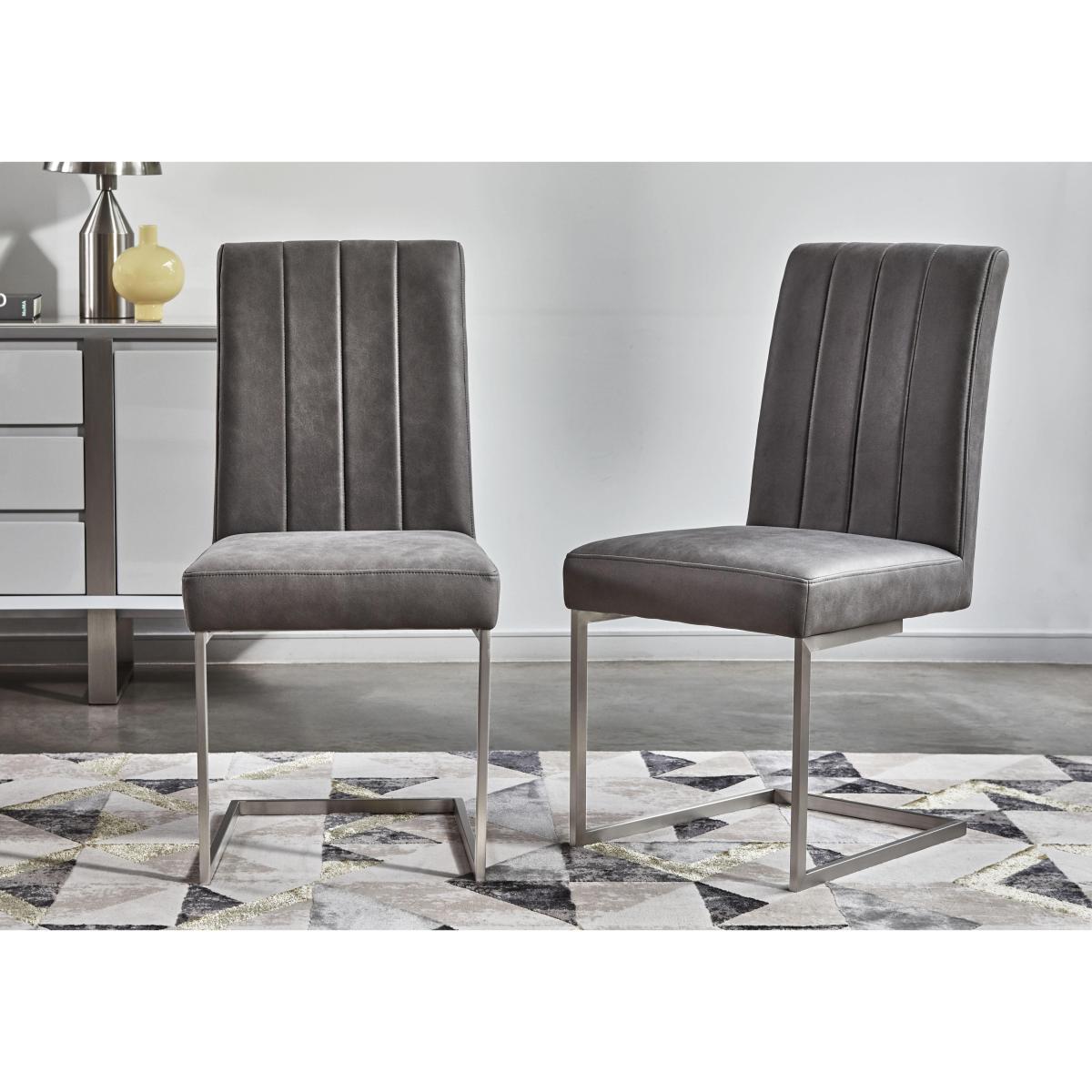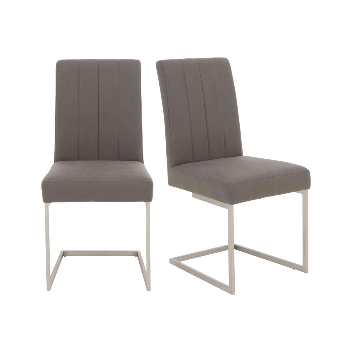 Love sophisticated elegant interior style? It’s time to get acquainted with our fabulous Grigio range. The look is striking – high-gloss, marble-patterned ceramic and brushed stainless steel – and it's a combination that ensures pieces are as durable and family-friendly as they are sleek and stylish. This extensive range offers a wide choice of furniture for living rooms, dining rooms, TV rooms and hallways with many pieces carefully proportioned for more compact spaces. You’ll find dining tables, dining room seating and dining sets, as well as storage pieces, occasional tables and even an entertainment centre. The Grigio range is exclusively available at Furniture Village. Dinner parties last longer with stylish and comfortable guest seating like this pair of faux leather dining chairs from our Grigio range. We love these dining chairs’ cantilever bases. Why you'll love it. Pair of faux leather dining chairs makes it easy to dine in style. Elegant contemporary style. Grey faux leather upholstery with understated vertical stitching. Cantilever bases have a brushed stainless steel finish. Exclusive to Furniture Village. This pair of faux leather dining chairs is part of the Grigio range. What you need to know. Dining chairs are cushioned with foam. Designed to complement the Grigio range’s dining tables.