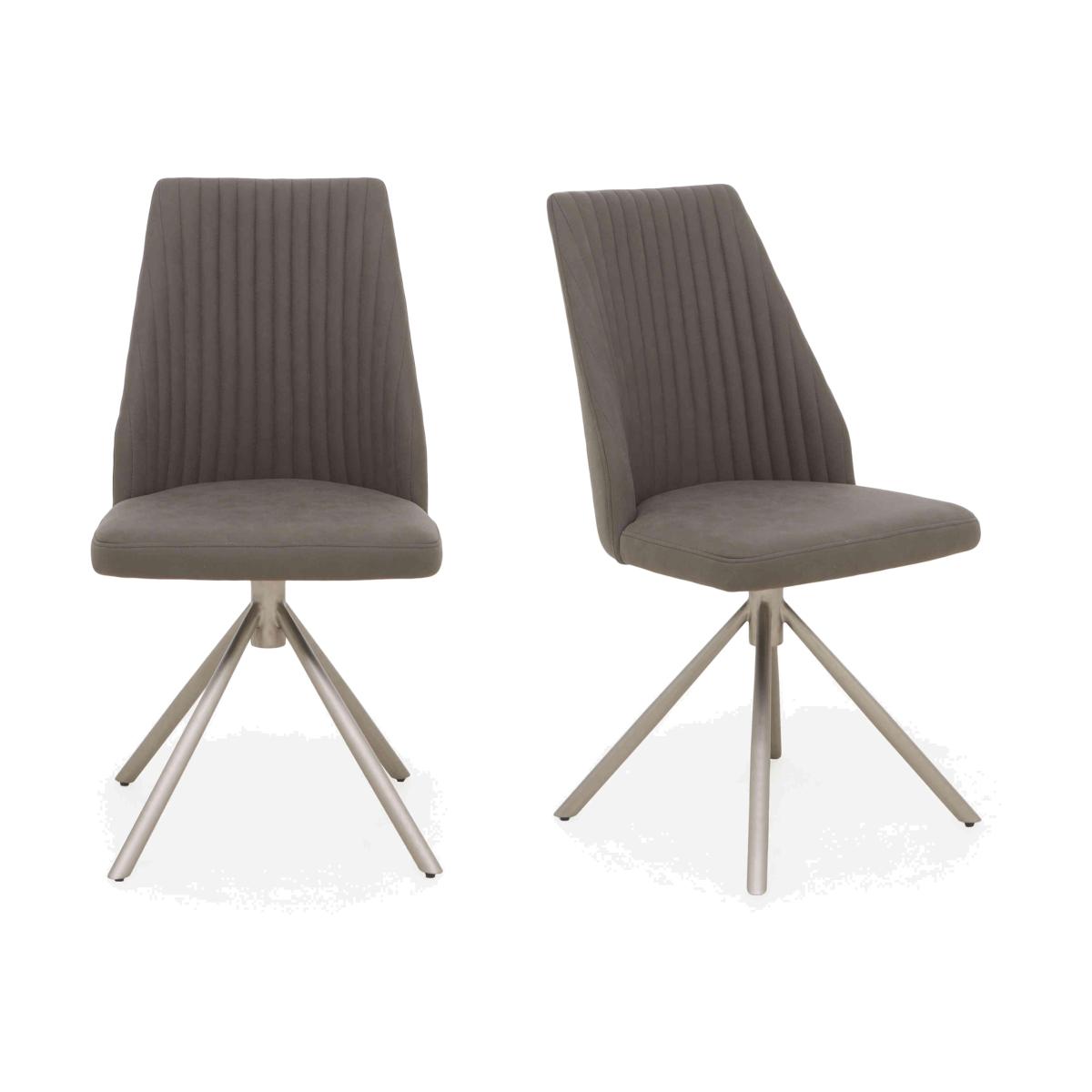 Love sophisticated elegant interior style? It’s time to get acquainted with our fabulous Grigio range. The look is striking – high-gloss, marble-patterned ceramic and brushed stainless steel – and it's a combination that ensures pieces are as durable and family-friendly as they are sleek and stylish. This extensive range offers a wide choice of furniture for living rooms, dining rooms, TV rooms and hallways with many pieces carefully proportioned for more compact spaces. You’ll find dining tables, dining room seating and dining sets, as well as storage pieces, occasional tables and even an entertainment centre. The Grigio range is exclusively available at Furniture Village. As well as looking very stylish, this pair of swivel dining chairs is a great idea for a smaller dining space as the swivel base makes life easier for guests. Why you'll love it This pair of swivel dining chairs is so cool. Elegant contemporary style. Grey fabric upholstery with understated vertical stitching. Swivel base with brushed stainless steel-finished legs. Also available individually and in sets of 4 and 6. Exclusive to Furniture Village. This pair of swivel dining chairs is part of the Grigio range. What you need to know Cushioned with foam. Designed to complement the Grigio range’s dining tables.