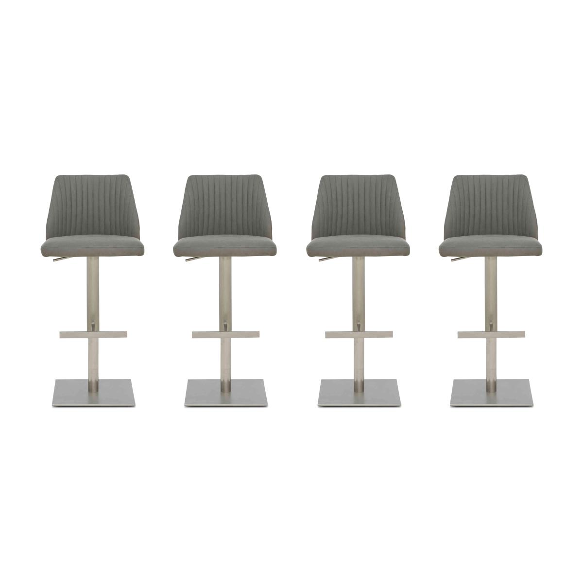 Love sophisticated elegant interior style? It’s time to get acquainted with our fabulous Grigio range. The look is striking – high-gloss, marble-patterned ceramic and brushed stainless steel – and it's a combination that ensures pieces are as durable and family-friendly as they are sleek and stylish. This extensive range offers a wide choice of furniture for living rooms, dining rooms, TV rooms and hallways with many pieces carefully proportioned for more compact spaces. You’ll find dining tables, dining room seating and dining sets, as well as storage pieces, occasional tables and even an entertainment centre. The Grigio range is exclusively available at Furniture Village. Bar table dining is more stylish with this set of four height-adjustable swivel bar stools. The faux leather and brushed stainless steel finish is so on trend. Why you'll love it Here’s the ideal set of 4 swivel bar stools for your bar table. Elegant contemporary style. Grey fabric upholstery with understated vertical stitching. Pedestal base with footrest has a brushed stainless steel finish. Height adjustable. Also available individually. Exclusive to Furniture Village. This set of 4 swivel bar stools is part of the Grigio range. What you need to know Cushioned with foam. This set of bar stools looks fabulous with the Grigio bar table.
