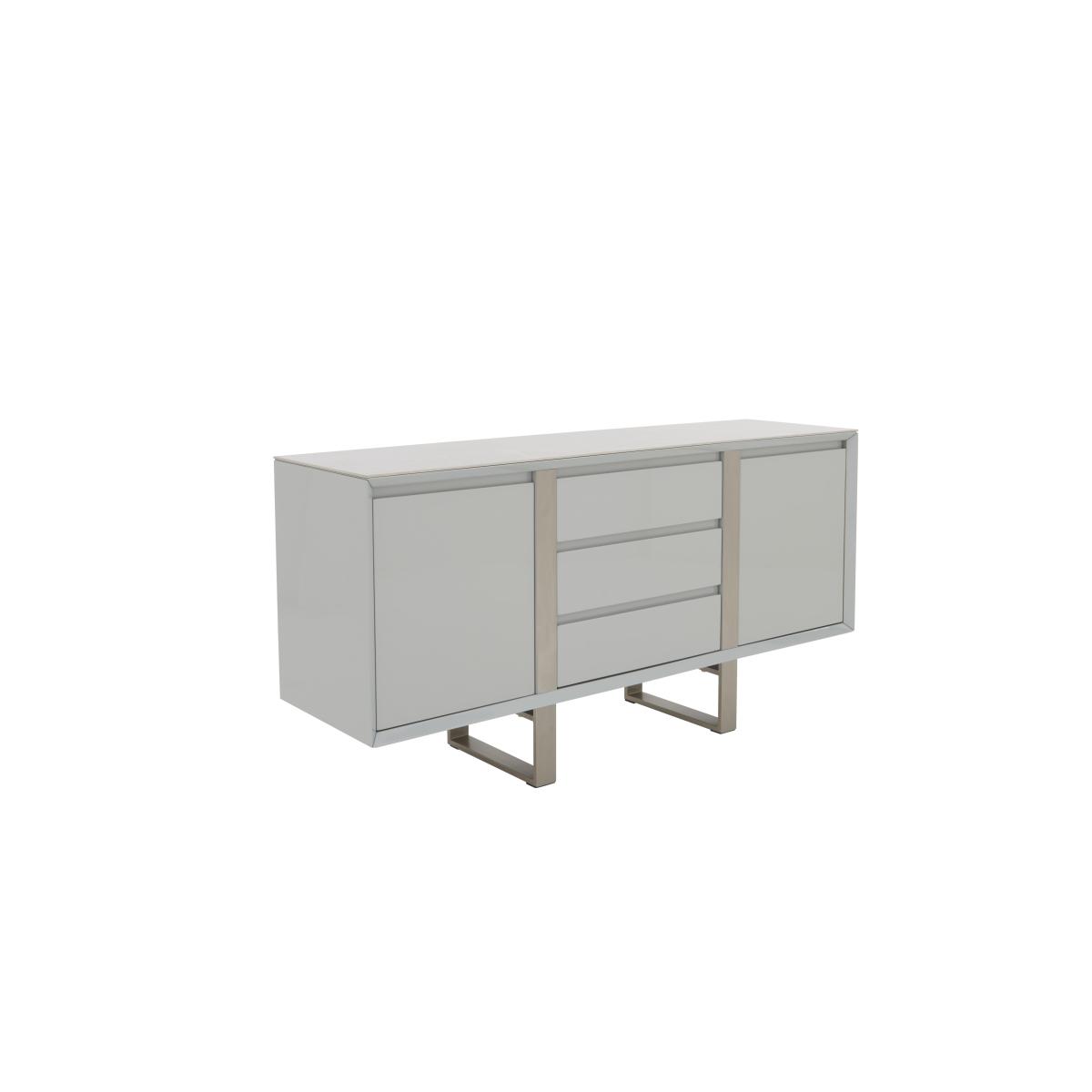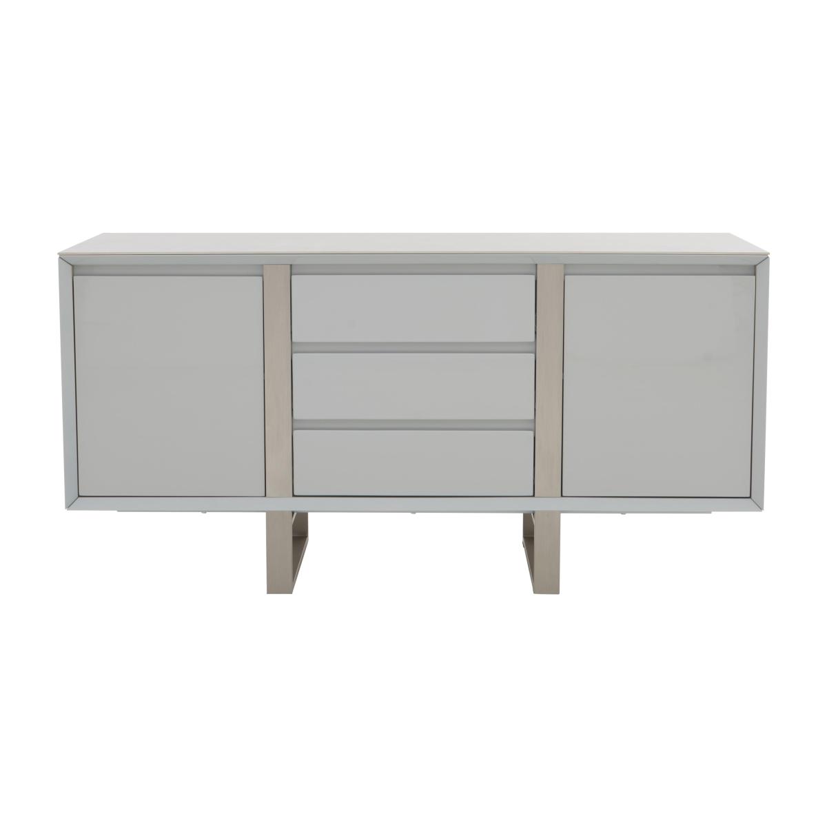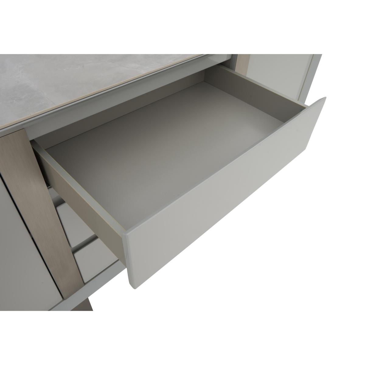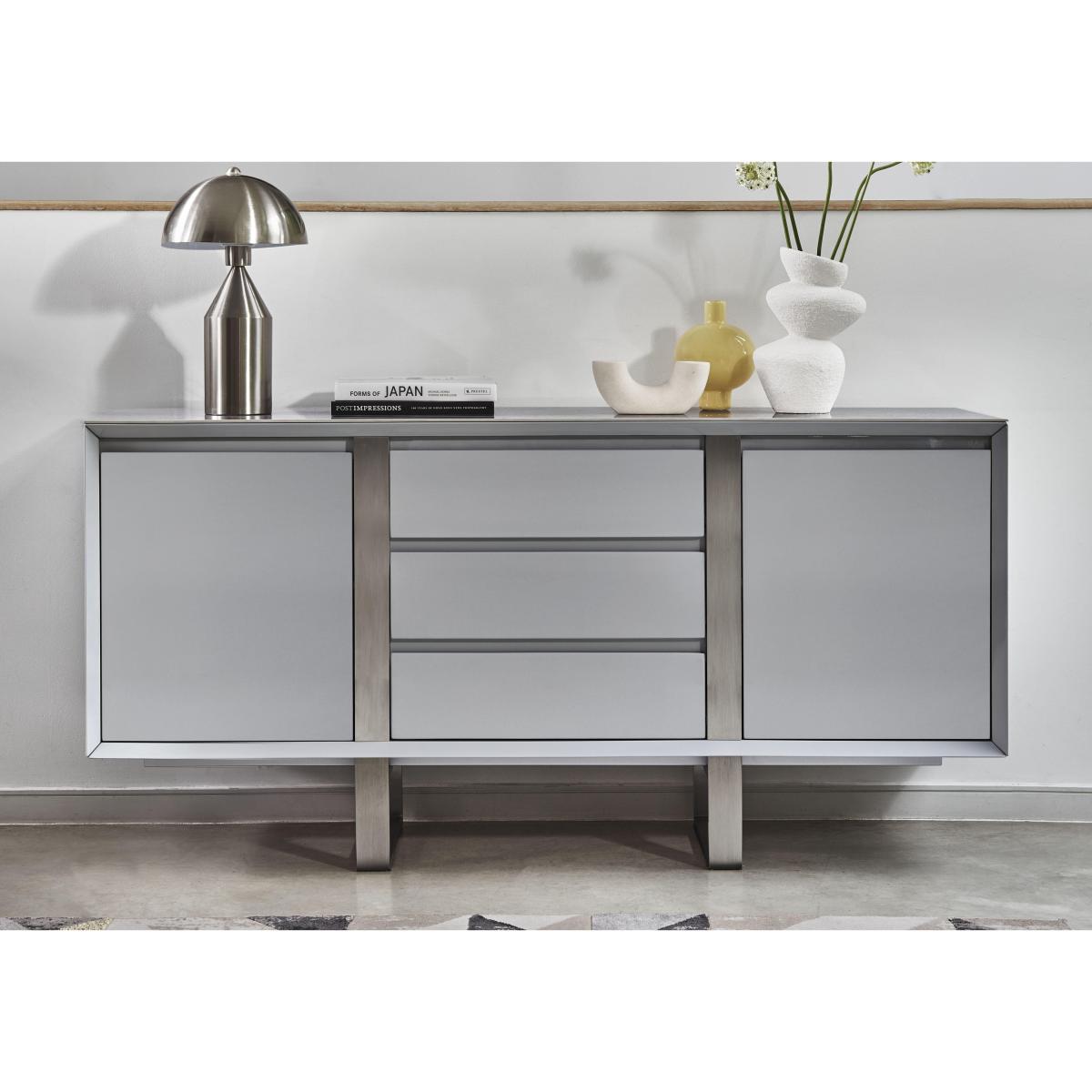 Love sophisticated elegant interior style? It’s time to get acquainted with our fabulous Grigio range. The look is striking – high-gloss, marble-patterned ceramic and brushed stainless steel – and it's a combination that ensures pieces are as durable and family-friendly as they are sleek and stylish. This extensive range offers a wide choice of furniture for living rooms, dining rooms, TV rooms and hallways with many pieces carefully proportioned for more compact spaces. You’ll find dining tables, dining room seating and dining sets, as well as storage pieces, occasional tables and even an entertainment centre. The Grigio range is exclusively available at Furniture Village. Practical storage plus a finish that brings the wow factor – this statement sideboard features a gorgeous marble-effect ceramic top and brushed stainless steel accents. Why you'll love it. Complete your on-trend dining room with this statement sideboard. Elegant modern style. High-gloss, marble-effect ceramic top is both beautiful and practical. Grey lacquered frame with brushed stainless steel accents. Brushed stainless steel U-shaped legs. Cupboard doors and drawers are soft-closing. Exclusive to Furniture Village. This sideboard is part of the Grigio range. What you need to know. 2 cupboards each with 1 adjustable shelf. 3 drawers. Please note that ceramic is not 100% heatproof. We recommend using coasters and placemats at all times. Easy to care for. Simply wipe with a clean damp cloth. WARNING!. Furniture can tip over unexpectedly and cause injury. This item must be fixed to a wall using the anti-tip kit provided. Be sure to use the correct wall fixings suitable for the walls in your home. Furniture Village is not able to fix anti-tip devices for you. Seek professional advice if you are unsure.