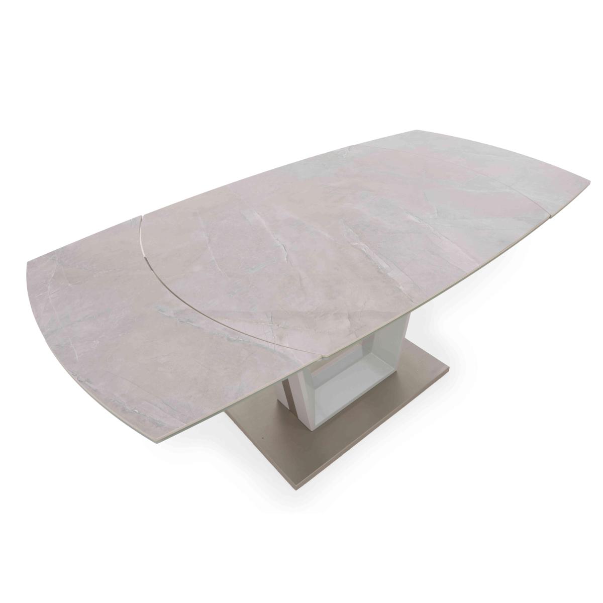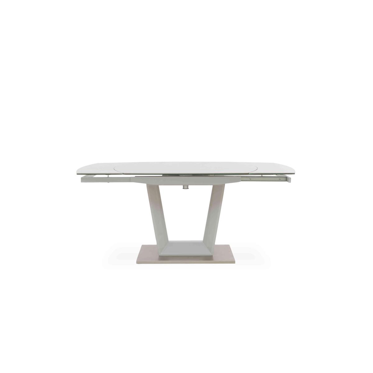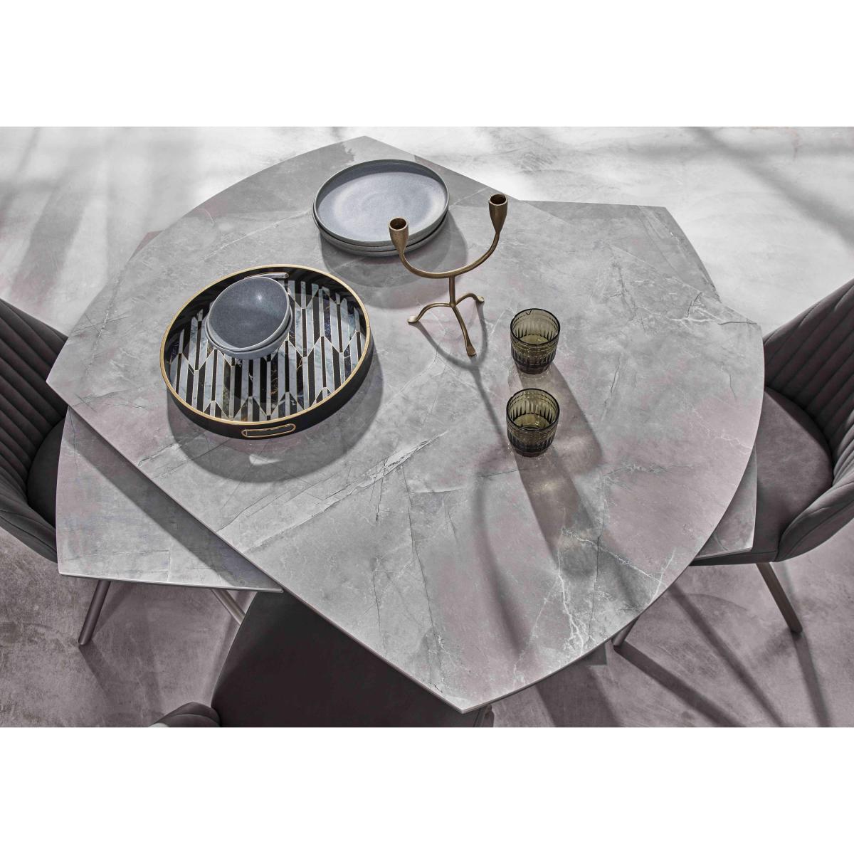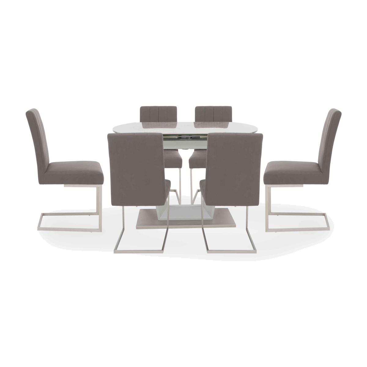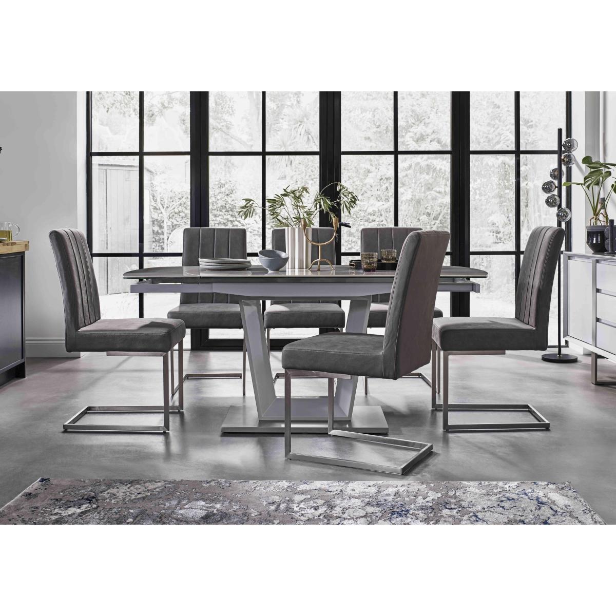Love sophisticated elegant interior style? It’s time to get acquainted with our fabulous Grigio range. The look is striking – high-gloss, marble-patterned ceramic and brushed stainless steel – and it's a combination that ensures pieces are as durable and family-friendly as they are sleek and stylish. This extensive range offers a wide choice of furniture for living rooms, dining rooms, TV rooms and hallways with many pieces carefully proportioned for more compact spaces. You’ll find dining tables, dining room seating and dining sets, as well as storage pieces, occasional tables and even an entertainment centre. The Grigio range is exclusively available at Furniture Village. It’s time to get the family over. Everyone will love this dining set’s swivel top extending dining table and comfy cantilever-base dining chairs. Why you'll love it This swivel-top dining set is perfect for family get togethers. Elegant modern style. High-gloss, marble-effect ceramic top is both beautiful and practical. Ceramic is highly durable, and heat-, scratch- and chip-resistant. With a clever swivel extension mechanism – the table top rotates to extend. U-shaped pedestal base has a brushed stainless steel-finished plinth. With 6 dining chairs. Grey fabric upholstery with understated vertical stitching. Cantilever bases have a brushed stainless steel finish. Exclusive to Furniture Village. This swivel extending dining set is part of the Grigio range. What you need to know Dining chairs are cushioned with foam. Swivel extending dining table seats 6 when closed and 8 when extended. Please note that ceramic is not 100% heatproof. We recommend using coasters and placemats at all times. Easy to care for. Simply wipe with a clean damp cloth.