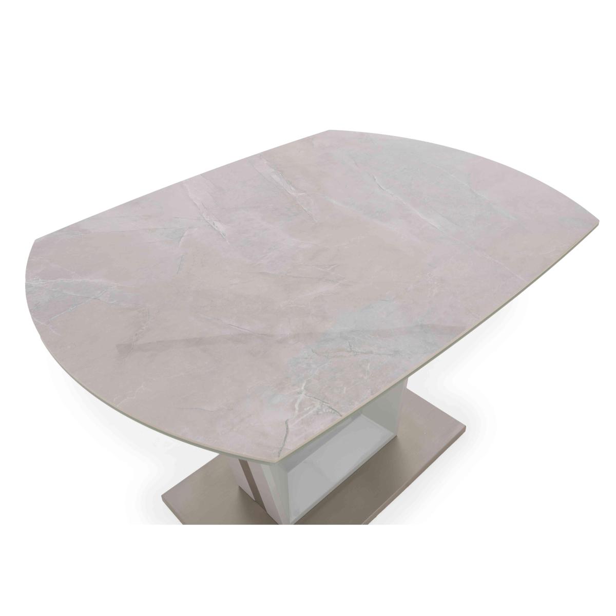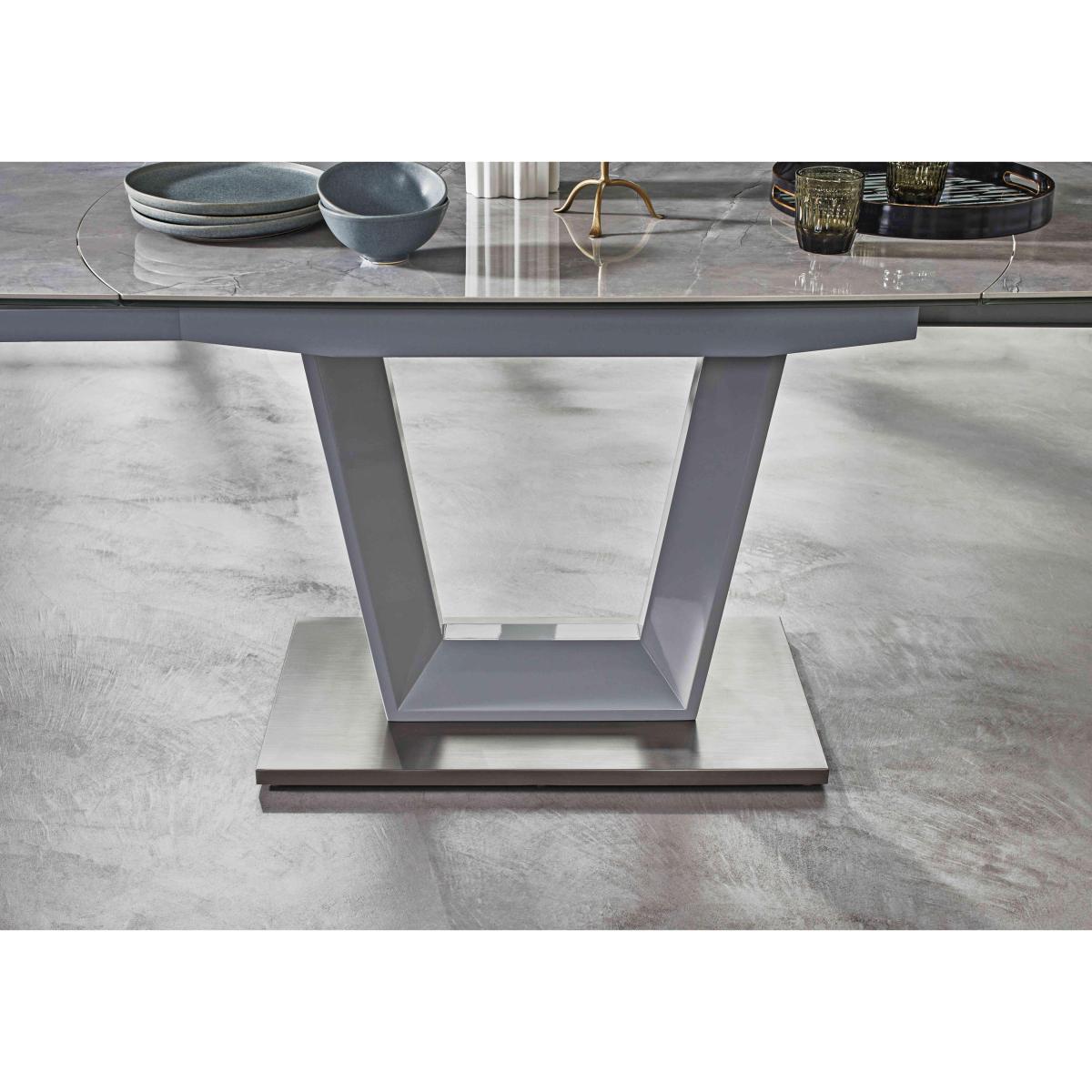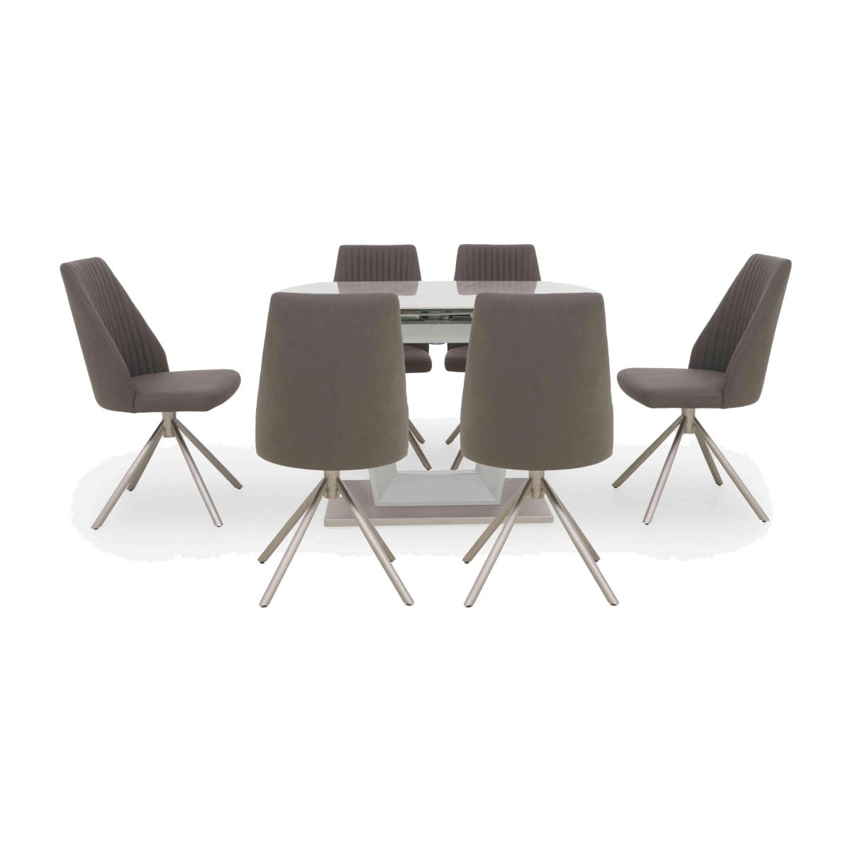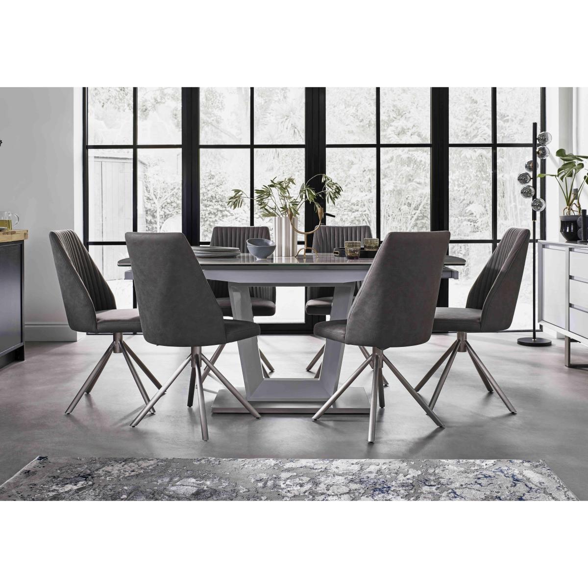 Love sophisticated elegant interior style? It’s time to get acquainted with our fabulous Grigio range. The look is striking – high-gloss, marble-patterned ceramic and brushed stainless steel – and it's a combination that ensures pieces are as durable and family-friendly as they are sleek and stylish. This extensive range offers a wide choice of furniture for living rooms, dining rooms, TV rooms and hallways with many pieces carefully proportioned for more compact spaces. You’ll find dining tables, dining room seating and dining sets, as well as storage pieces, occasional tables and even an entertainment centre. The Grigio range is exclusively available at Furniture Village. The epitome of sleek, modern furniture design, this fabulous dining set comprises a swivel-top ceramic extending dining table and six swivel-base dining chairs. Why you'll love it This space-saving dining set has a swivel-top extending dining table. Elegant modern style. High-gloss, marble-effect ceramic top is both beautiful and practical. Ceramic is highly durable, and heat-, scratch- and chip-resistant. With a clever swivel extension mechanism – the table top rotates to extend. U-shaped pedestal base has a brushed stainless steel-finished plinth. With 6 swivel-base dining chairs. Grey fabric upholstery with understated vertical stitching. Brushed stainless steel-finished legs. Exclusive to Furniture Village. This swivel extending dining set is part of the Grigio range. What you need to know Swivel dining chairs are cushioned with foam. Swivel extending dining table seats 6 when closed and 8 when extended. Please note that ceramic is not 100% heatproof. We recommend using coasters and placemats at all times. Easy to care for. Simply wipe with a clean damp cloth.