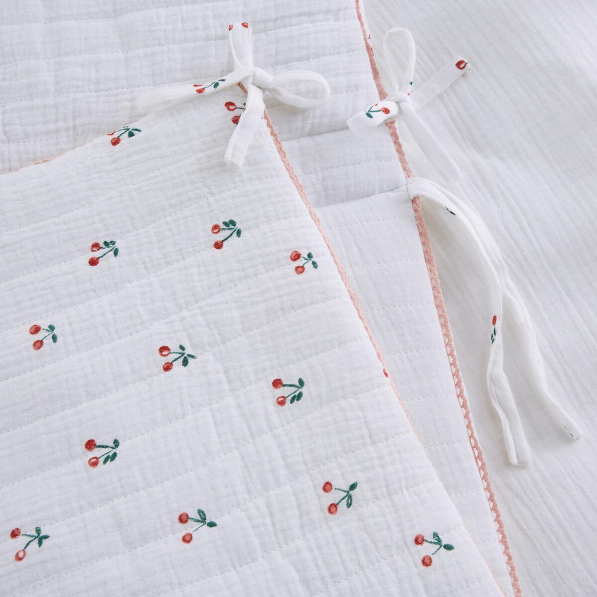 The Griotte cotton muslin cot bumper surrounds baby with its cherry print on an ecru background to create a cosy little nest.