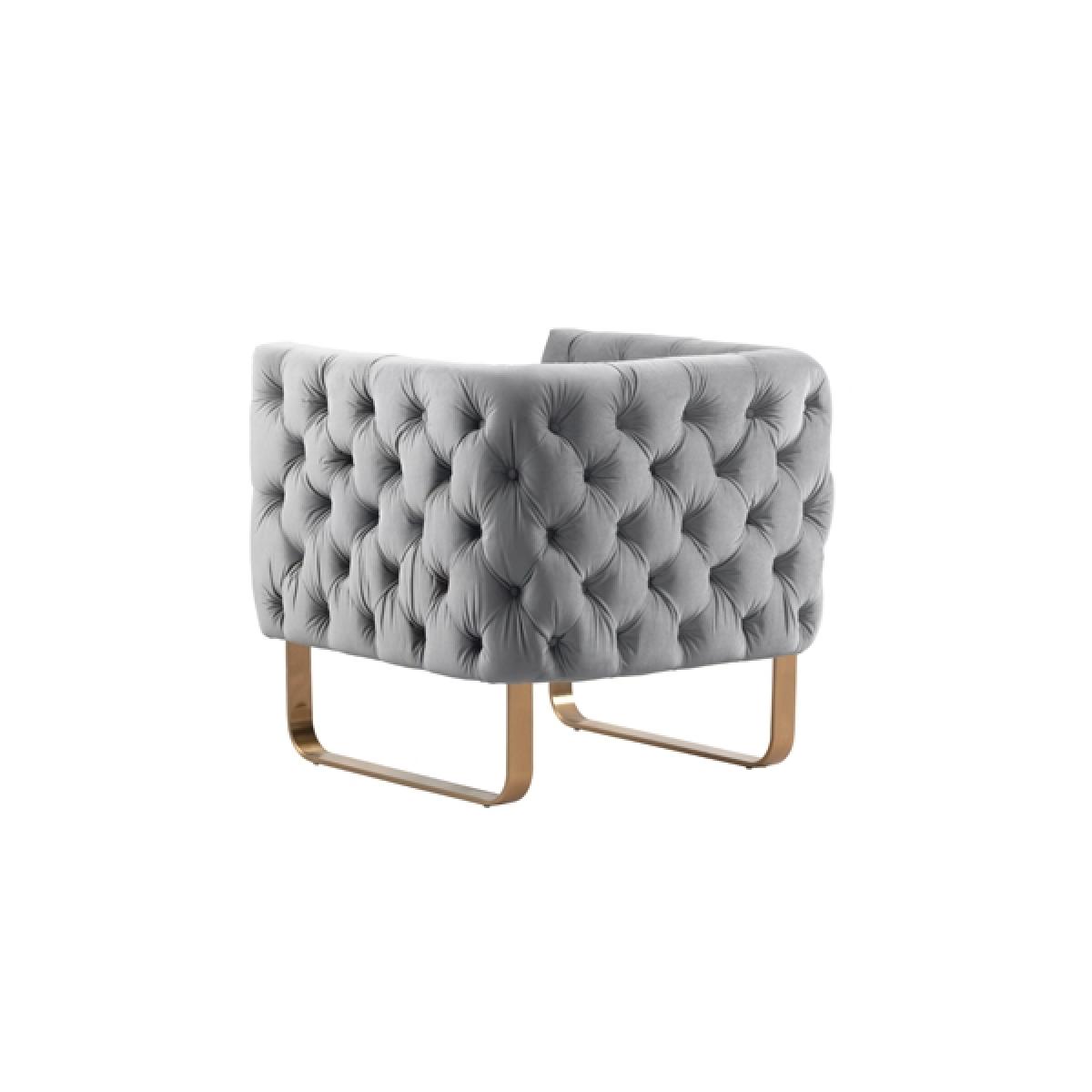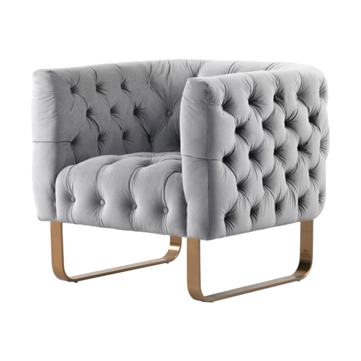 A skilfully handcrafted, deep buttoned armchair. Very comfortable foam and fibre seat with sprung base and backrest. Brushed stainless steel base with brass finish. Velvet upholstery fabric. Designed to co-ordinate with all items in our Frankfurt collection.