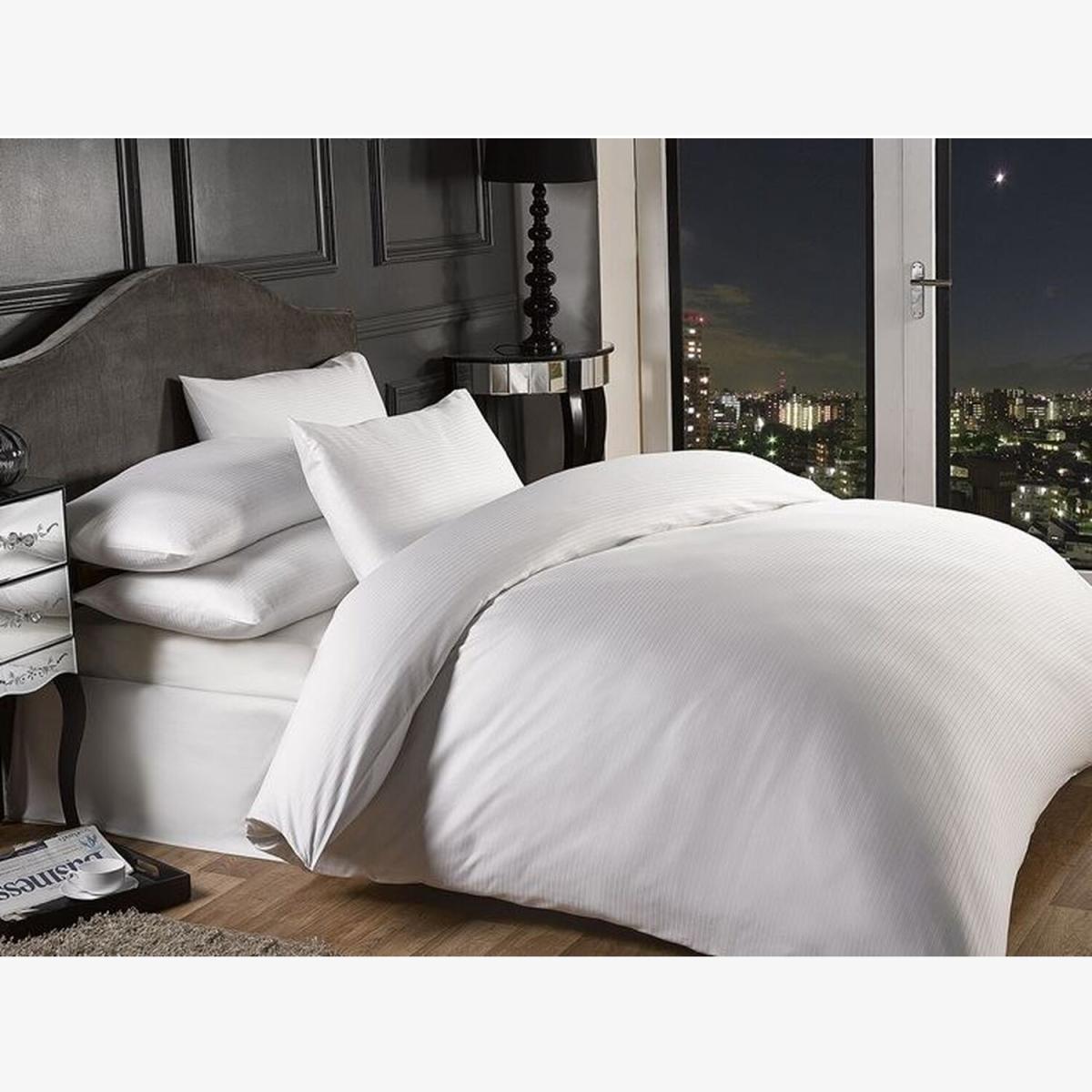 Adorn your bed in this alluring duvet cover and matching pillowcases bed set. The luxurious 1000 thread count fabric with a clean pin stripe design will add that hotel style look and comfort to your home. Also see separately in our store the selection of pillowcases and fitted sheets all made from soft cotton rich materials in the same modern design. Double duvet cover sets 200x200 cm plus 2 housewife pillowcases 50x75cm. King duvet cover sets 220x230 cm plus 2 housewife. pillowcases 50x75cm. Super king duvet cover sets 220x260 cm plus 2 housewife pillowcases 50x75cm. Also available are extra housewife pillowcase pairs 50x75cm and Oxford pillowcase (packed in singles) 50x75cm