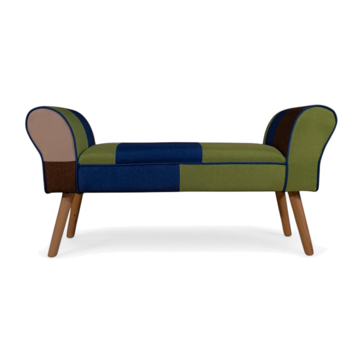 Contemporary patchwork style fabric chaise longue pouffe with light finished solid wood legs and padded seat. The printed fabric has the perfect fusion of contrasting pattern and colour with a modern eclectic feel. Each pouffe is unique due to the fabric print and is the perfect accent piece to add colour to any room. Seat 39cm high at front 43cm high in centre. Maximum weight limit 95kg 15 stone. Part of the Grove range a matching stool and storage chest are also available. Easy assembly - just add legs. Complies with UK Fire Retardant regulations.