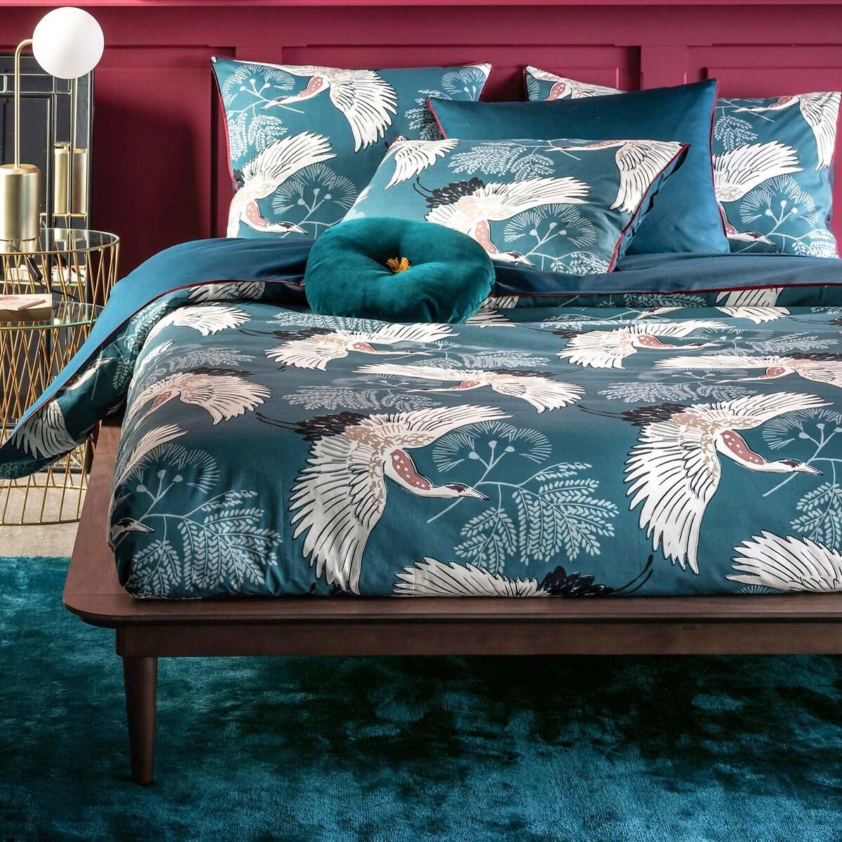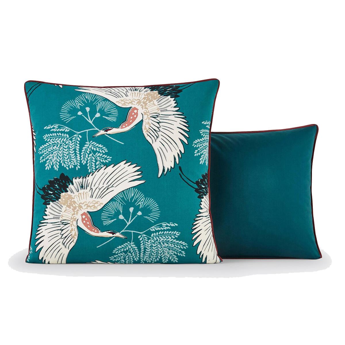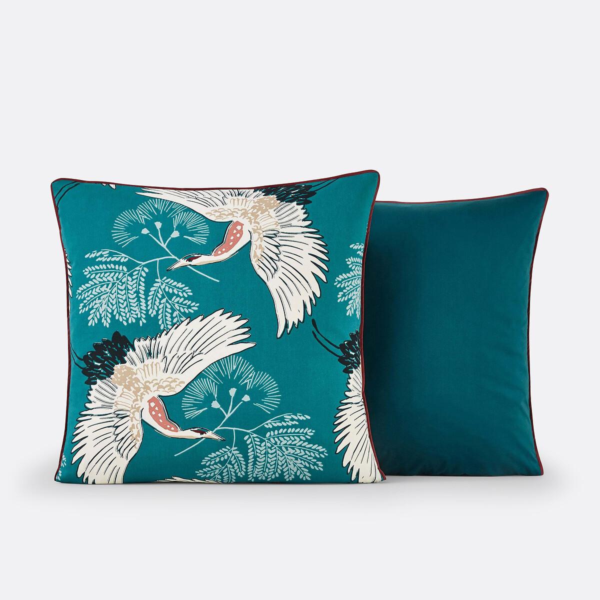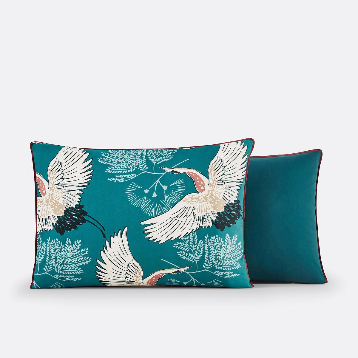 The Grues patterned percale pillowcase. Stylish and on trend, it features a vintage-inspired print of magnificent birds spreading their wings. The cotton percale offers a pleasant feeling of freshness and lightness. Its tight weave makes it particularly soft for premium comfort. A matte and smooth material that will soften over time. Product Details • 100% cotton • Percale • 180 thread count: The higher the thread count, the higher the quality of the weave • Bird print on the front, plain back • Contrasting taped edging. Care Advice • Machine washable at 60°C • By washing your laundry at 40°C instead of 60°C, you limit energy consumption. Sizes • 50 x 70cm: Rectangle cover • 63 x 63cm: Square cover • OEKO-TEX® Standard 100. Standard 100 certification by OEKO-TEX® tests textile products for harmful substances via an independent, international label.