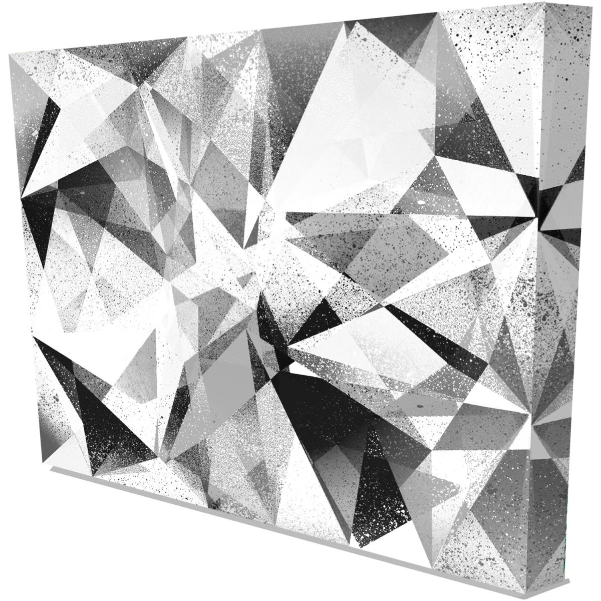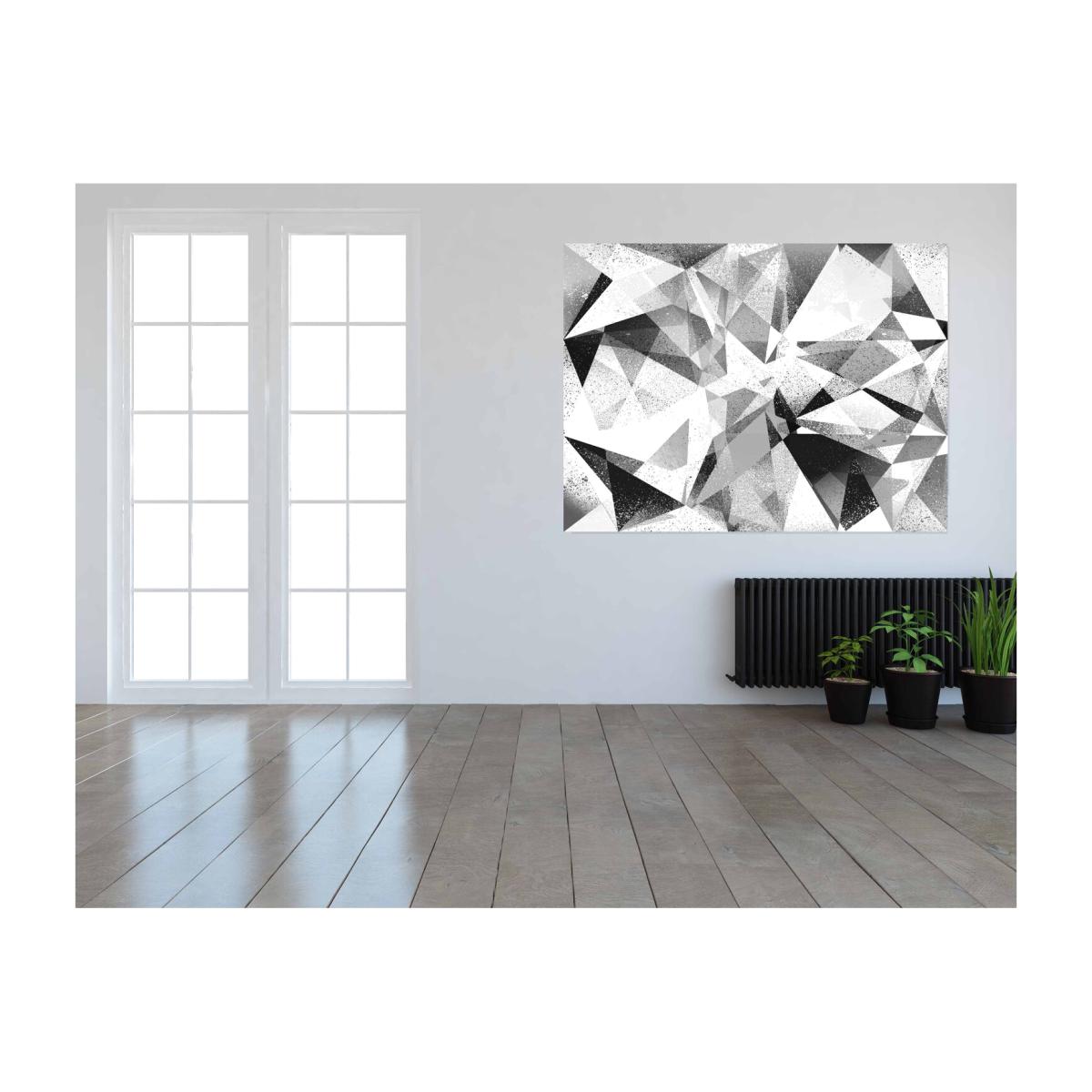 This piece, 'Grunge Geometric', is a great example of modern abstract artwork that adds a bold, contemporary touch to any space. I love it for its strong monochrome palette and dynamic pattern, making it versatile enough to work in both minimalist and industrial interiors. It pairs well with black or white furnishings and can act as a statement piece above a sofa or in a feature wall. Practical tips include keeping surrounding decor simple to let the artwork stand out or adding textured elements like a plush rug or soft cushions to balance the geometric sharpness. Its size makes it perfect for larger walls, offering a striking focal point that elevates the overall room aesthetic.