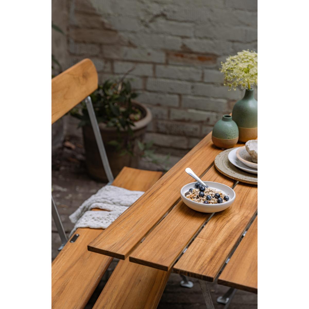 I’m a fan of the Bryggeri table for its clean lines and robust materials - the warm, oiled teak top sits neatly on a hot-dip galvanised steel frame, so it feels both refined and ready for everyday use. It suits modern Scandi schemes as well as pared-back industrial lofts or garden rooms. For styling, keep accessories simple: a monochrome ceramic vase or a pair of slim metal candleholders will echo the table’s metalwork without cluttering the surface. Pair with slim-profile chairs in a matching metal finish or with moulded seats in muted tones for a cohesive look.