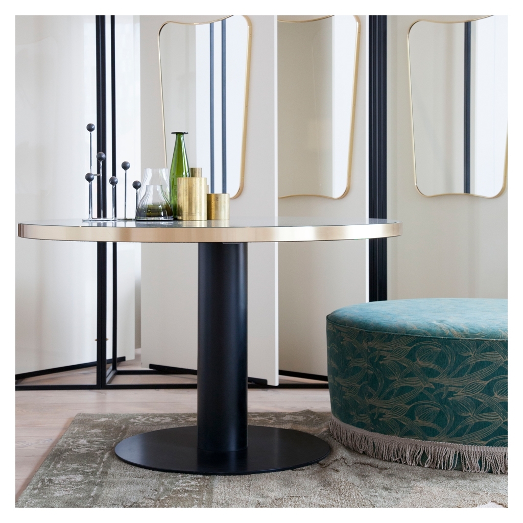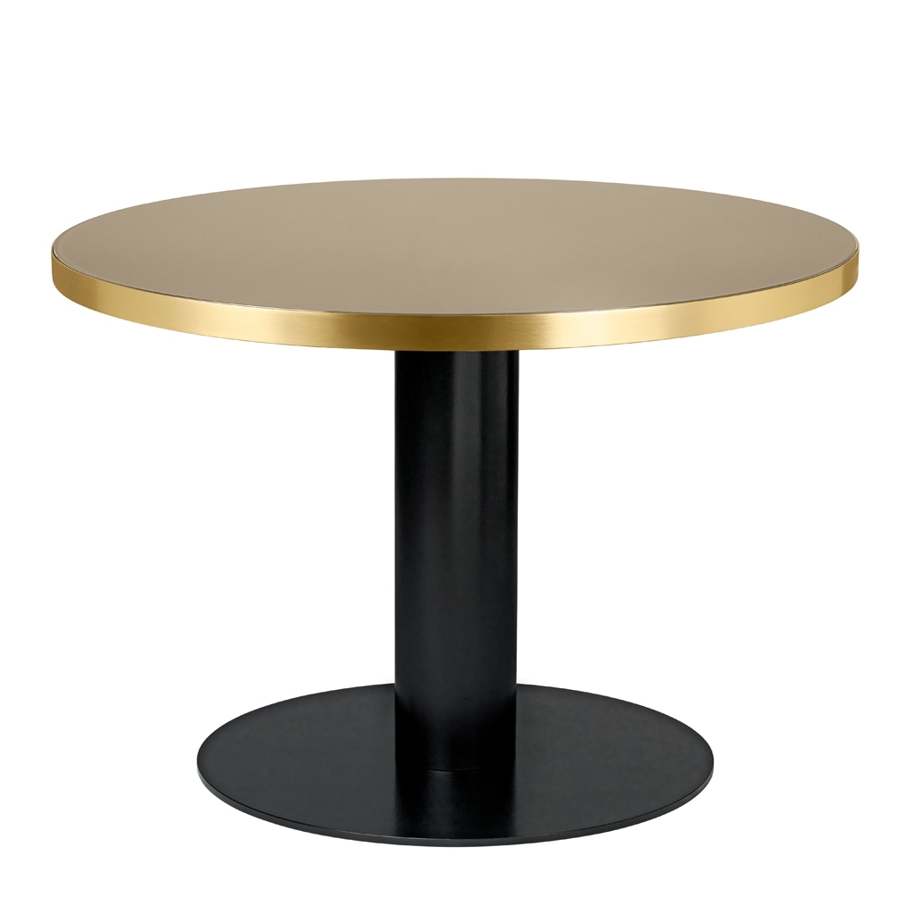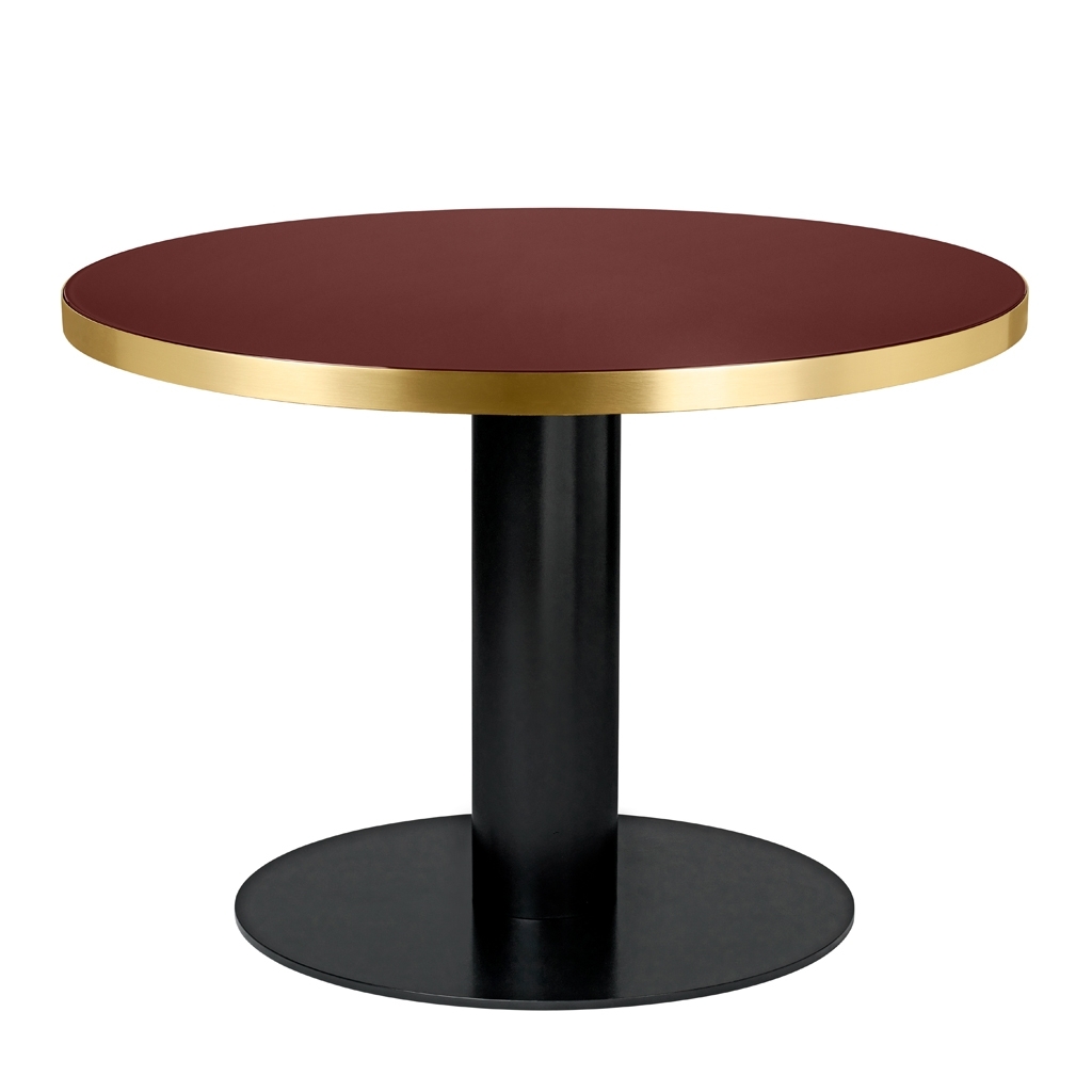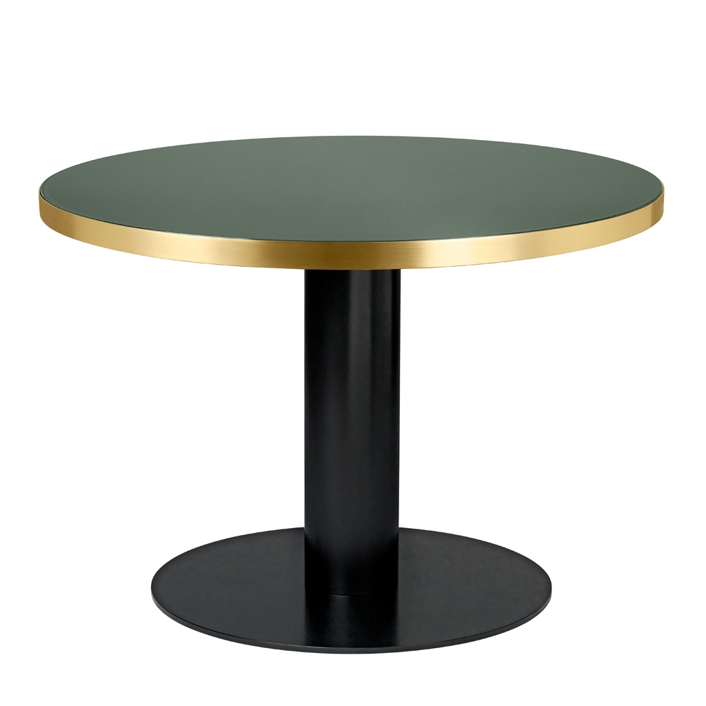 Driven by the desire of bringing friends together over dinner and a passion for contemporary design, Gubi designed the elegant circular small Gubi 2.0 Dining Table with a black base and coloured glass top. Crafted in Denmark from black powder-coated steel, the table's slender central column base is celebrated for its visual simplicity. Inspired by the characteristics of a circle, the table is topped with an elegant glass table top, available in bottle green, cherry red, granite grey and sand hues, and finished with brass detailing. Exemplifying modern design, this simple and elegant table would lend a touch of elegance to any dining area with its simple details and clean profile.