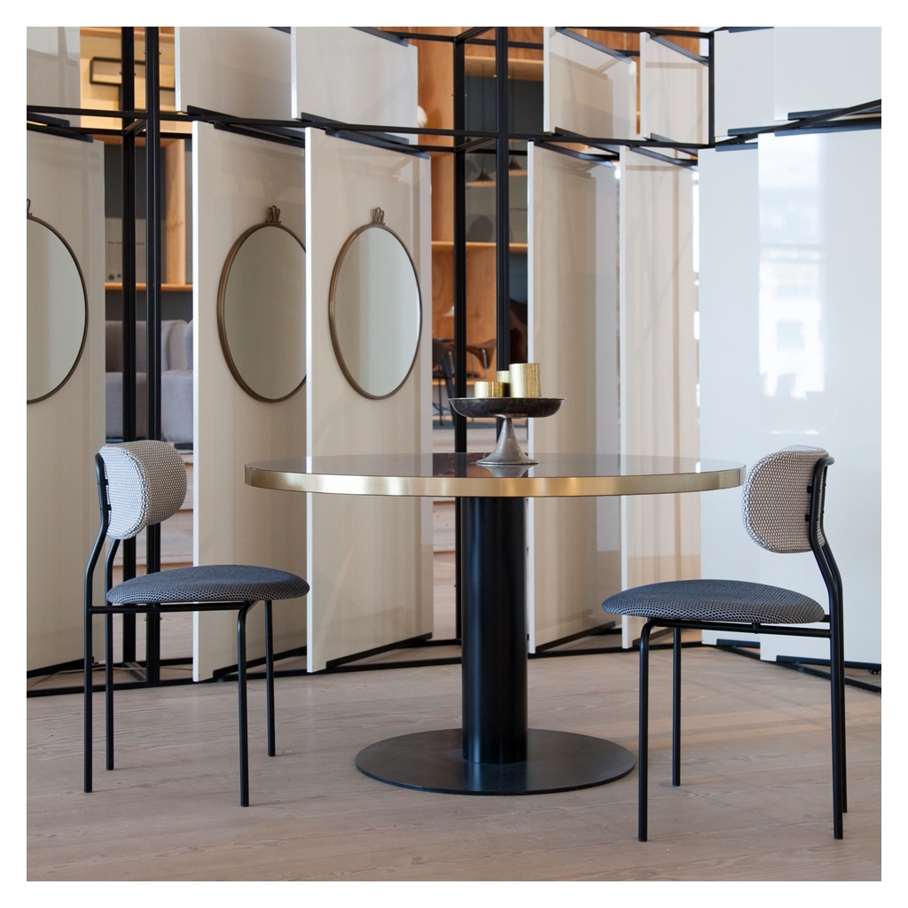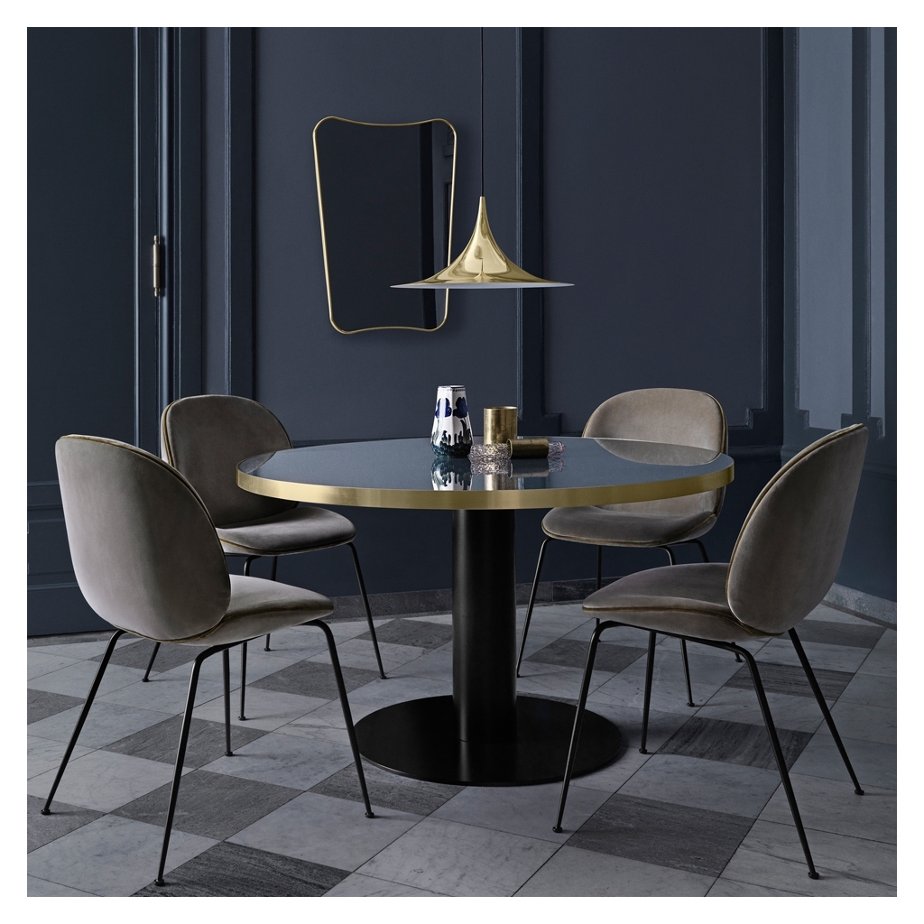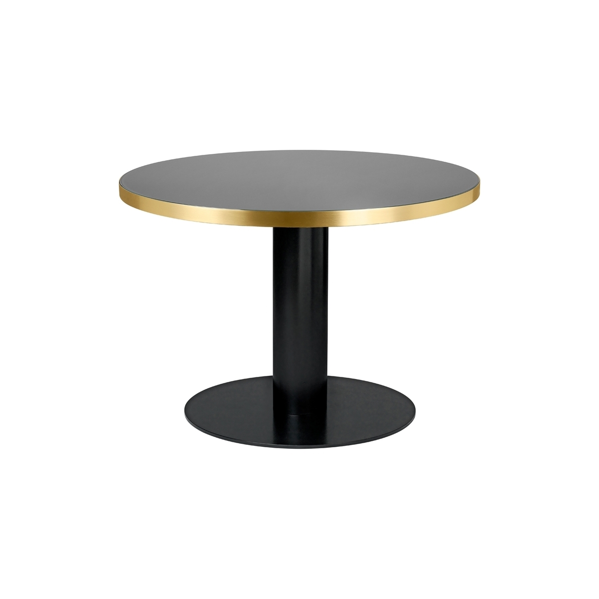 Driven by the desire of bringing friends together over dinner and a passion for contemporary design, Gubi designed the elegant circular small Gubi 2.0 Dining Table with a black base and coloured glass top. Crafted in Denmark from black powder-coated steel, the table's slender central column base is celebrated for its visual simplicity. Inspired by the characteristics of a circle, the table is topped with an elegant glass table top, available in bottle green, cherry red, granite grey and sand hues, and finished with brass detailing. Exemplifying modern design, this simple and elegant table would lend a touch of elegance to any dining area with its simple details and clean profile.