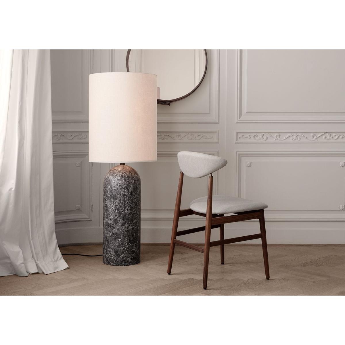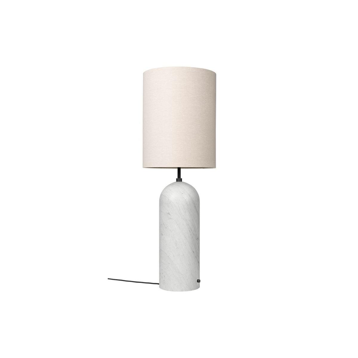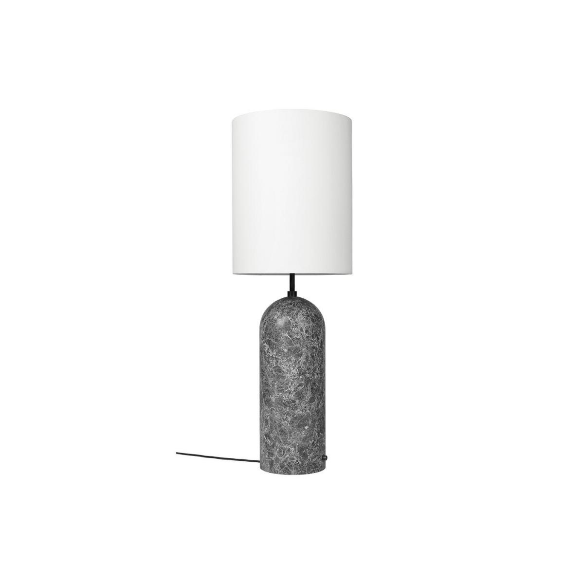 The contemporary Gravity XL High Floor Lamp was created by Danish design duo Space Copenhagen for Gubi. The lamp features a base crafted from solid marble in black, grey or white finishes and is completed with a traditional lampshade in white or canvas hues. Modelled in the style of a traditional table lamp, the effortlessly refined floor light will cast an atmospheric glow throughout the room.