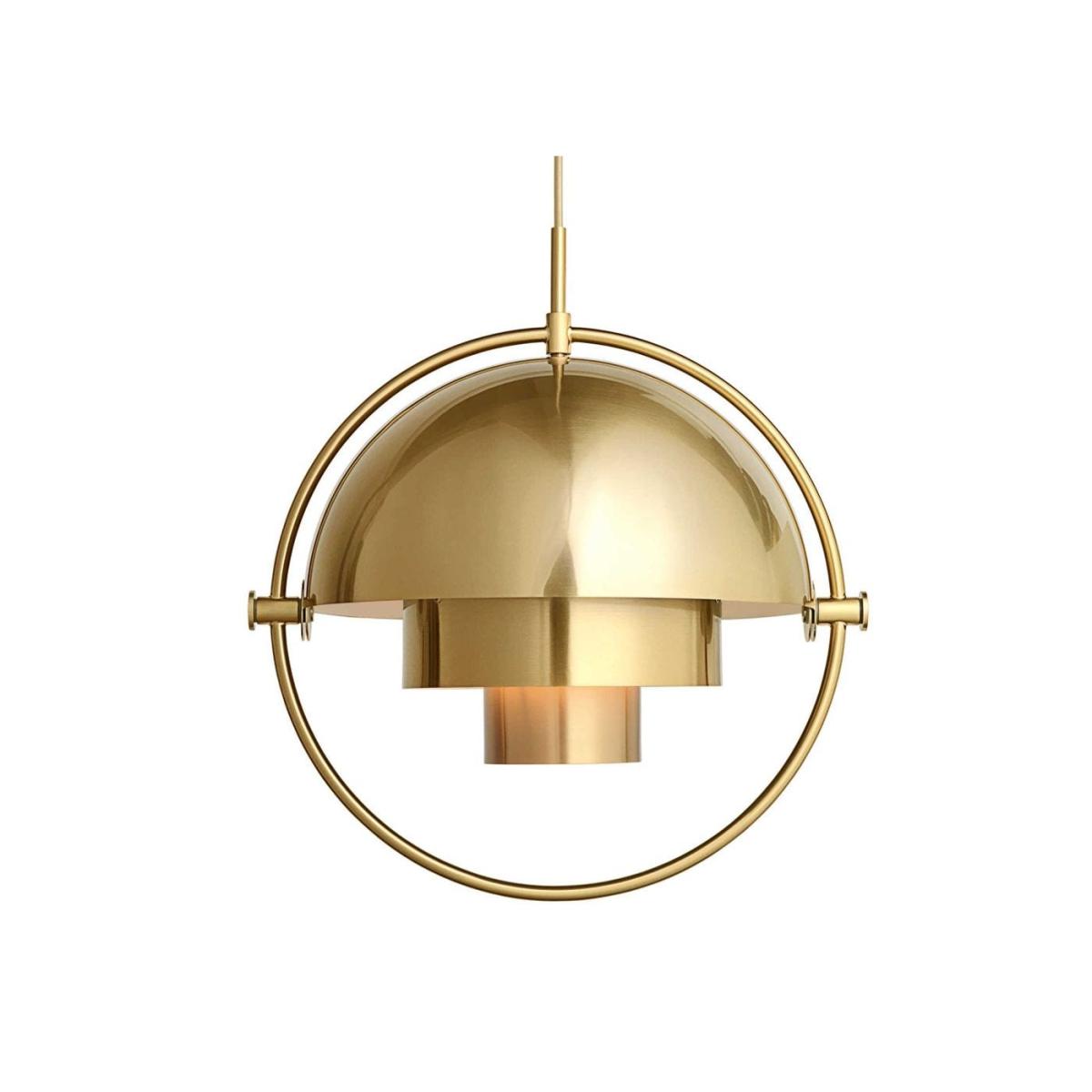 Louis Weisdorf first designed the brass Multi-Lite Pendant Light in 1972, marking a step away from his typical signature of using multiple repeating elements and reflecting his passion for diversity. The light is made up of two cylindrical shapes encompassed by a brass ring, surrounded by two quarter-spherical shades. The shades are adjustable so you can customise the Multi-Lite Pendant Light to suit your space.