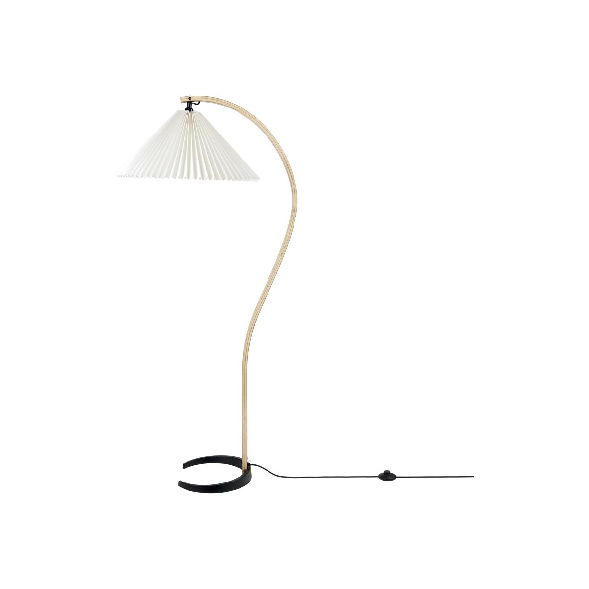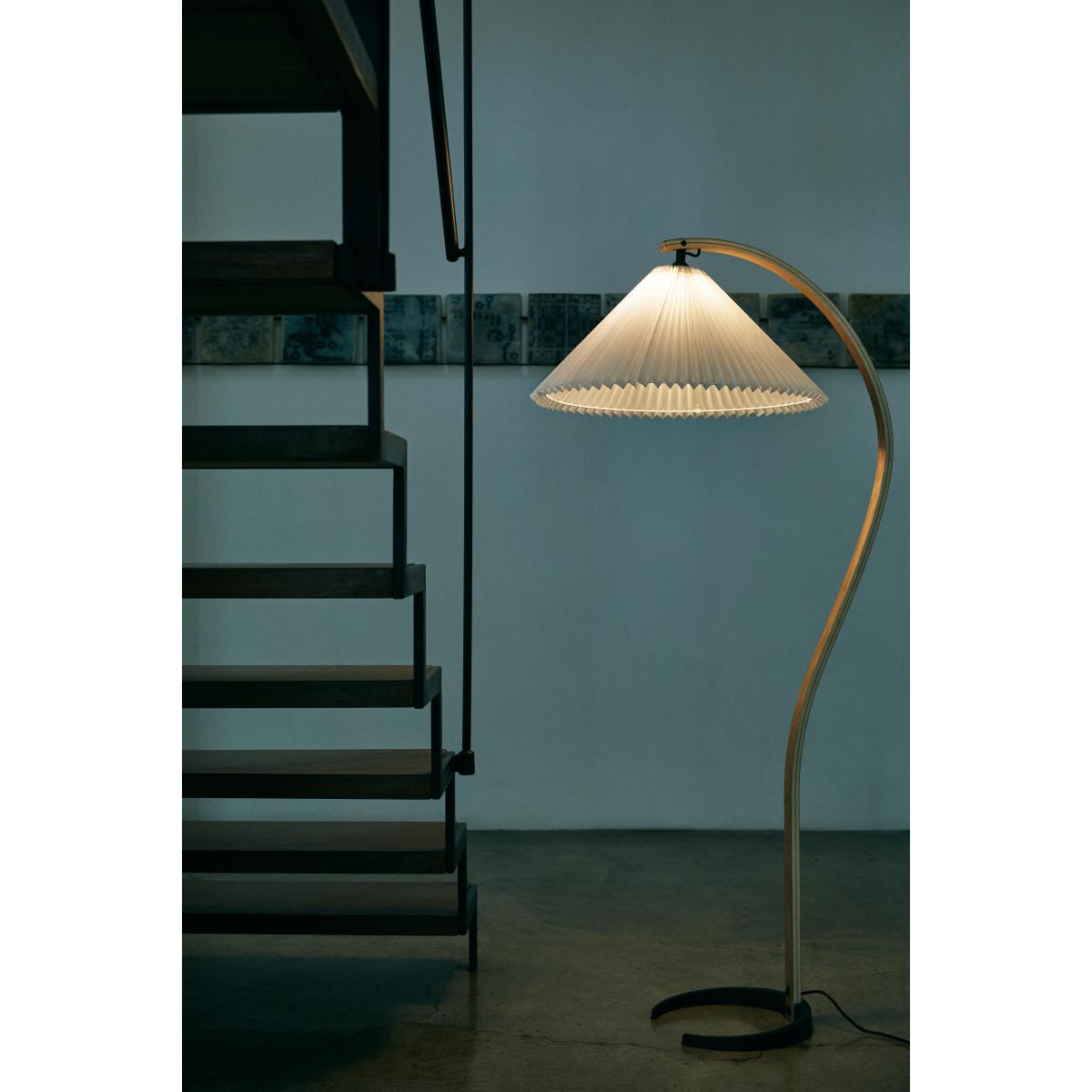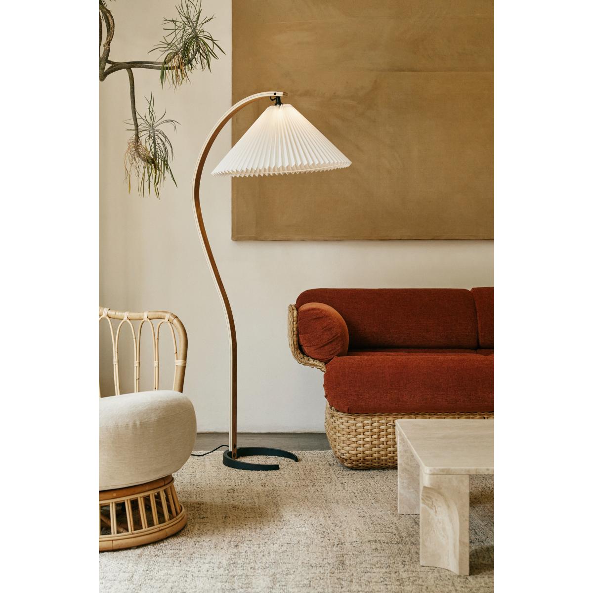The Timberline floor lamp from Gubi was designed in the 1970s by Mads Caprani. The playful and organic shape, along with the choice of materials, gives the Timberline floor lamp a unique appearance. The cord for the light source is integrated into the curved wooden arm that the lampshade is attached to, becoming a decorative design element. The lampshade can be directed as needed.