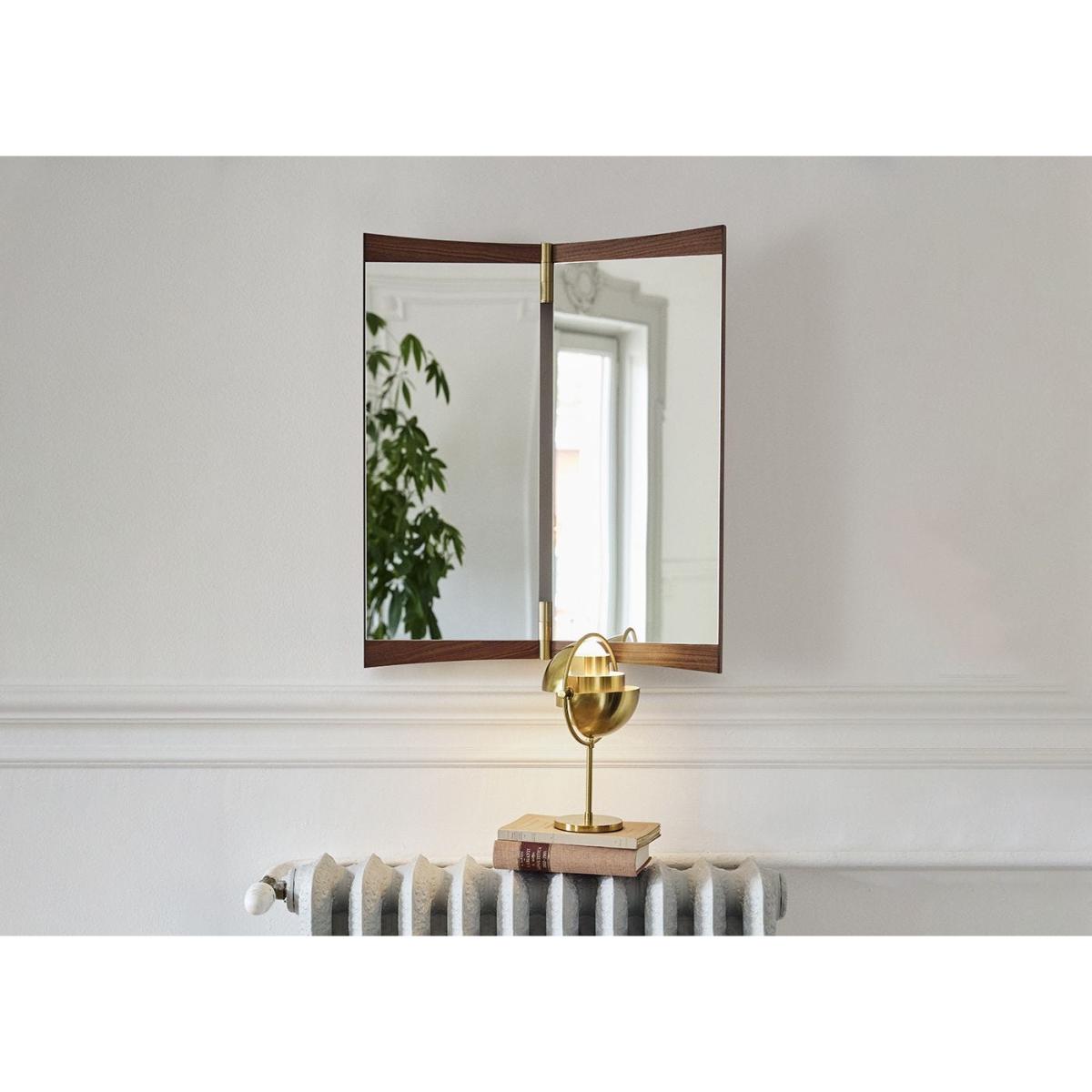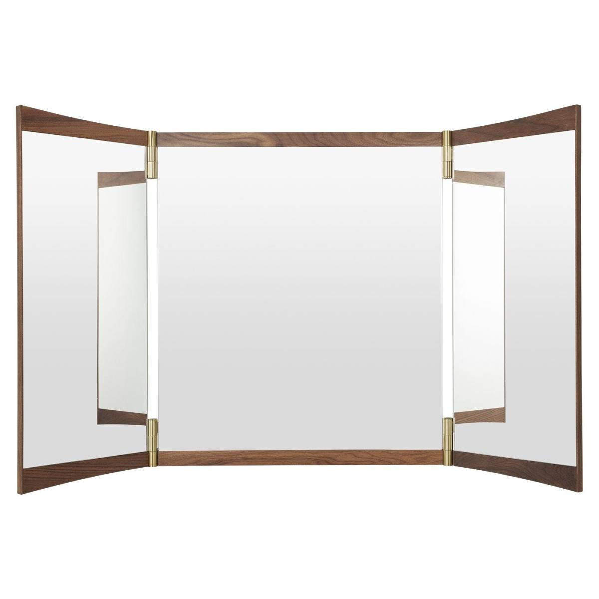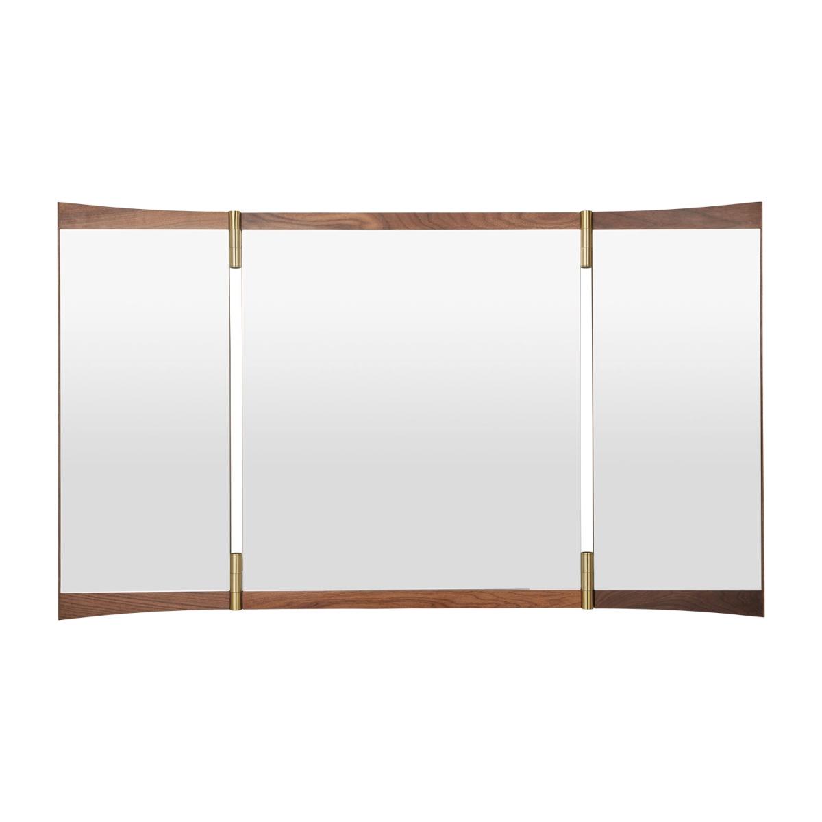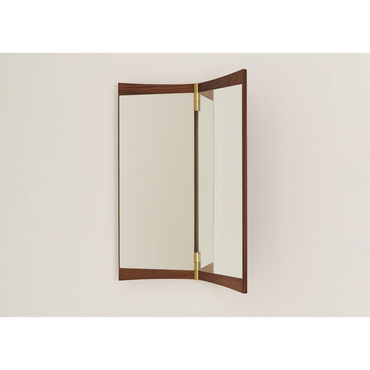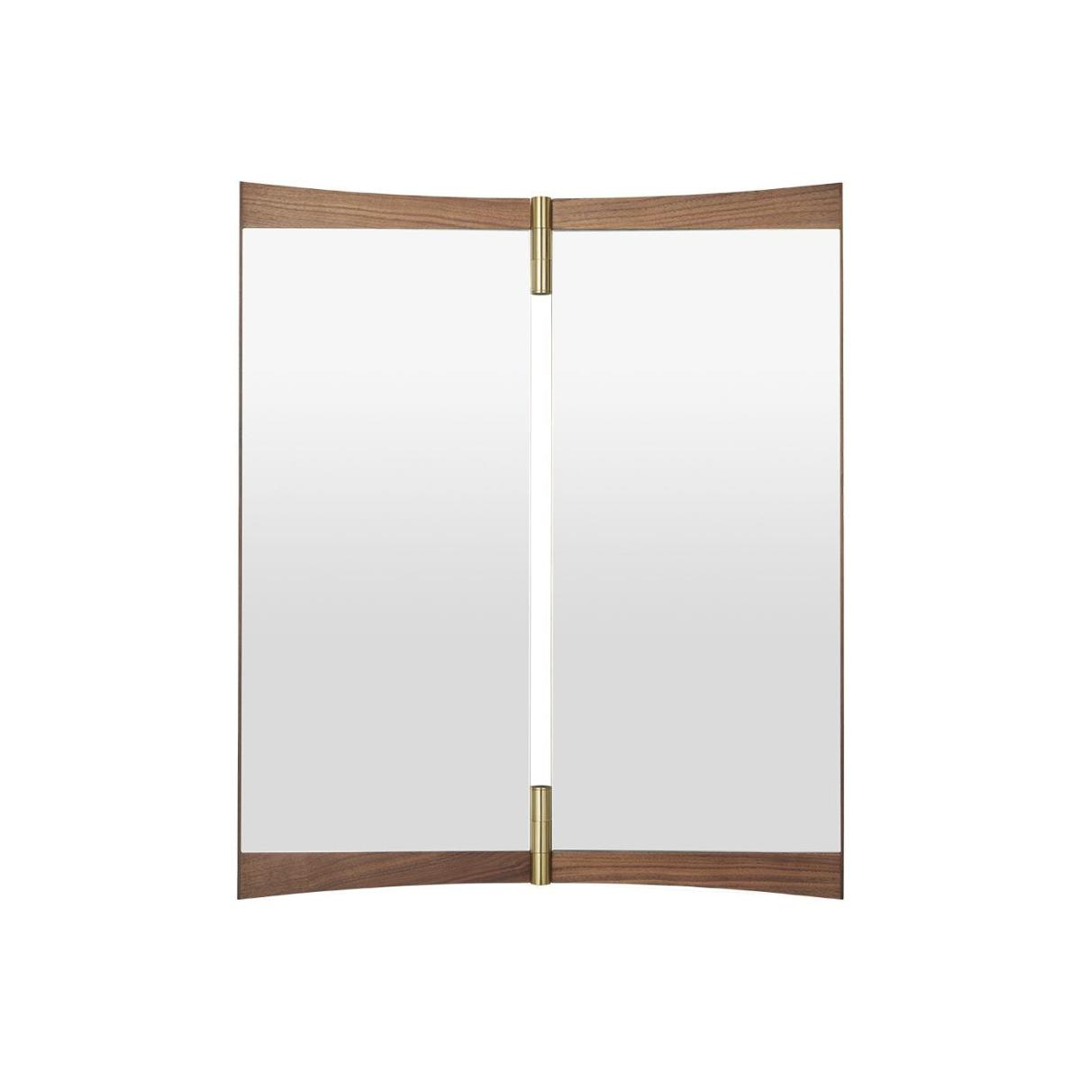 A contemporary echo of the 18th-century vanity-table mirror that gives it its name, the Vanity Mirror Collection is Gam. Fratesi’s second wall-mounted mirror design for GUBI. The collection comprises three variations – with one, two and three mirror panels, respectively. The design’s defining features are its warm walnut veneer and brass hinges. These allow the angle of the mirror to be adjusted, influencing the perspective it offers and the play of the light in the room. On the single-panel Vanity Mirror 1, the hinges permit a 15° rotation, whereas the 180° hinges on the Vanity Mirror 2 and Vanity Mirror 3 allow the panels to fold flat on top of one another, covering the mirror when not in use.