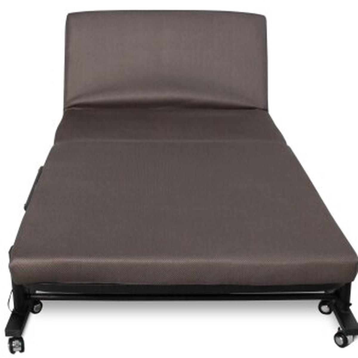 A strong metal folding bed perfect for when you have unexpected guests visiting. The adjustable back rest can be moved to 6 different heights, which allows you to find the perfect position for comfort when sleeping, watching TV or relaxing. The guest bed folds in half for easy storage and is on 360 spinning wheels for easy transportation. The foam mattress provides the perfect amount of support and the metal frame is strong, durable and ideal for multiple use.
