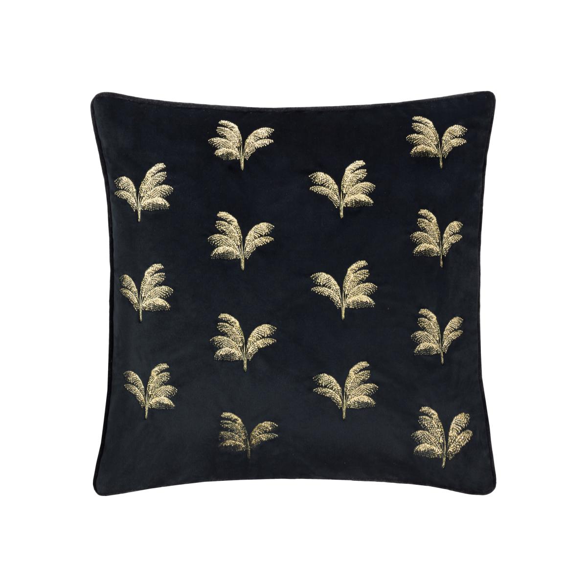 Transform your living space with the Guilded Palms Embroidered Cushion, the perfect blend of elegance and comfort. This opulent cushion boasts a luxuriously soft velvet base adorned with intricate metallic embroidery depicting serene palm leaves. The rich texture of the velvet combines with the shimmering embroidery to create a striking balance of modern sophistication and timeless charm. Designed for those who value understated luxury and meticulous attention to detail, this cushion will effortlessly elevate any space into a haven of style and relaxation. Add an unmistakably refined finish to a sofa, armchair or bed, and indulge in its inviting presence.