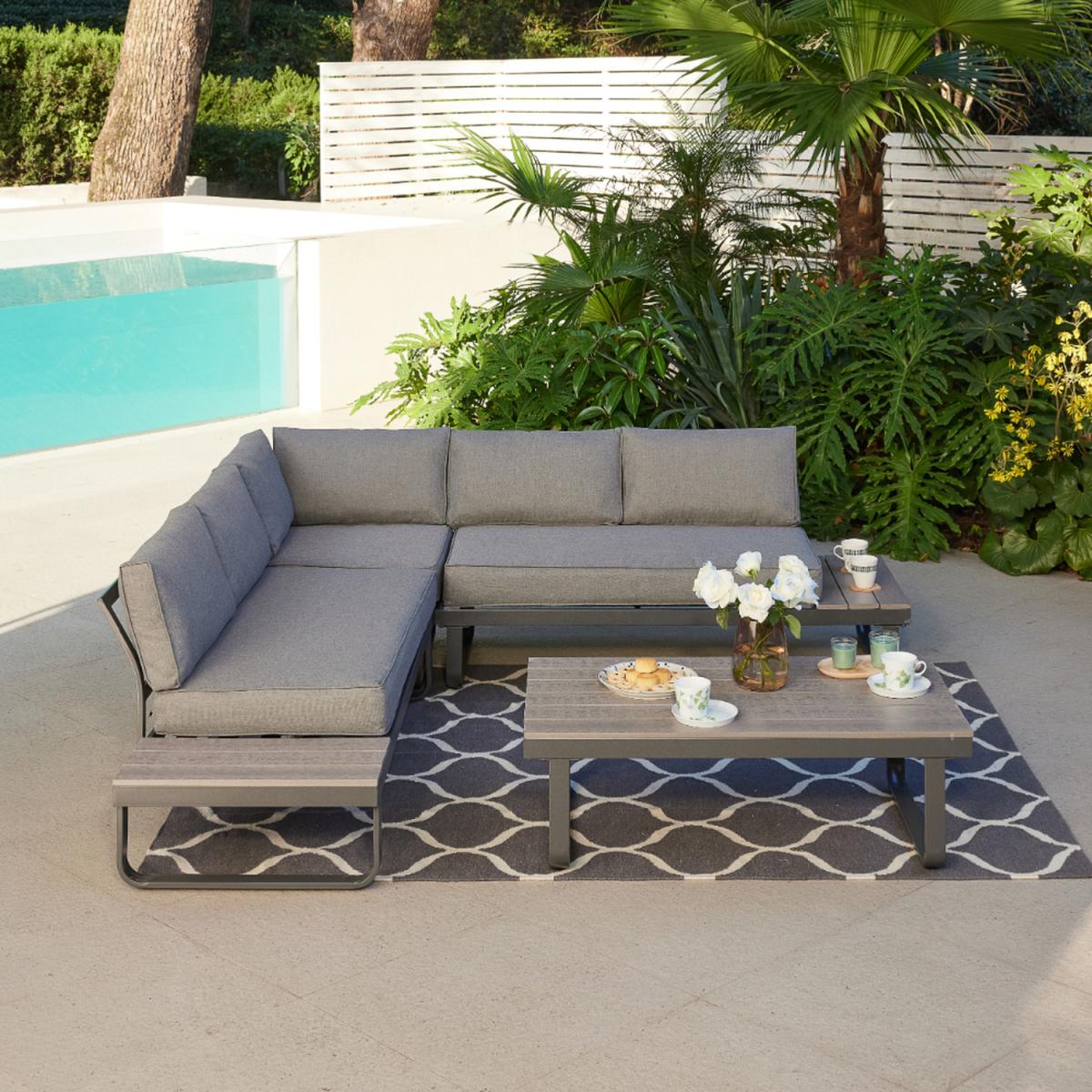 Introducing our luxurious metal Guimar corner garden sofa range. Upgrade your outdoor space with this gorgeous steel framed garden range. This corner garden sofa has been designed with built-in polywood tables at the end of the sofa for additional space for drinks. No need to bend over to the coffee table! The Guimar garden set has been designed with a gorgeous steel metal back design. Available in a sleek grey metal frame and gorgeous grey cushions. Comes a corner sofa and a polywood topped coffee table. We recommend that you use the provided garden furniture cover when not in use, and bring your cushions indoors for longevity. This garden set is a large item, therefore we require you to ensure it will fit through any access doors and walkways up to and within around your property. Minimum door width of 80cm. All sizes are approximate, please allow for small variations.