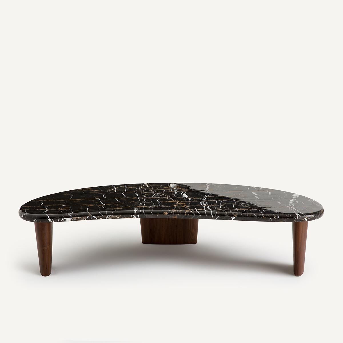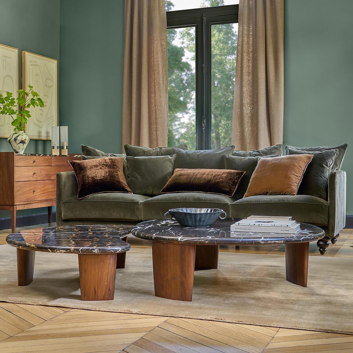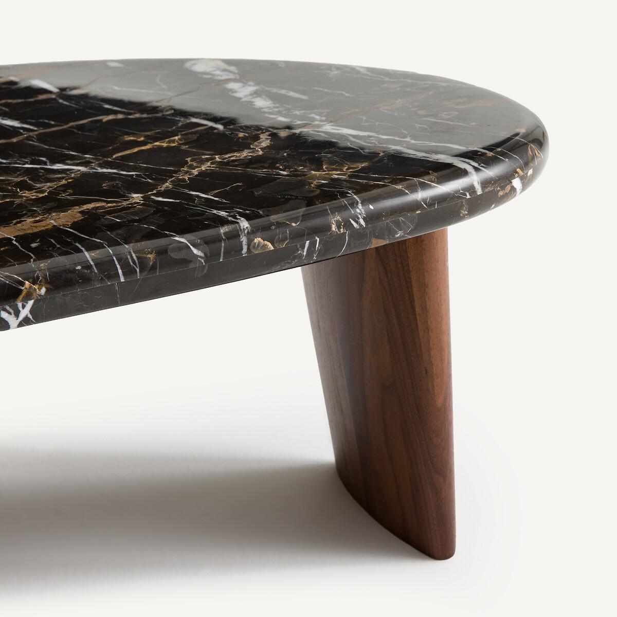 With its organic curves, : the Guimel coffee table takes the shape of a pebble. And it gives free rein to the material, amber marble, a noble stone with warm tones. Guimel is an exclusive piece of furniture designed for AMPM.Product Details • Top in amber marble, each piece is unique, with varying degrees of marbling and roughness • Underside of top in walnut veneered MDF, polyurethane finish • Sculptural legs in solid walnut, polyurethane finish. Care Advice. Marble is a naturally porous material that is susceptible to stains. To keep it in good condition, follow the maintenance advice below: • Avoid placing hot objects on the surface, use coasters and trivets. • Immediately wipe up any spilled liquid with a white cloth dipped in lukewarm water and wrung out. • Regularly maintain your furniture with products from our partner Akemi®. • We advise you to use Akemi® Crystal Clean Spray for your daily maintenance and, at least once a month, Akemi® Triple Effect Spray to clean and protect your marble surface.. This will reinforce the initial treatment and its water-repellent effect will prevent dirt from penetrating the material easily. • If you want to use products other than those of our partner Akemi®, choose only p. H-neutral cleaners. • Acid, anti-limescale or bleach-based products are not recommended. Dimensions • Width: 129.8cm • Height: 29cm • Depth: 82.4 cm • Assembly required. • WOOD FROM SUSTAINABLY MANAGED FORESTS. FSC® certified wood comes from forests that are environmentally, socially and economically well managed. Dimensions and weight of parcel2 parcels • W143 x H14.5 x D89.5cm, 55.4kg • W44 x H32 x D40.5cm, 10.9kg