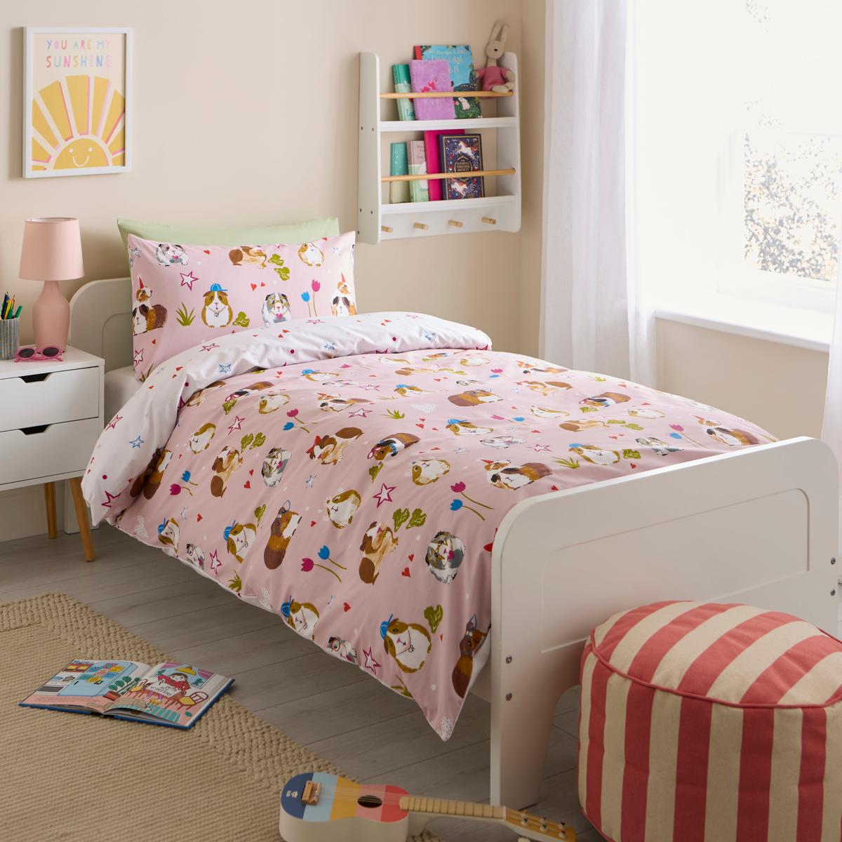 This guinea pig duvet set is a charming choice for adding a playful touch to a child's bedroom. Its soft pink background and adorable animal prints work particularly well in light, neutral, or pastel colour schemes, creating a friendly and inviting space. To style it effectively, consider pairing it with coordinating or contrasting cushions and a cosy throw to add texture and depth. It also lends itself well to playful accessories like stuffed animals or themed storage baskets. For practicality, opt for a simple, clutter-free look around the bed to let the pattern stand out, and ensure the bedding is easy to wash-perfect for a child's room. Overall, it’s a fun and cheerful addition that helps create a lively, yet gentle environment suitable for both present enjoyment and growth.