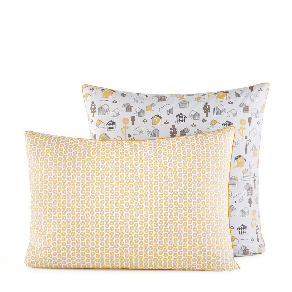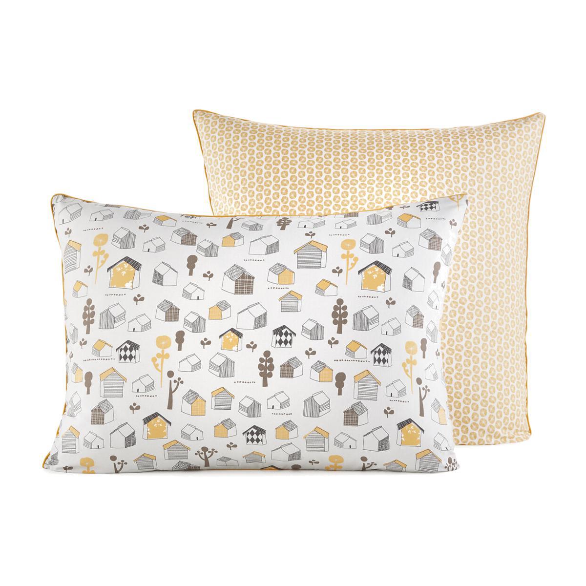 Gumby pillowcase, 1 side printed with cabins, 1 side patterned with flowers on a grey background. Made from pure 100% cotton percale (80 threads / cm2) from organic farming, soft, pleasant and healthy on your child's skin. Product Details. Pure cotton from organic farming. 1 side printed with cabins, 1 side printed with flowers. Pillowcase washable at 40 °CAdditional Information. Organic cotton: grown without the use of pesticides or chemical products. Organic farming protects the environment and the health of those who harvest it. Our organic cotton bed linen is very soft and gentle against your skin. Size. 50 x 70cm: Rectangular. 65 x 65cm: Square Additional Information. This product labelled STANDARD 100 by OEKO-TEX® - certificate no. CQ 1102/4 IFTH follows a certified and controlled manufacturing process which is respectful of your skin. The STANDARD 100 by OEKO-TEX® is the first label that meets the needs of consumers in terms of human ecology. It guarantees the absence of harmful substances or those potentially presenting a risk to health.