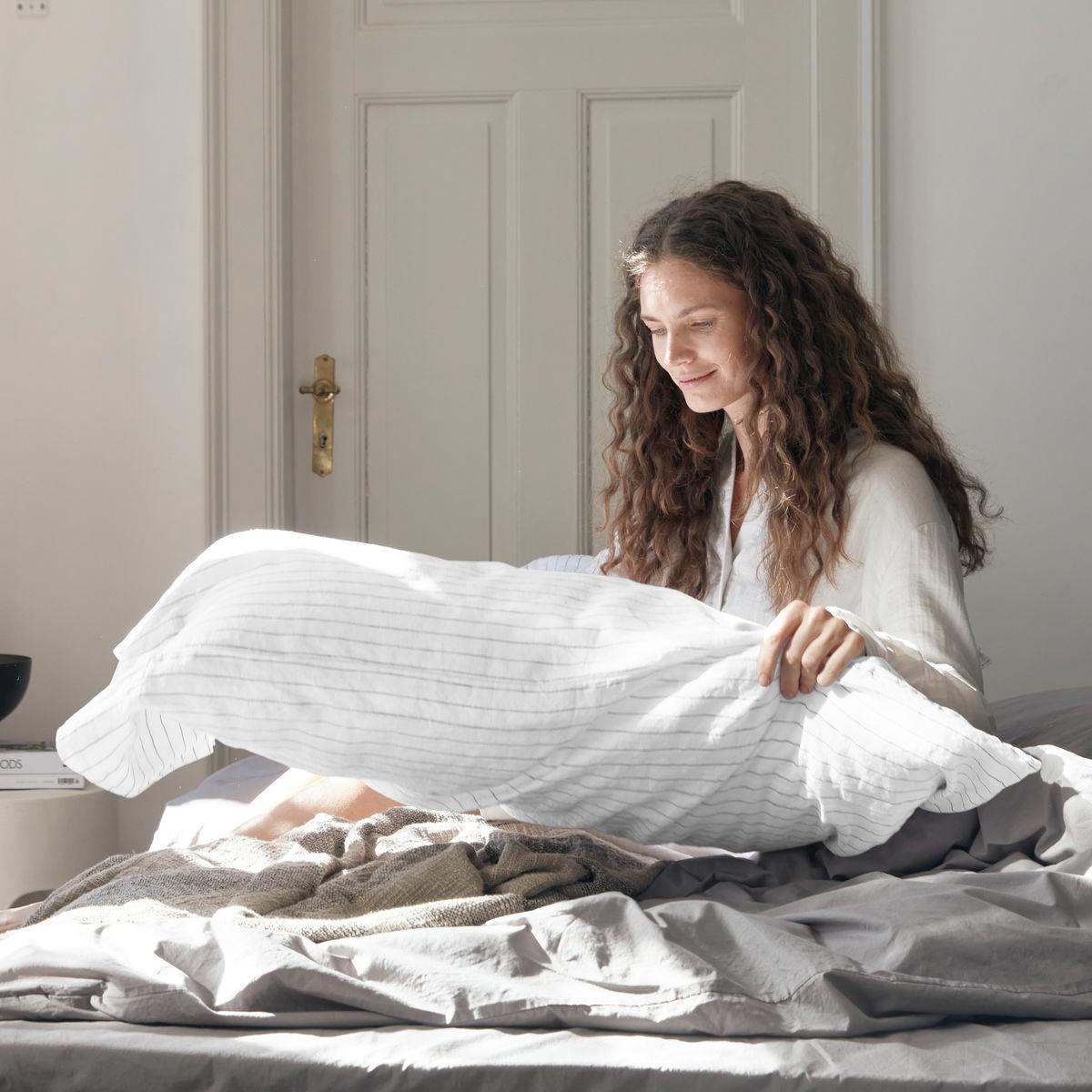 The Gunhild pillowcase in Snow-coal offers a subtle, sophisticated look that works well in both modern and Scandinavian-inspired interiors. I love its understated striped pattern, which adds visual interest without overwhelming the space. It’s quite versatile - it pairs beautifully with crisp white bed linens for a minimalist aesthetic, or can be layered with textured throws and cushions in neutral tones for a cosy, layered feel. Practical styling tips include mixing it with different textures, like knitted or linen elements, to create a balanced and inviting bedscape. Its neutral tones also make it easy to refresh with seasonal accessories or different colour accents down the line.