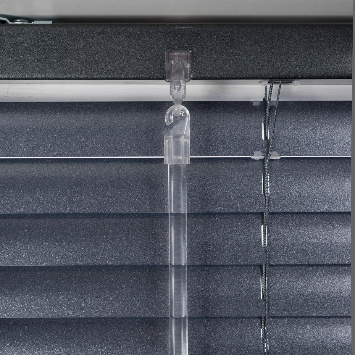 Designed with a metallic finish in a gunmetal grey colourway and made from durable aluminium, this metal Venetian blind features 25mm width slats, an easy to use cord for adjusting light and privacy and is supplied with fixtures included. This Venetian blind is available in a range of sizes and can be cut down in size if necessary. Slat cutter sold separately. Please note, slats can be removed to make the Venetian blinds the right length. Click. Here. To see instructions.
