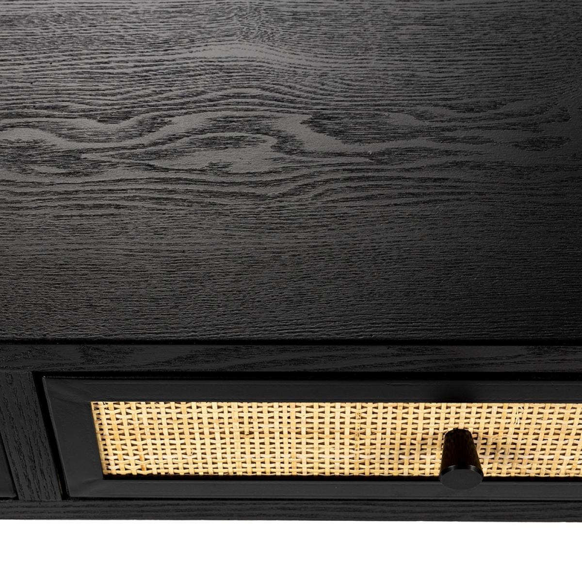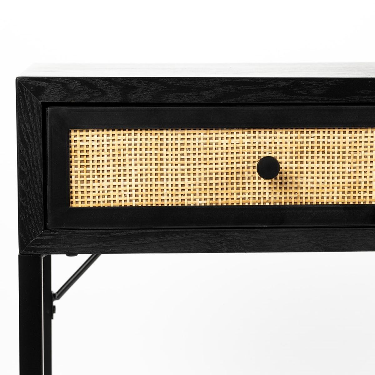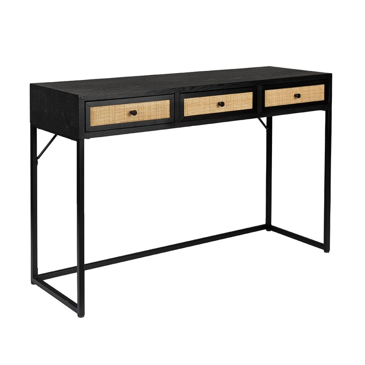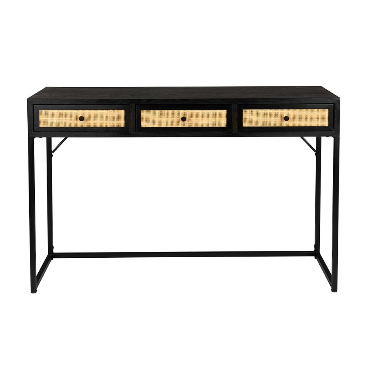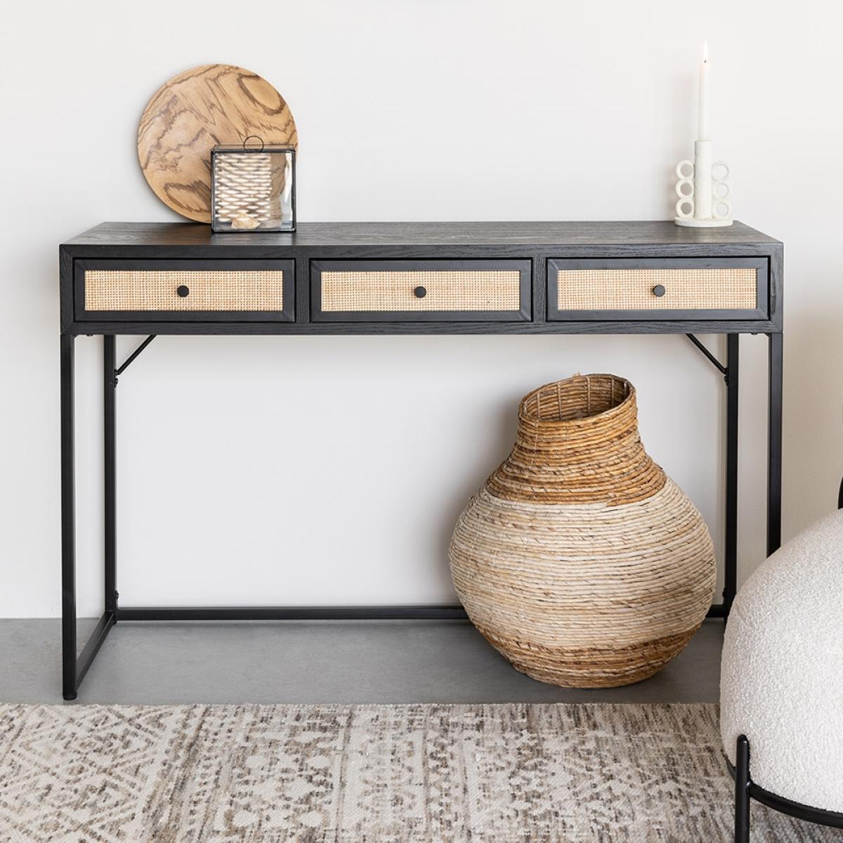 The Guuji Console Table would be a welcome addition to your home! Floating above the powder coated metal frame, the dark wooden unit makes a bold statement, without blocking light in your hallway, living room or dining room. Including 3 drawers, keep household clutter organised! Contrasting the black finish, the natural cane rattan webbing is the perfect finishing touch. Use the space below for storage baskets or shoes and adapt the Guuji design to suit your needs. Coordinating with the other designs in the collection - including wine cabinets and sideboards, you can 'Guuji' all out!.