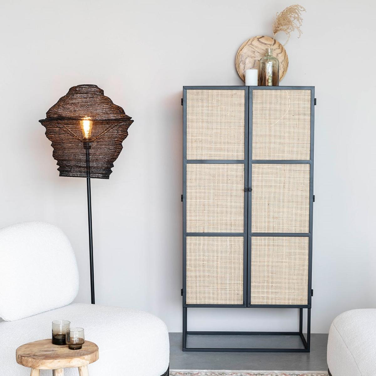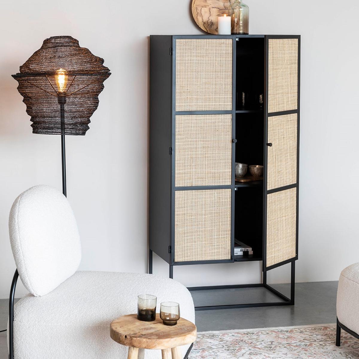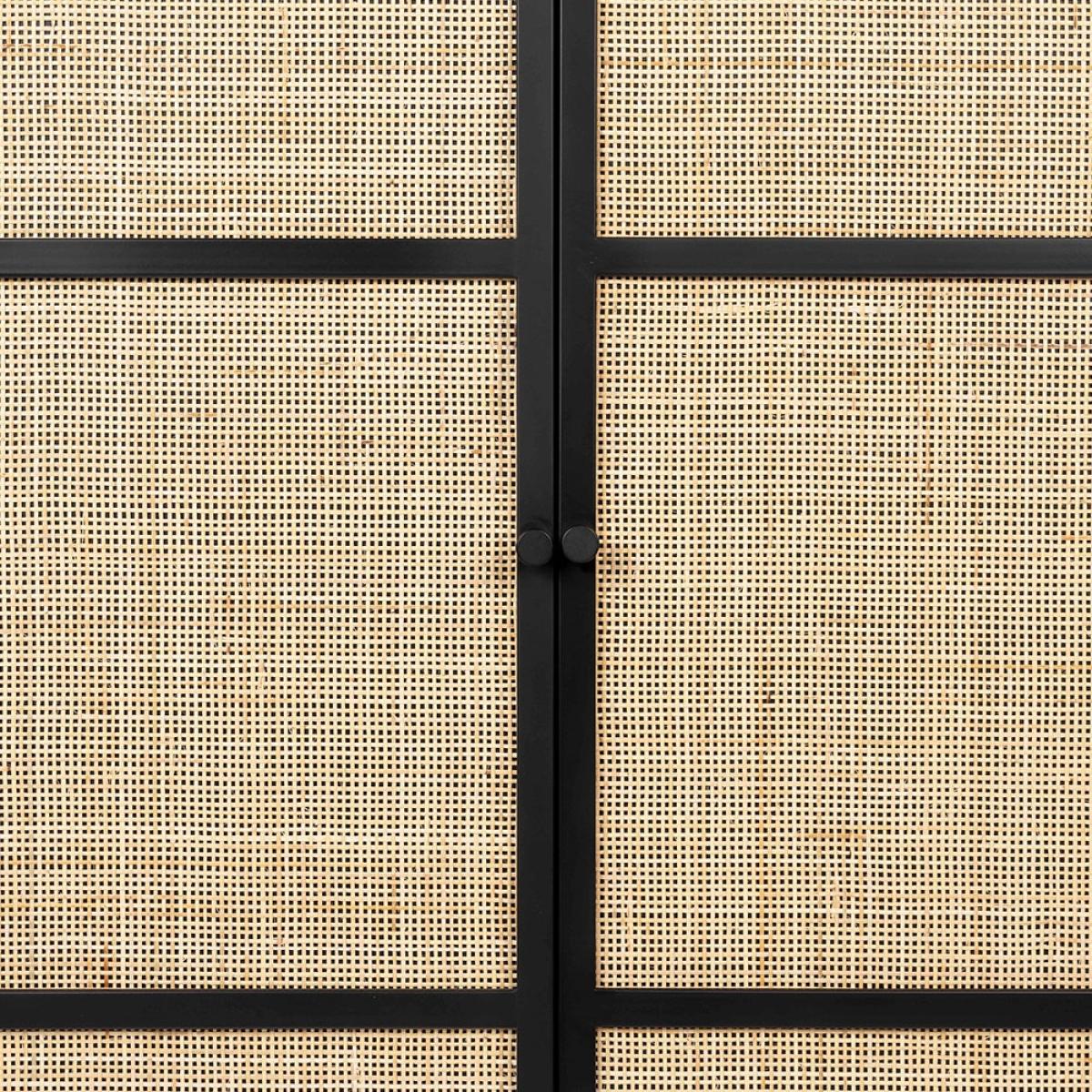 Is your home storage just not cutting it? Don't just settle for storage that'll only keep things tidy; the Guuji High 2 Door Cabinet is a joy to look at too! Behind the natural cane rattan doors, both with magnetic catches, three shelved compartments await your belongings! Organise books in the living room, clothing in the bedroom, dinnerware in the kitchen or toiletries in the bathroom. Wherever you decide to use yours, the Guuji cabinet will standout for all the right reasons. Finished in a bold black, the stylish wooden body floats above contemporary metal legs - this clever feature makes floors look bigger and keeps interiors light and airy. Pair with the coordinating Guuji cabinets from the collection and create a modern modular storage wall in your chosen space.