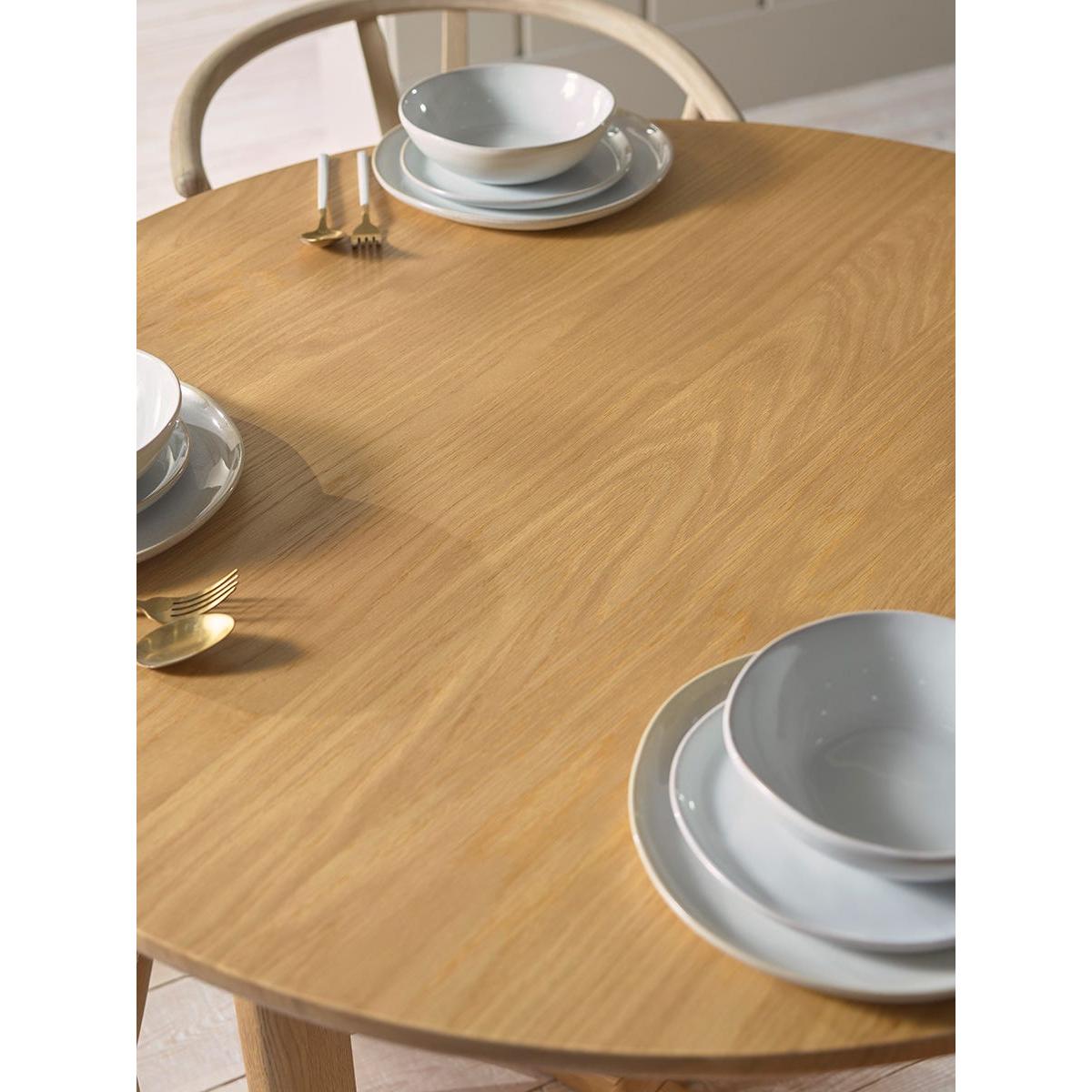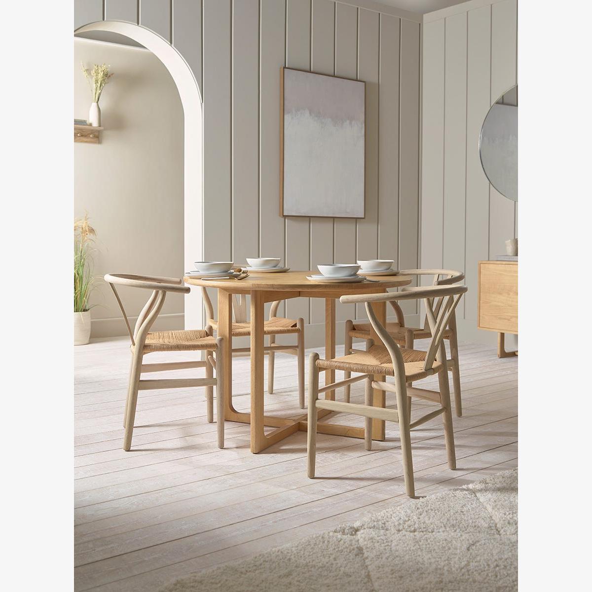 I’m a fan of this round table for its clean, pared-back silhouette and natural oak finish - it brings warmth without dominating a room. Its compact size makes it ideal for kitchen nooks or smaller dining areas, and it sits just as comfortably in Scandi-style schemes, modern coastal looks or pared-back contemporary spaces. Keep styling simple: a low-profile vase or bowl in the centre, paired with woven placemats and mixed-material chairs to add texture. If you want to dress things up, layer a neutral runner and add a cluster of taper candles for subtle ambience.
