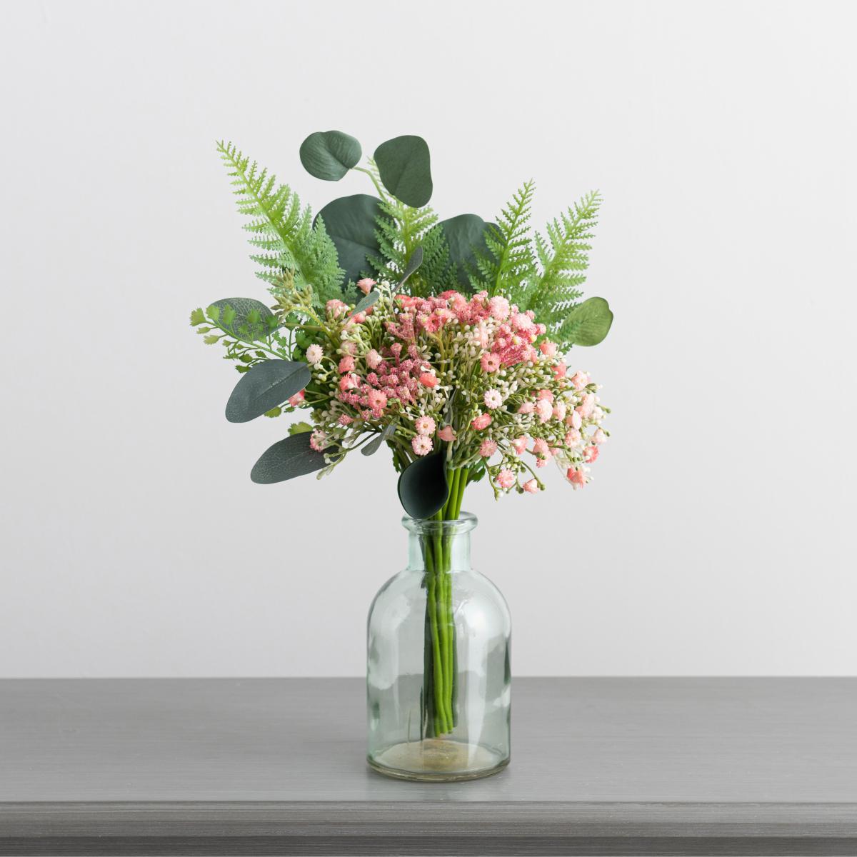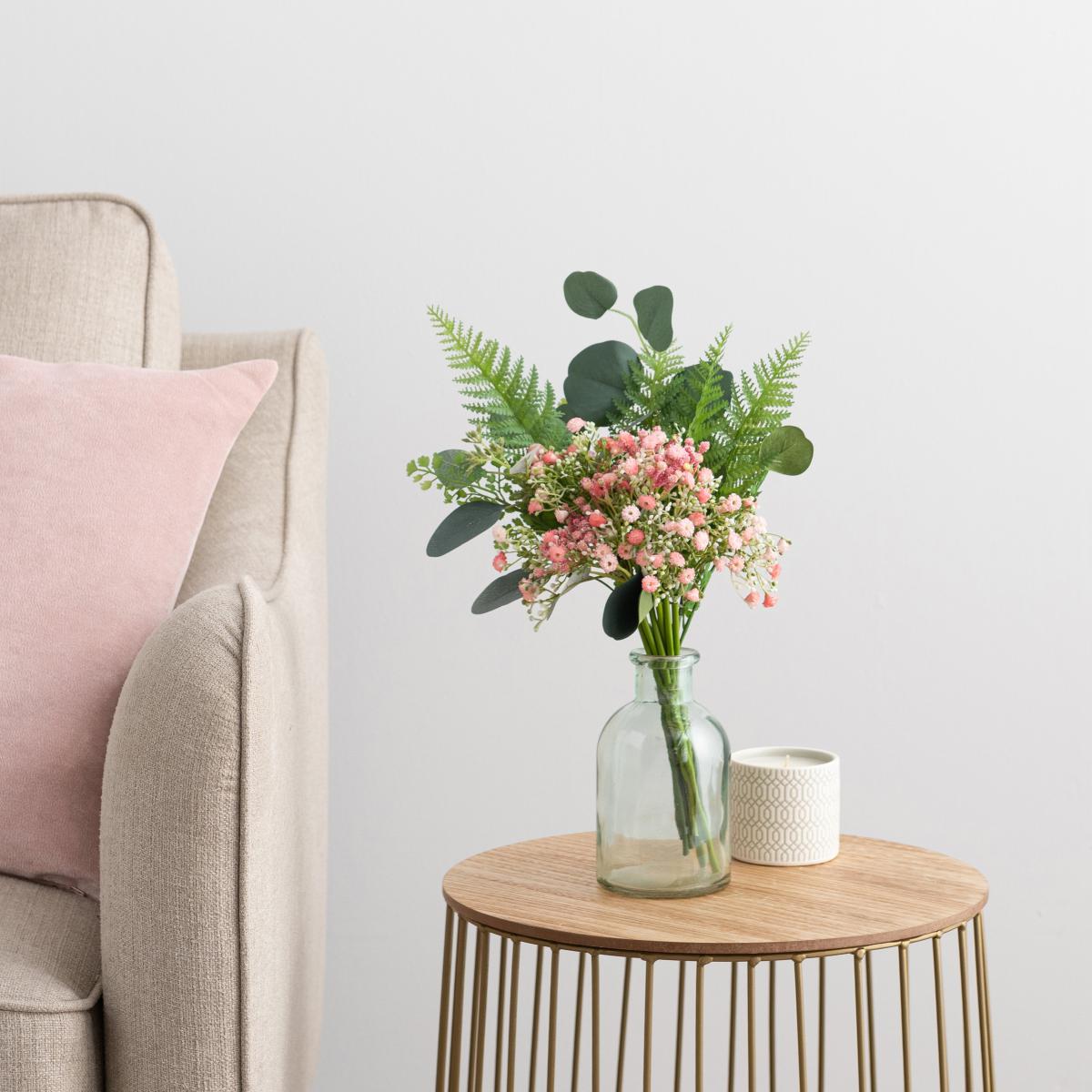 The fake gypsophila and foliage bunch is a versatile choice that adds softness and colour without the upkeep of real flowers. I love how it instantly lifts a neutral or pared-back interior, making it perfect for modern living rooms, bedrooms, or even workspaces. It works well styled in a clear or coloured glass vase on side tables, shelves, or mantels. For practical styling tips, try grouping it with other faux greens or coordinating flower arrangements for a curated look, or keep it simple for a fresh, minimalist feel. Its pink hue adds a gentle pop of colour that can brighten up a monochrome scheme or complement blush and pastel accents beautifully.