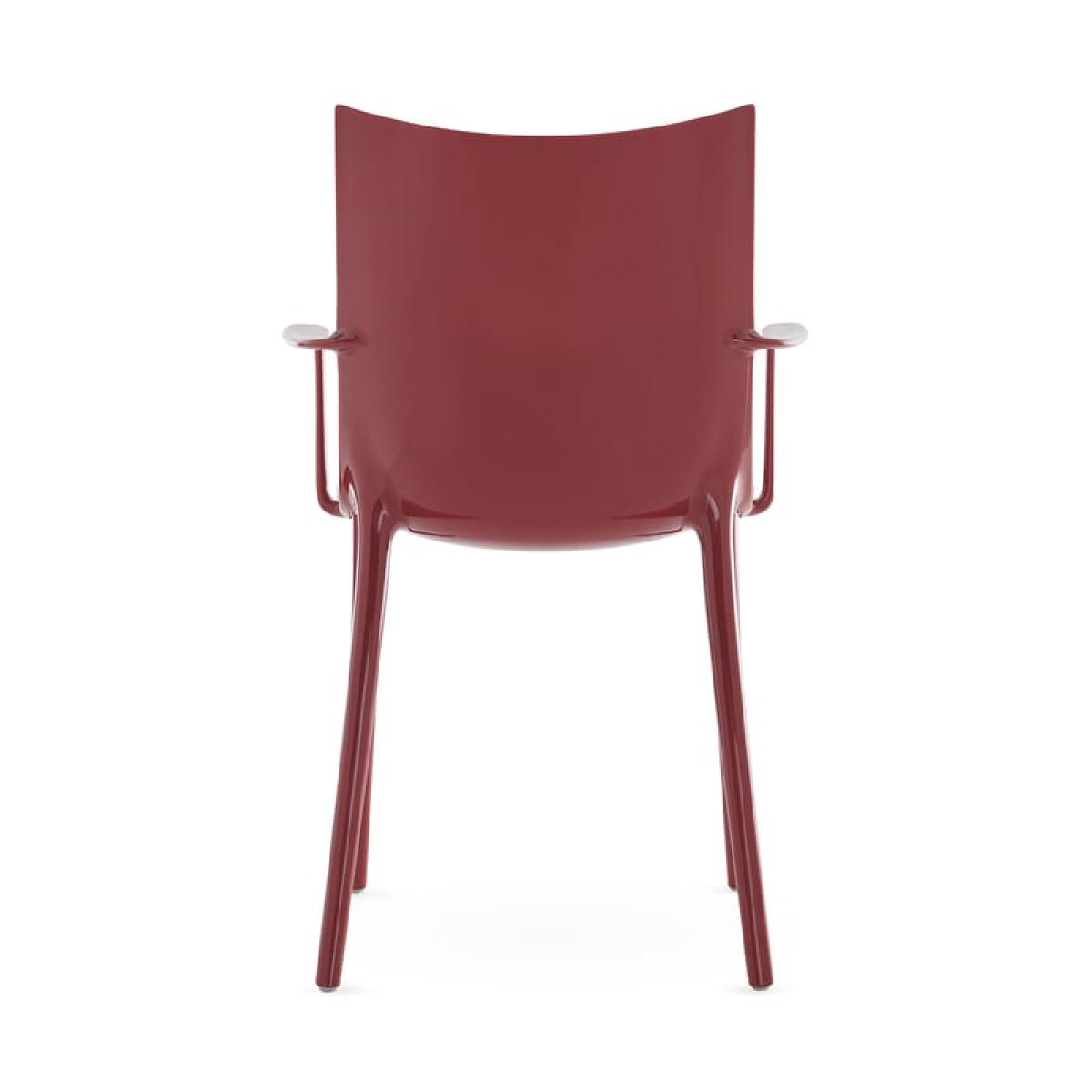 H.H.H.(Her Highest Highness) , ''Sa Majesté la chaise'', embodies the object that permeates our daily lives, implicitly telling our story. Philippe Starck takes us to new heights with the H.H.H. Chair. With its slender, incredibly fluid lines, the H.H.H. Chair has unrivalled elegance and graphic power. It stands out as a style icon that enchants and inspires. Philippe Starck: ''Usually, it's the human being who makes the chair, but with H.H.H. - Her Highest Highness, it's the chair that makes the woman or the man. The majestic elegance of H.H.H. compels us to strike a pose. And what would we be without the pose?" The H.H.H. Chair defines the very essence of the human being who interacts with it, forcing him or her to take a stand. Indeed, what would we be without the action of sitting, of "posing" in front of such a symbol of royalty and refinement? An object that goes beyond the simple concept of a seat, transforming every moment spent on it into a true moment of royalty. Respectful of the environment, this chair is made from 100% recycled thermoplastic technopolymer, sourced from pure storage materials uncontaminated by other materials. The choice was dictated by the possibility that technology now provides: to use a waste material that guarantees the aesthetic quality and structural criteria of the product by reducing the emissions necessary for its production. With this material, Kartell is blazing a new trail in environmental sustainability, using recycled materials while ridding the environment of waste that becomes raw material once again, thus activating a virtuous circle of circular economy. In detail: Variation : Burgundy Brand : Kartell Designer : Philippe Starck Type : Chair Colour : Burgundy (gloss finish) Material : Recycled thermoplastic technopolymer Dimensions : W 55 x D 57 cm x H 90 cm - Seat: H 47 cm - Armrests: H 66 cm Weight : 11 lb Characteristics : Made in Italy - Recycled material - Project date: 2024 - For indoor & outdoor use Show less